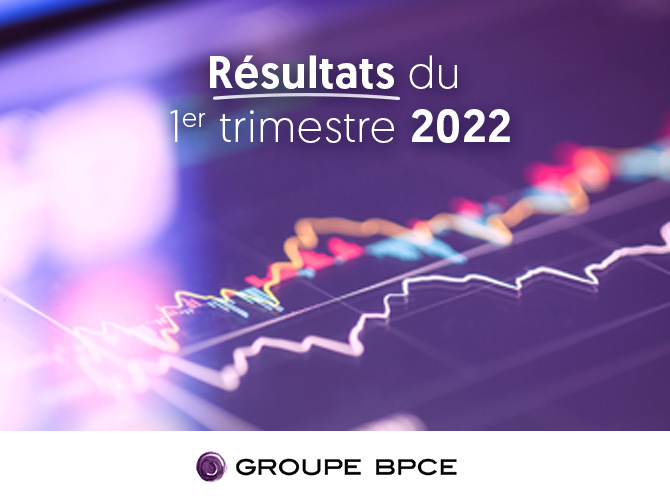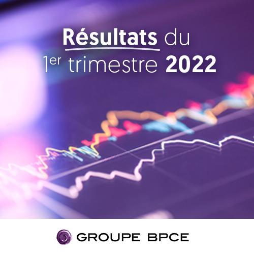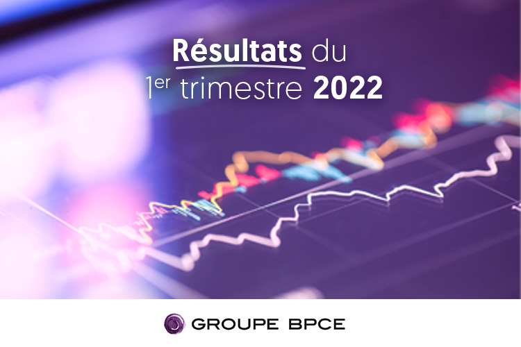 Visuel présentant les résultats du 1er trimestre 2022 du Groupe BPCE, avec des courbes financières stylisées en arrière-plan.
