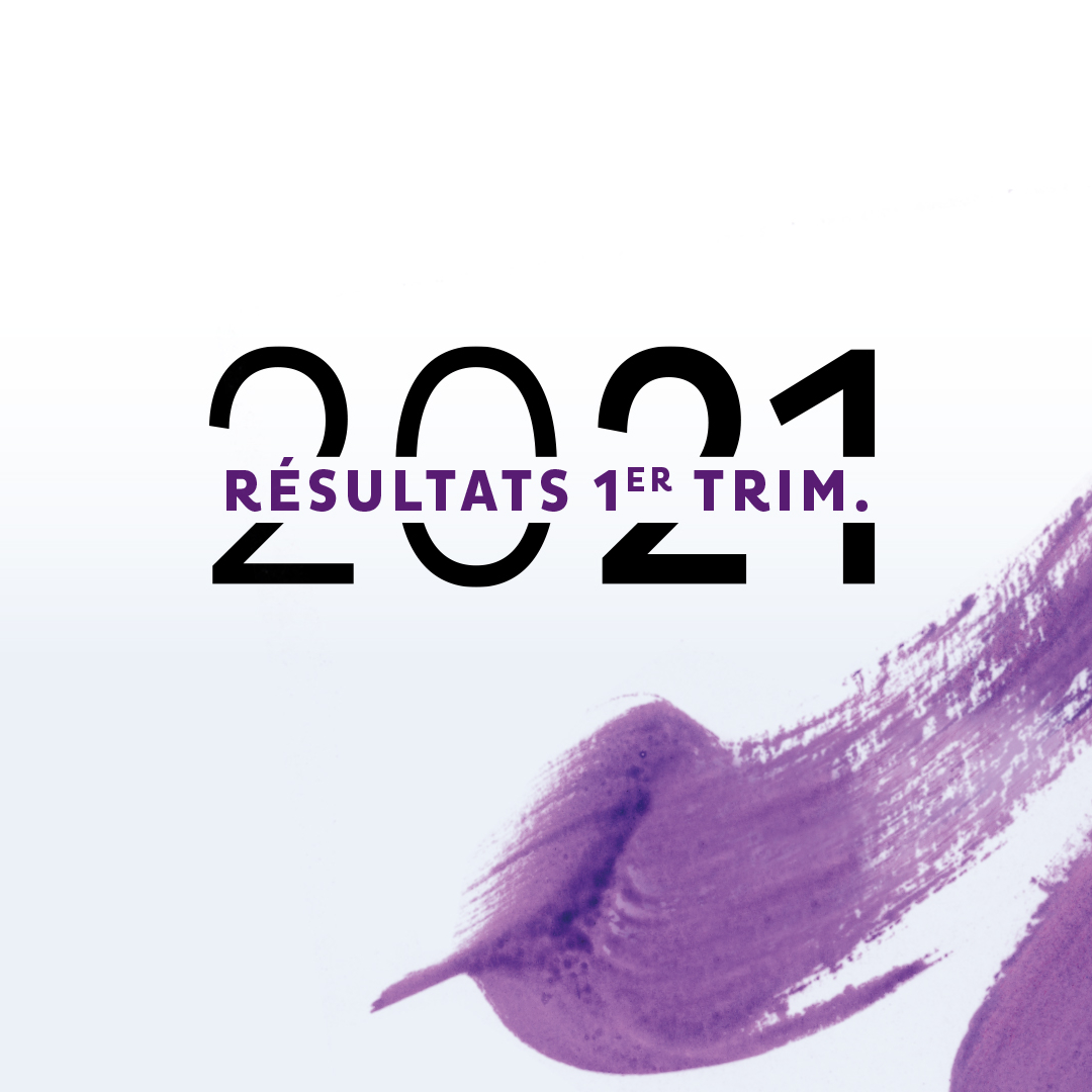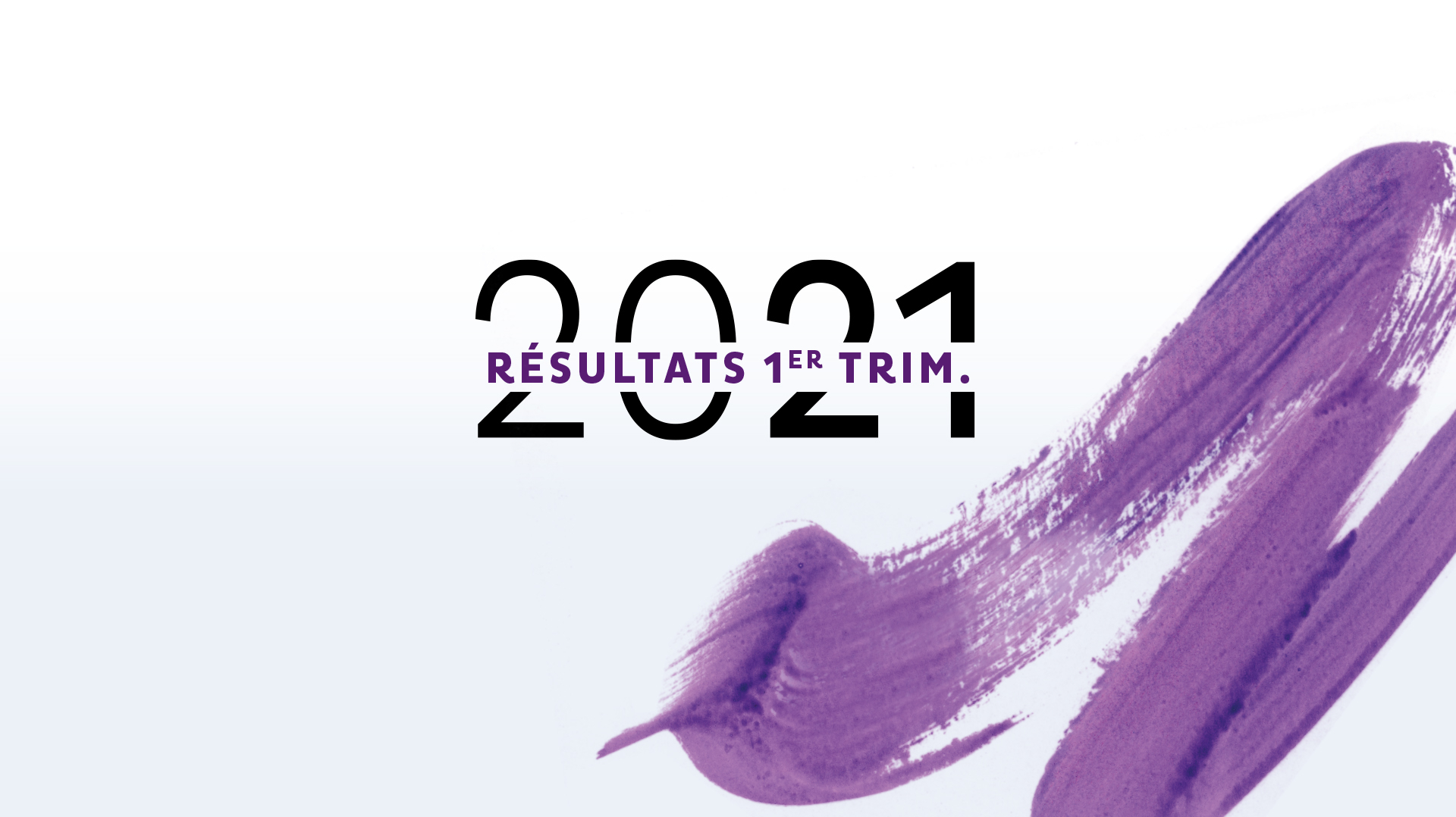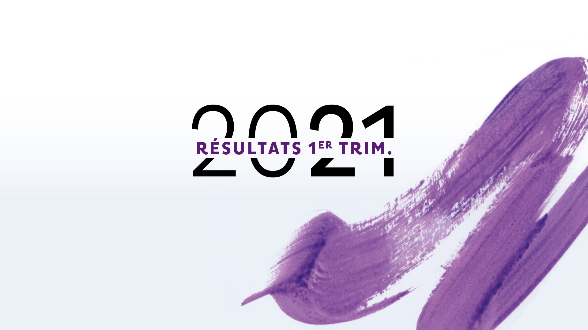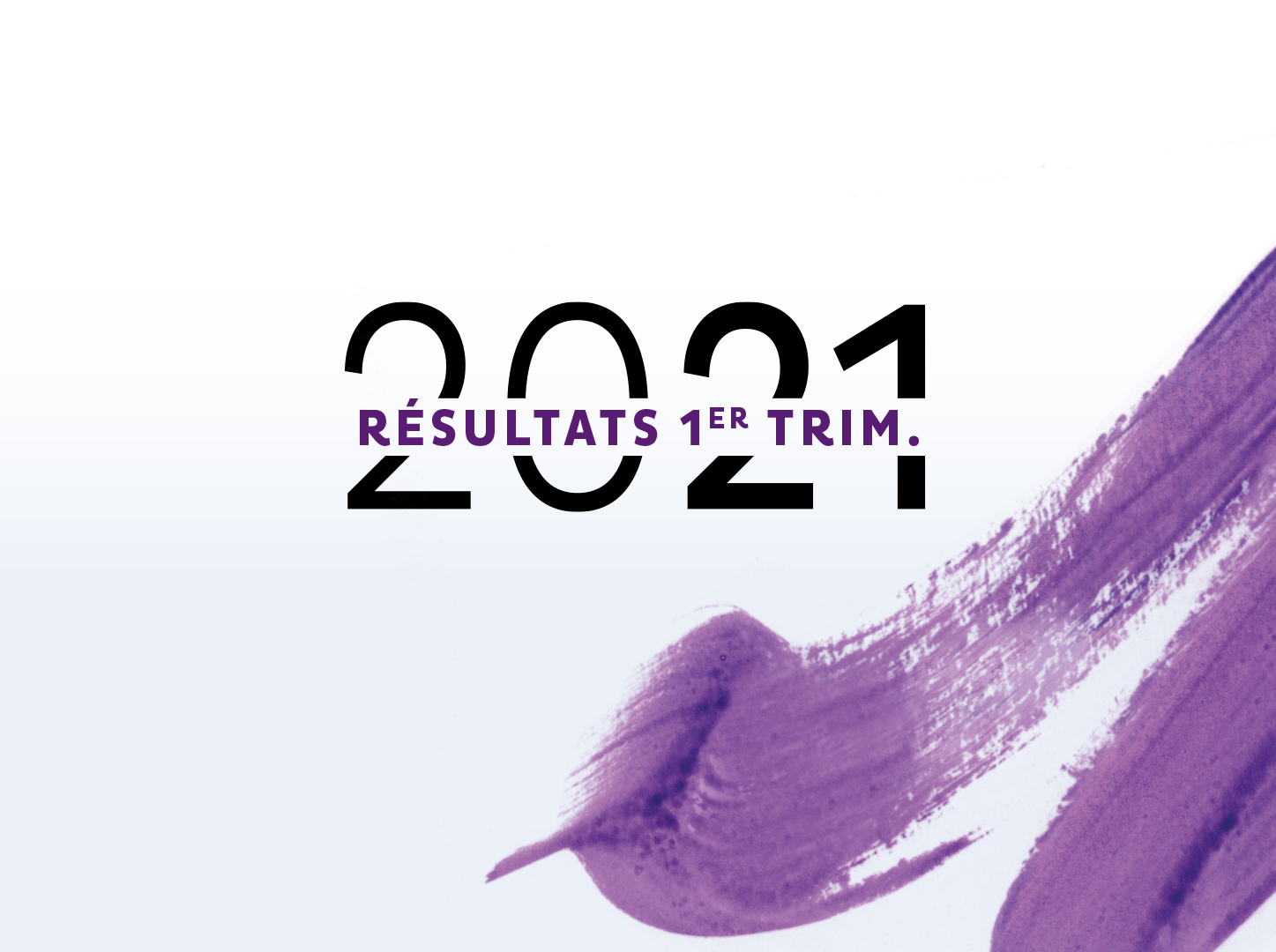 Visuel d'annonce des résultats financiers du premier trimestre 2021, avec l'inscription 'Résultats 1er Trim.' et un motif de coup de pinceau violet en fond.