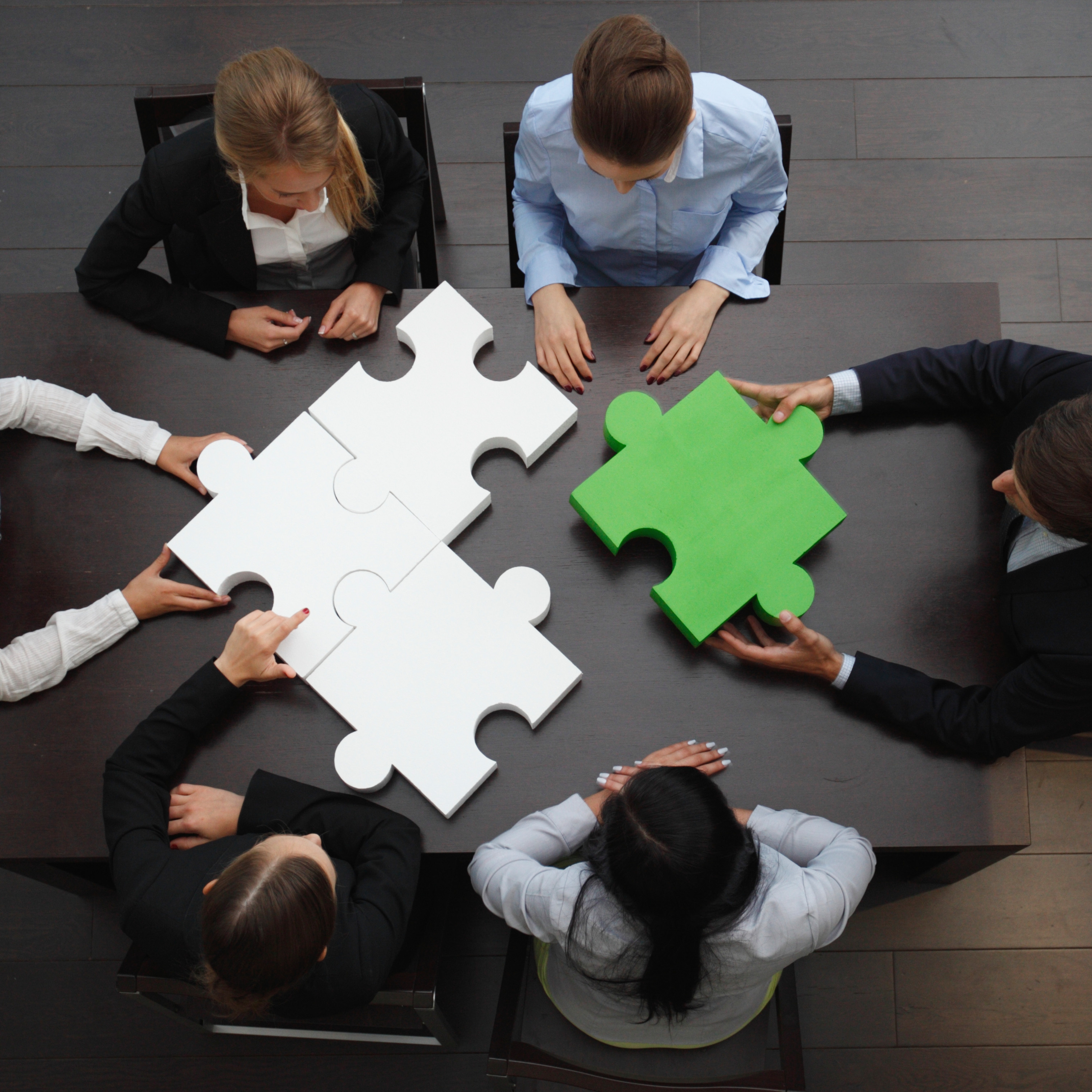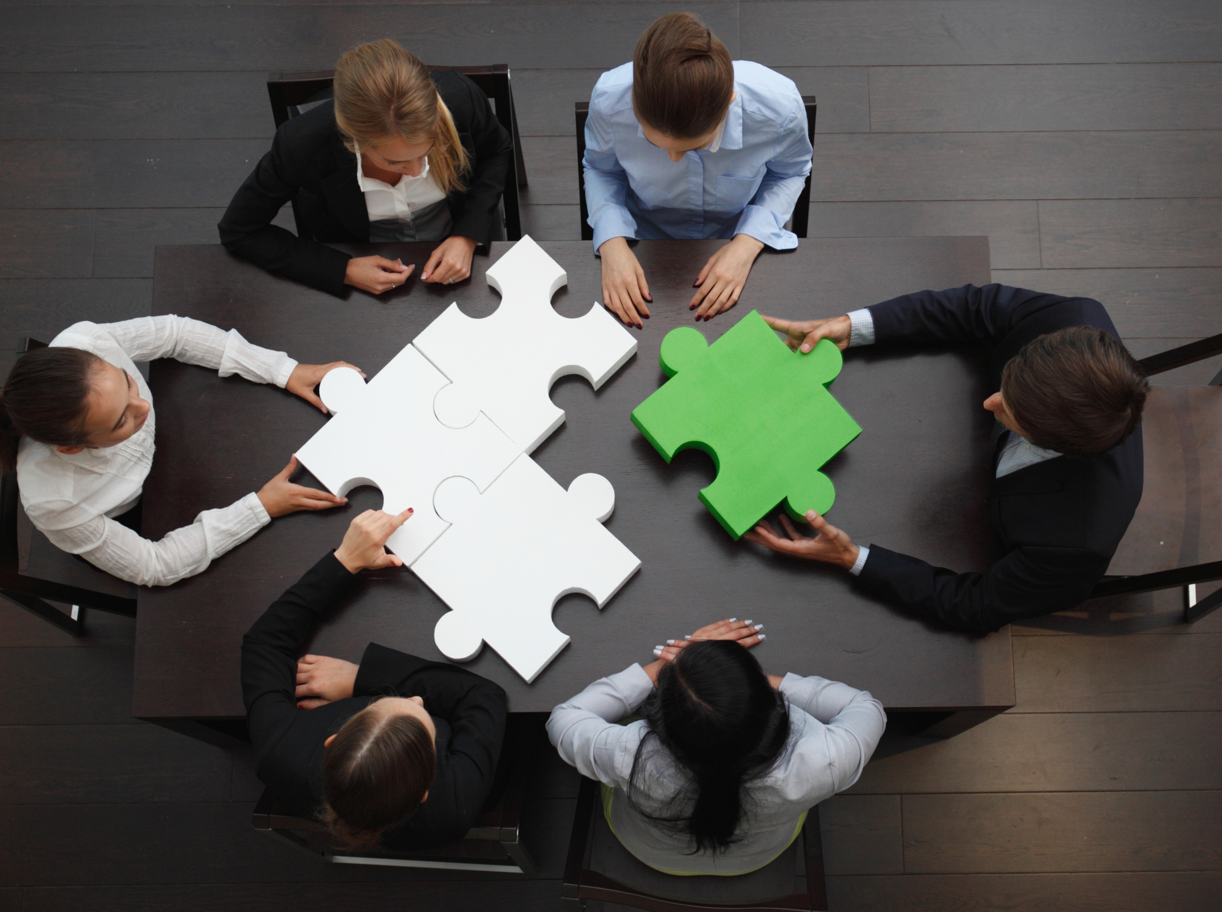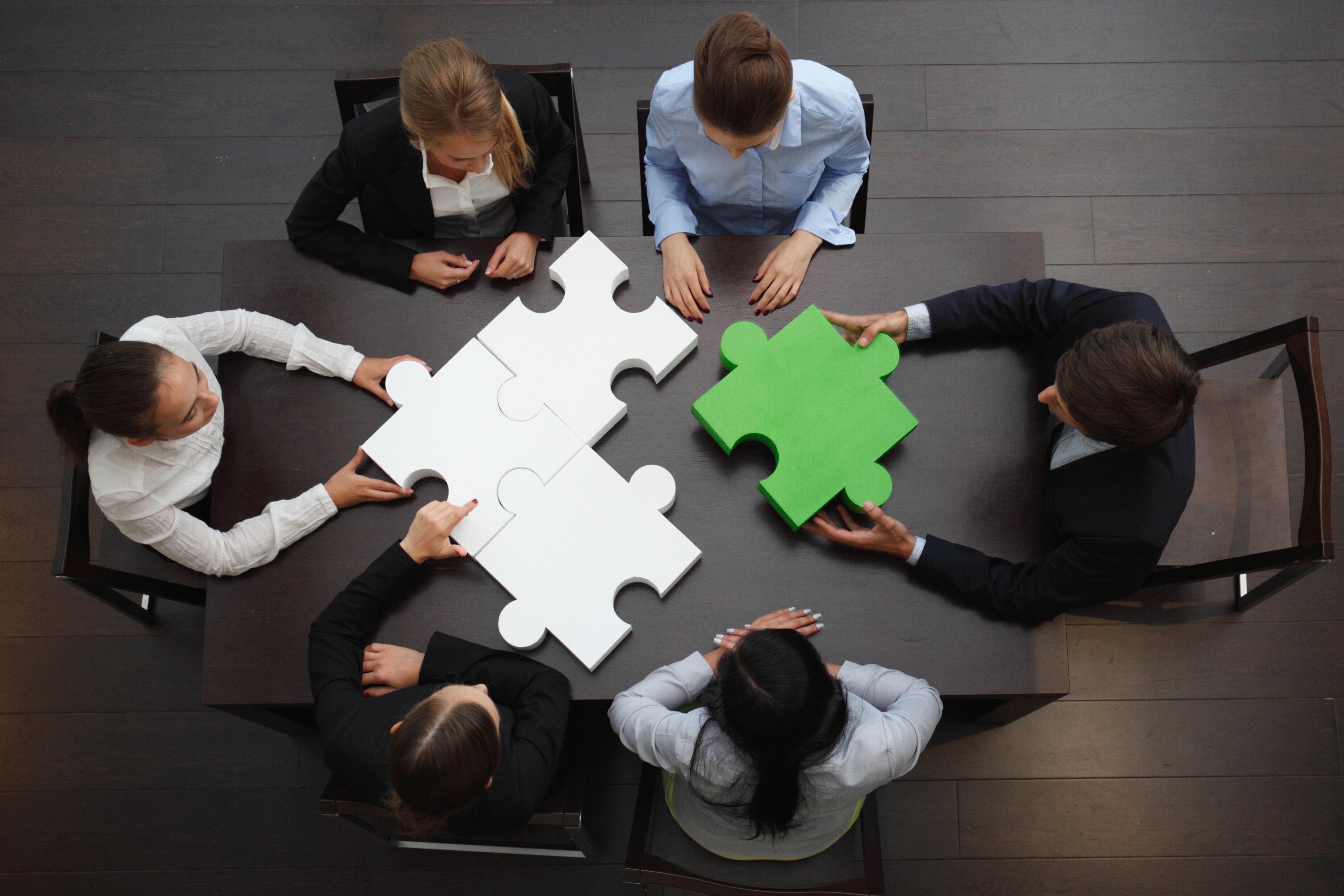 Des collaborateurs en réunion autour d'une table assemblent des pièces de puzzle géantes blanches et vertes, symbolisant la collaboration et la construction collective en entreprise.