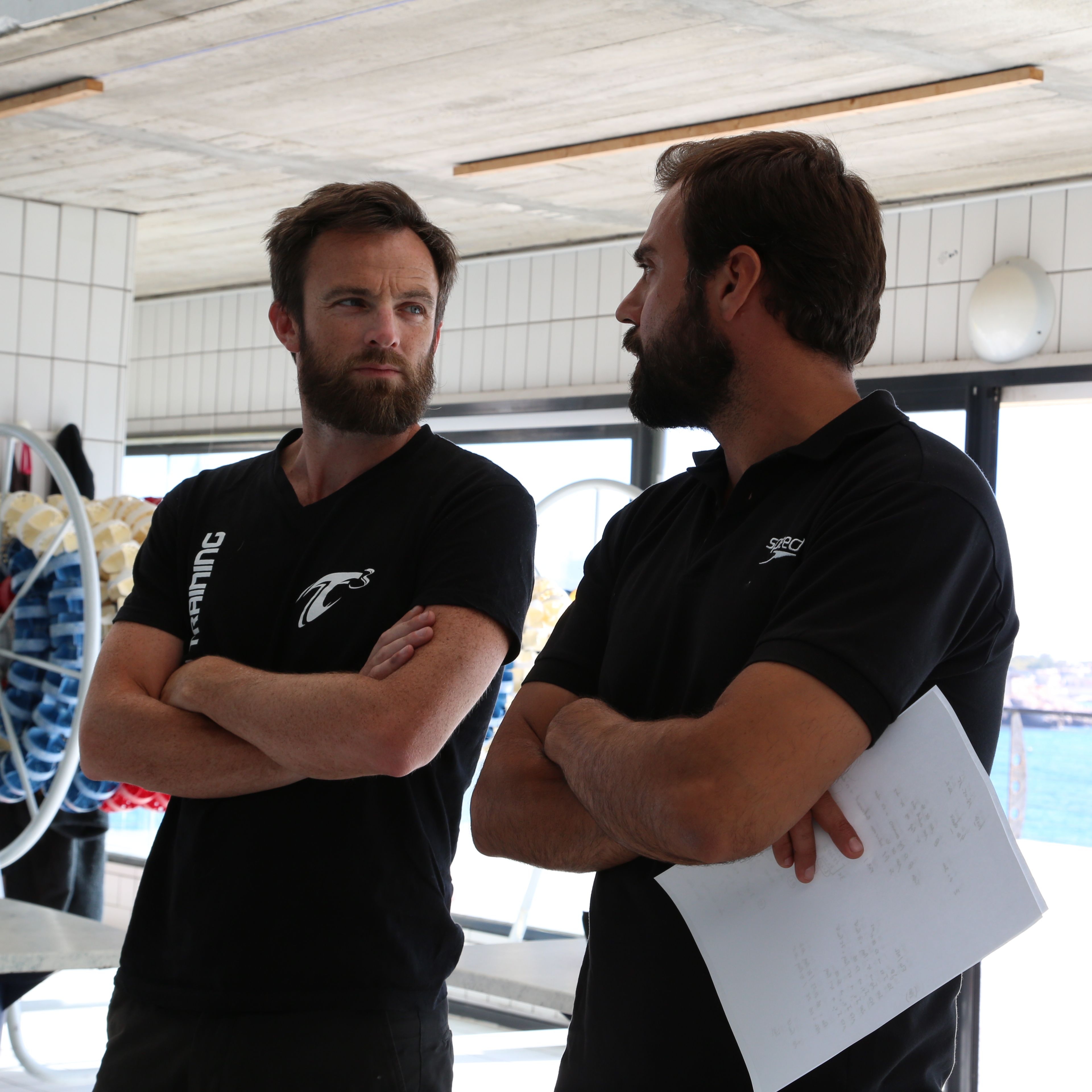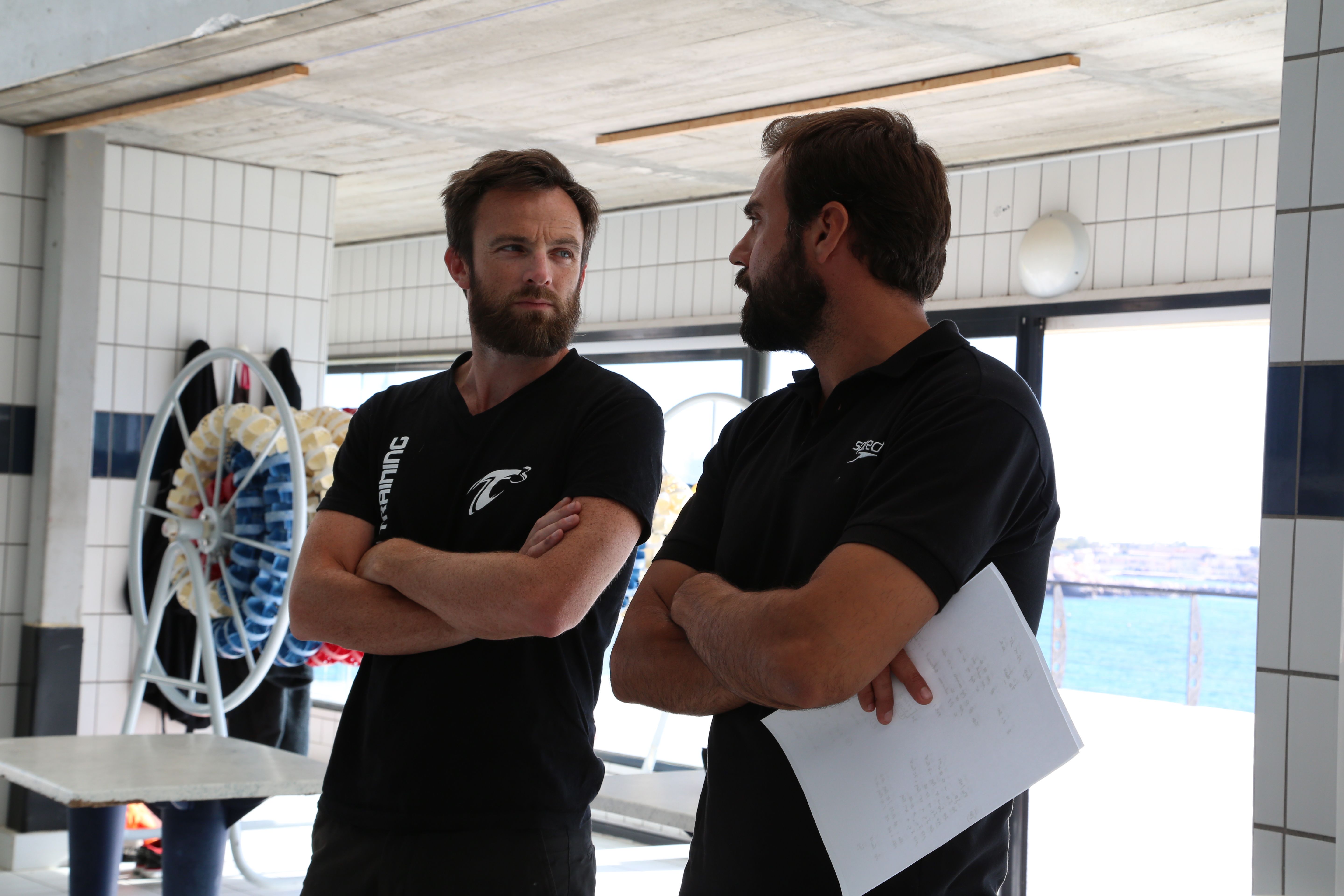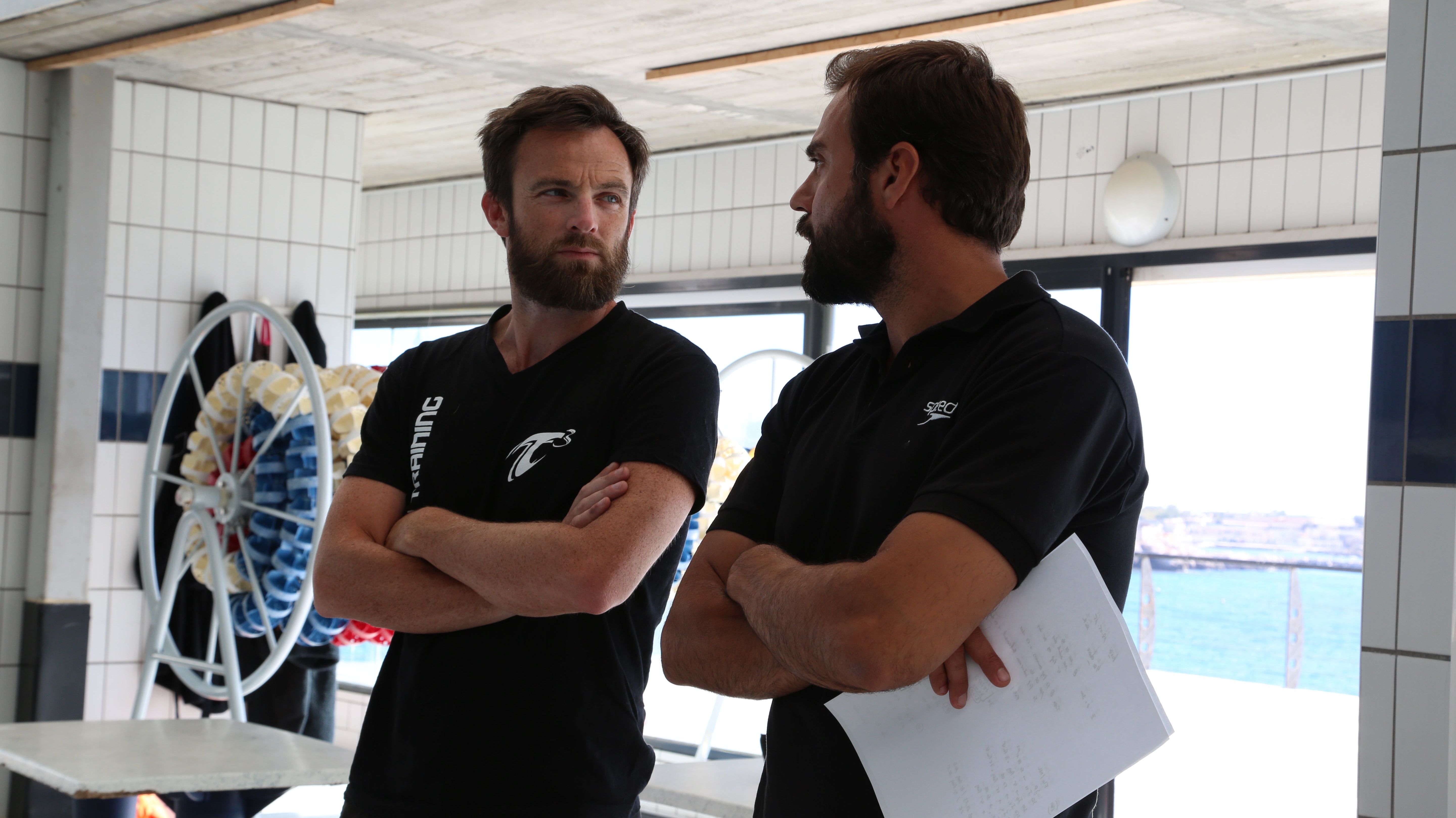 Deux entraîneurs de natation échangent au bord d'une piscine intérieure, en préparation des sélections olympiques, mettant en lumière l'enjeu et la tension liés à la qualification pour les Jeux Olympiques.