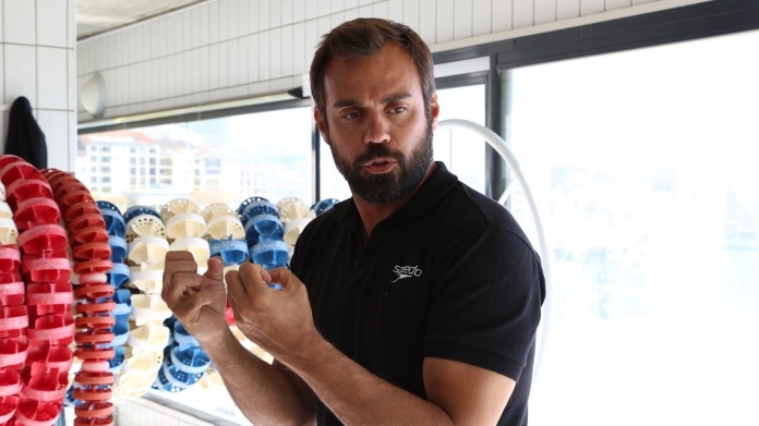 Portrait de Romain Barnier, entraîneur de natation, donnant des explications au bord d'une piscine en intérieur à Marseille.