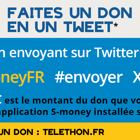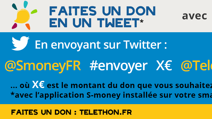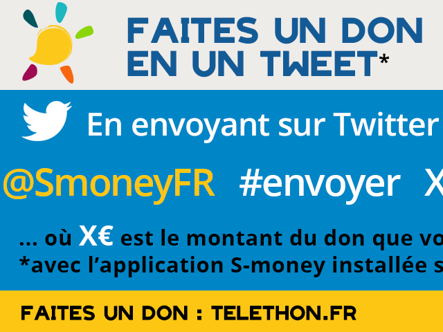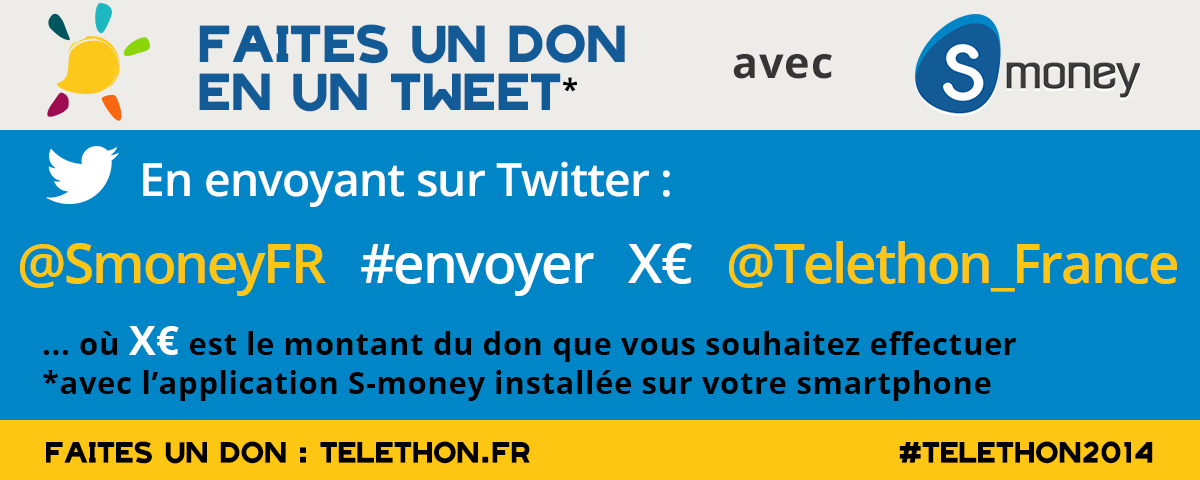 Visuel explicatif pour faire un don au Téléthon 2014 via Twitter grâce à l’application S-money, en envoyant un tweet spécifique.