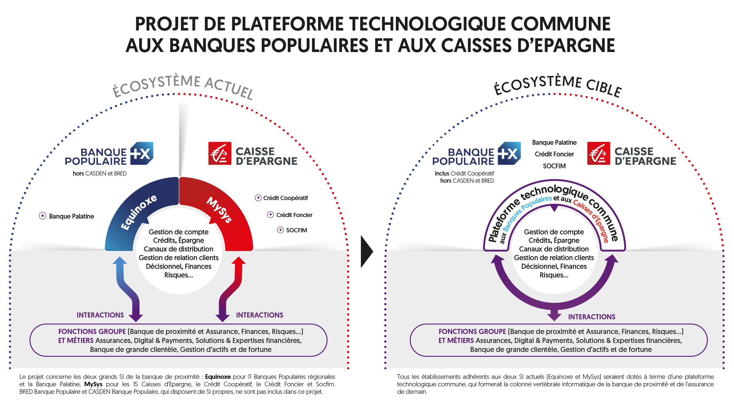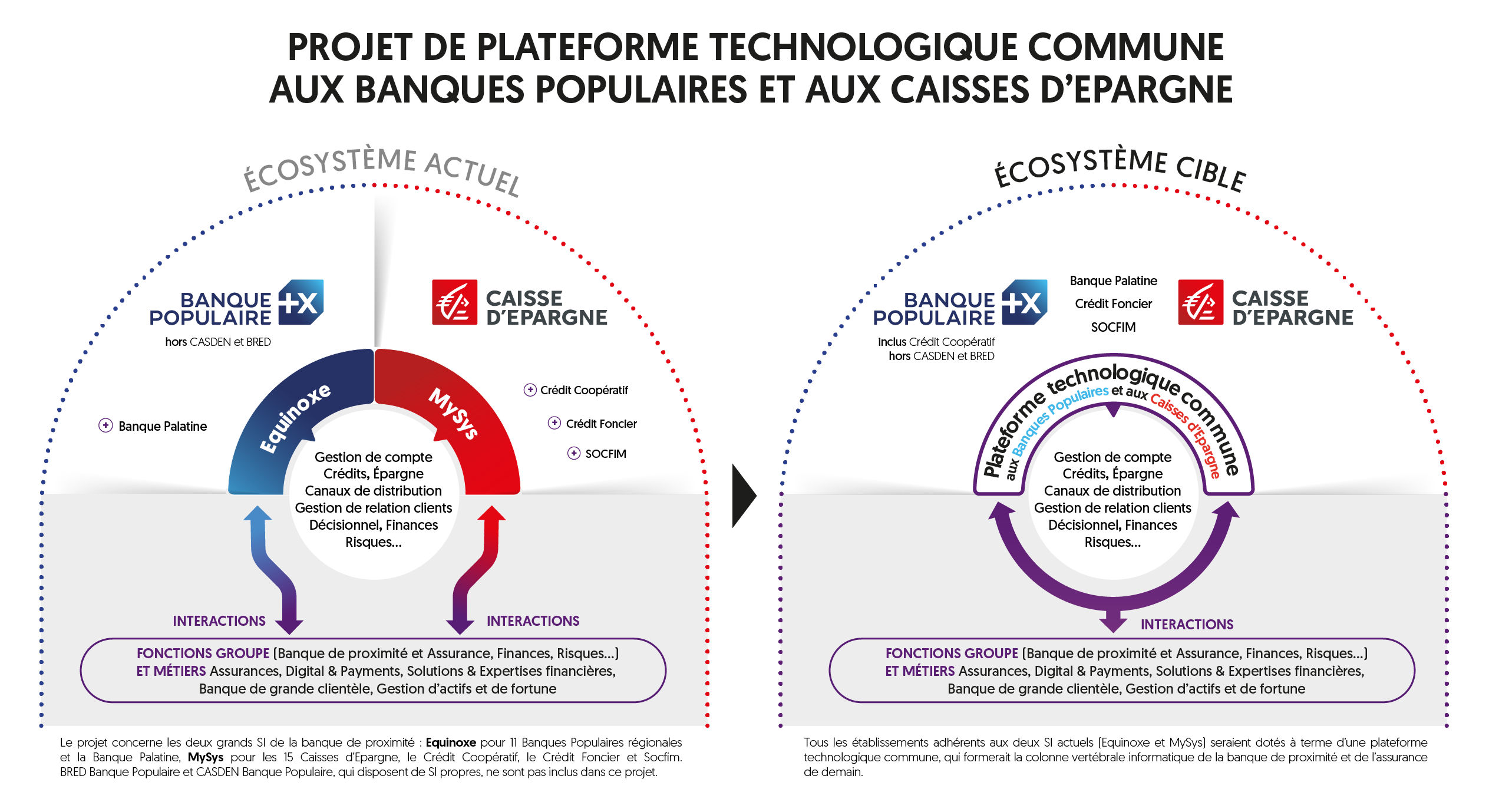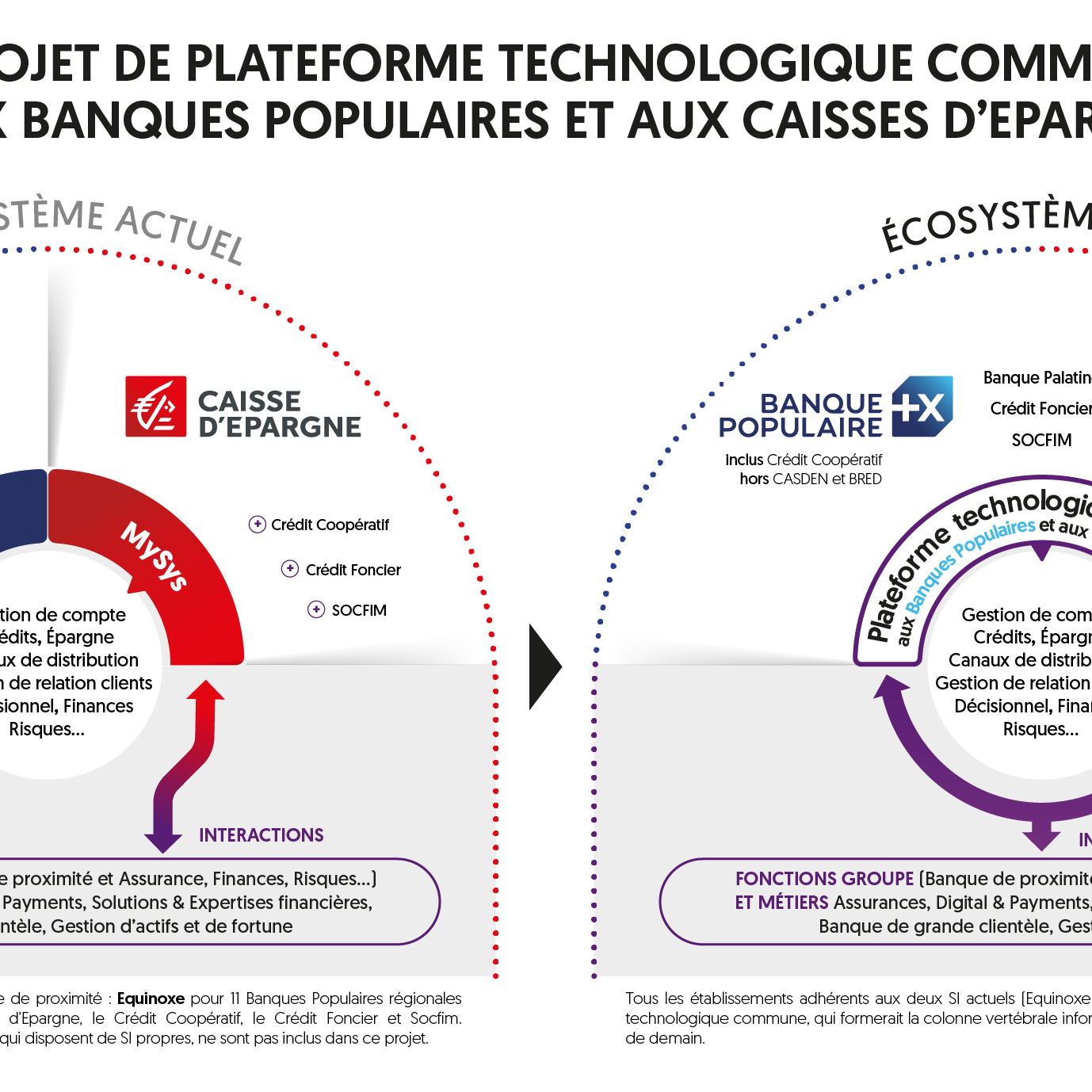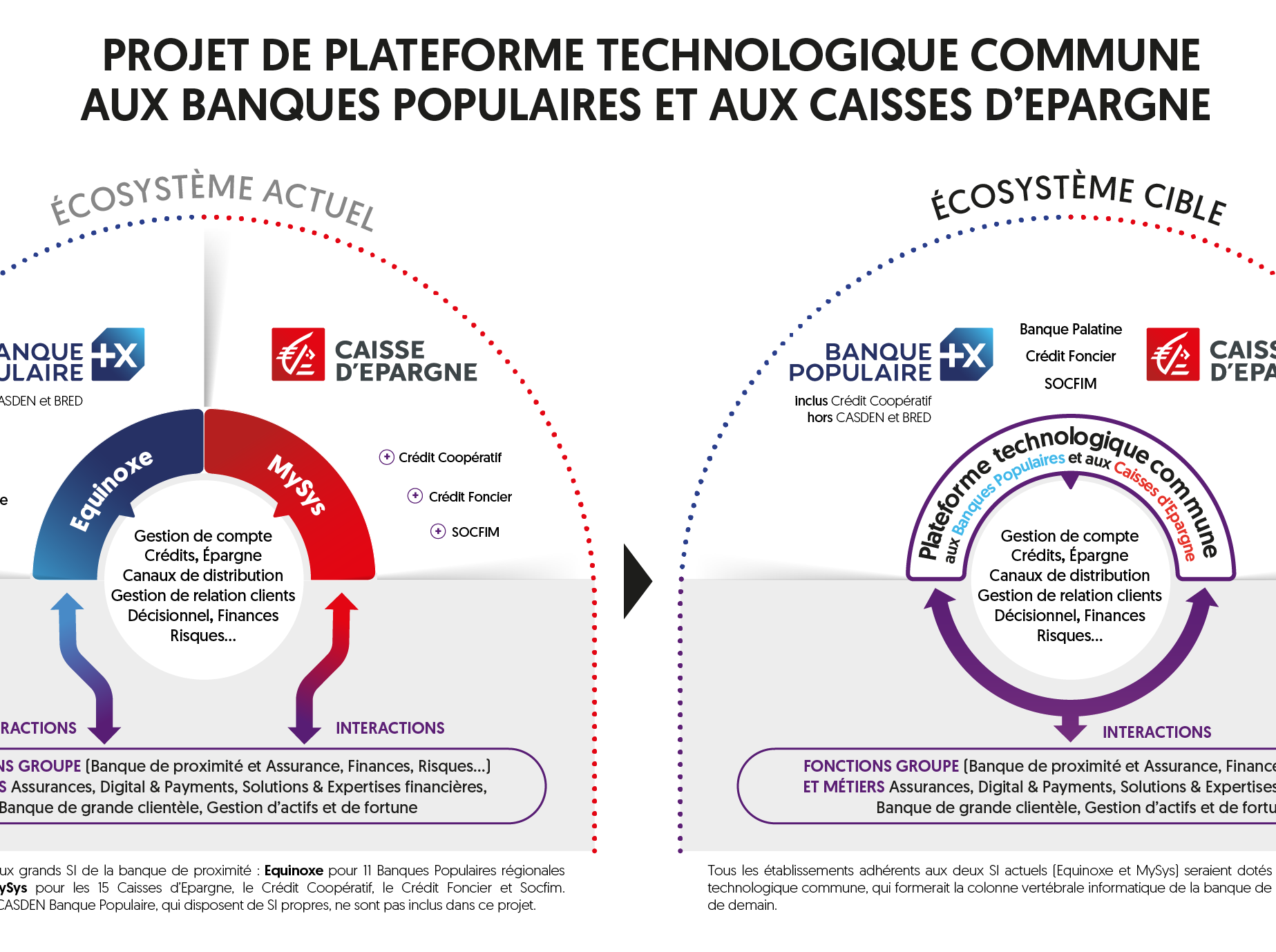 Schéma illustrant le passage d’un double système d’information Equinoxe/MySys à une plateforme technologique commune pour les Banques Populaires et Caisses d’Epargne dans le cadre de la transformation digitale du Groupe BPCE.