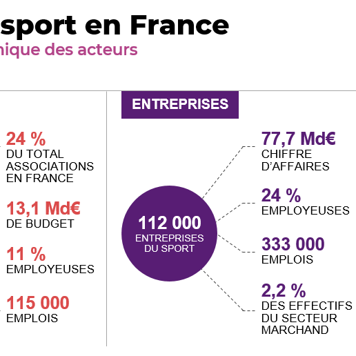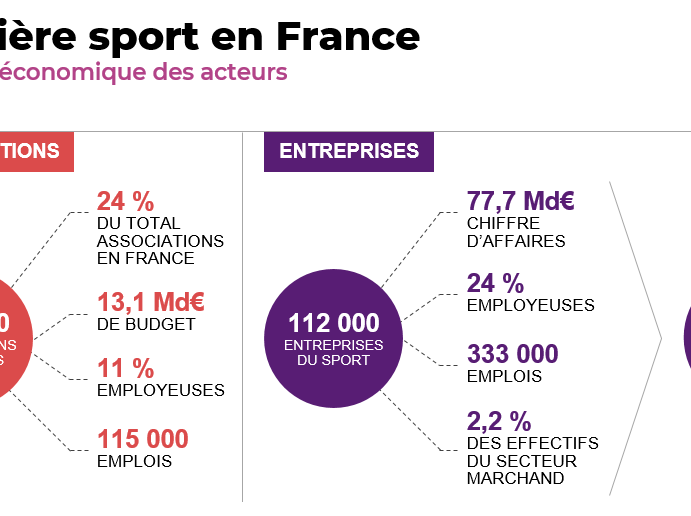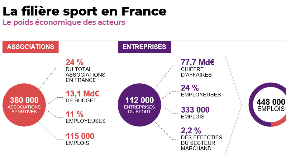 Infographie présentant le poids économique de la filière sport en France, avec chiffres sur associations, entreprises et emplois du secteur.