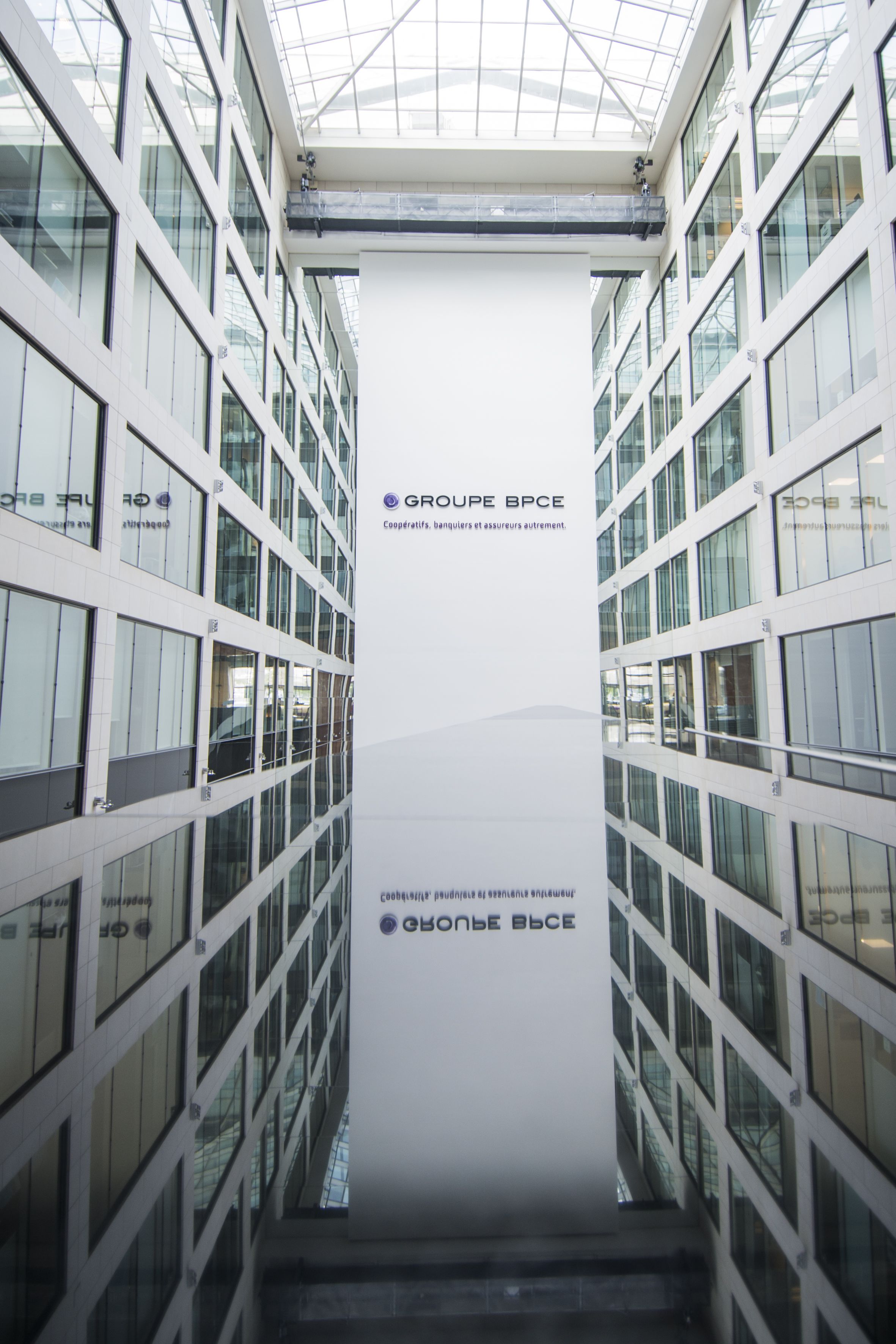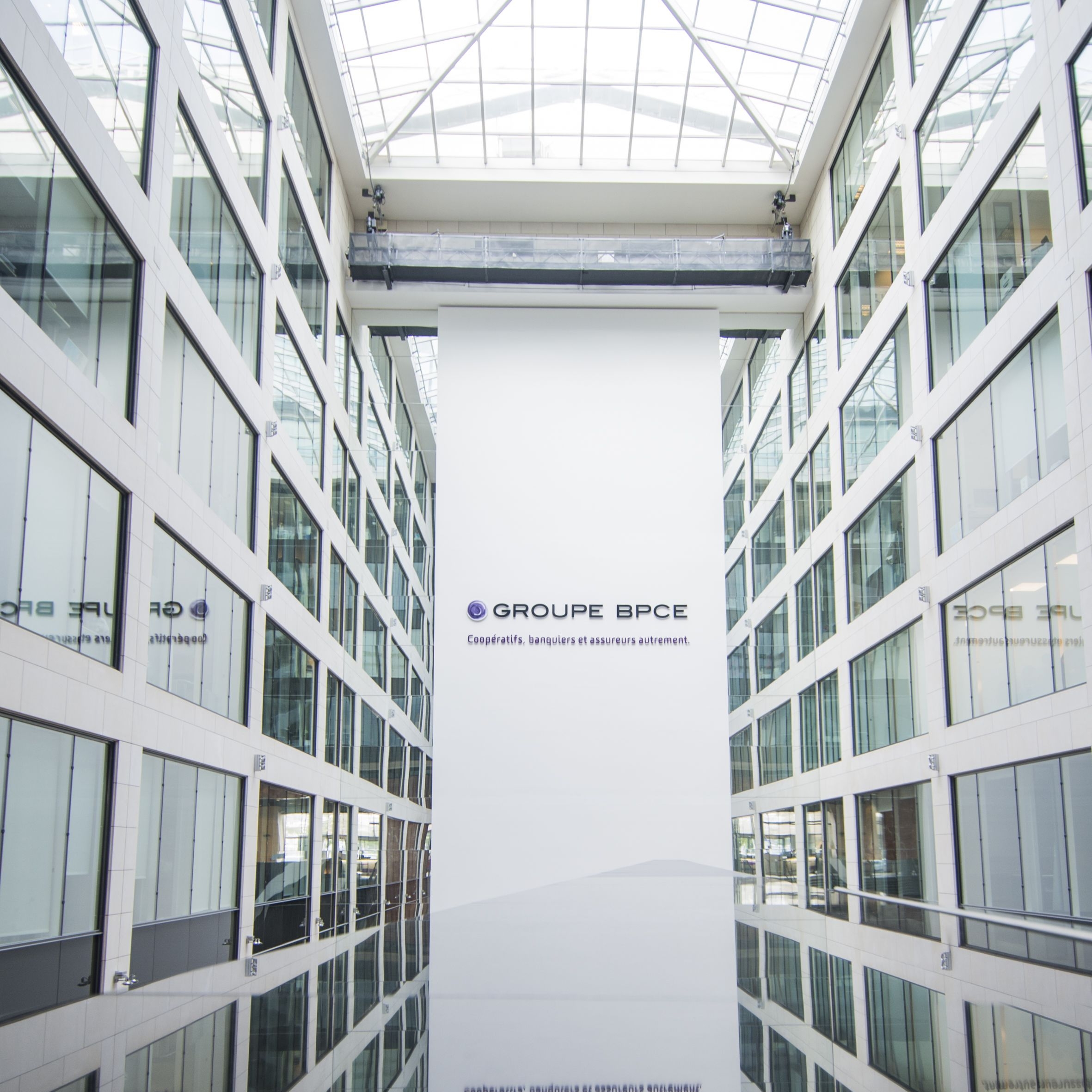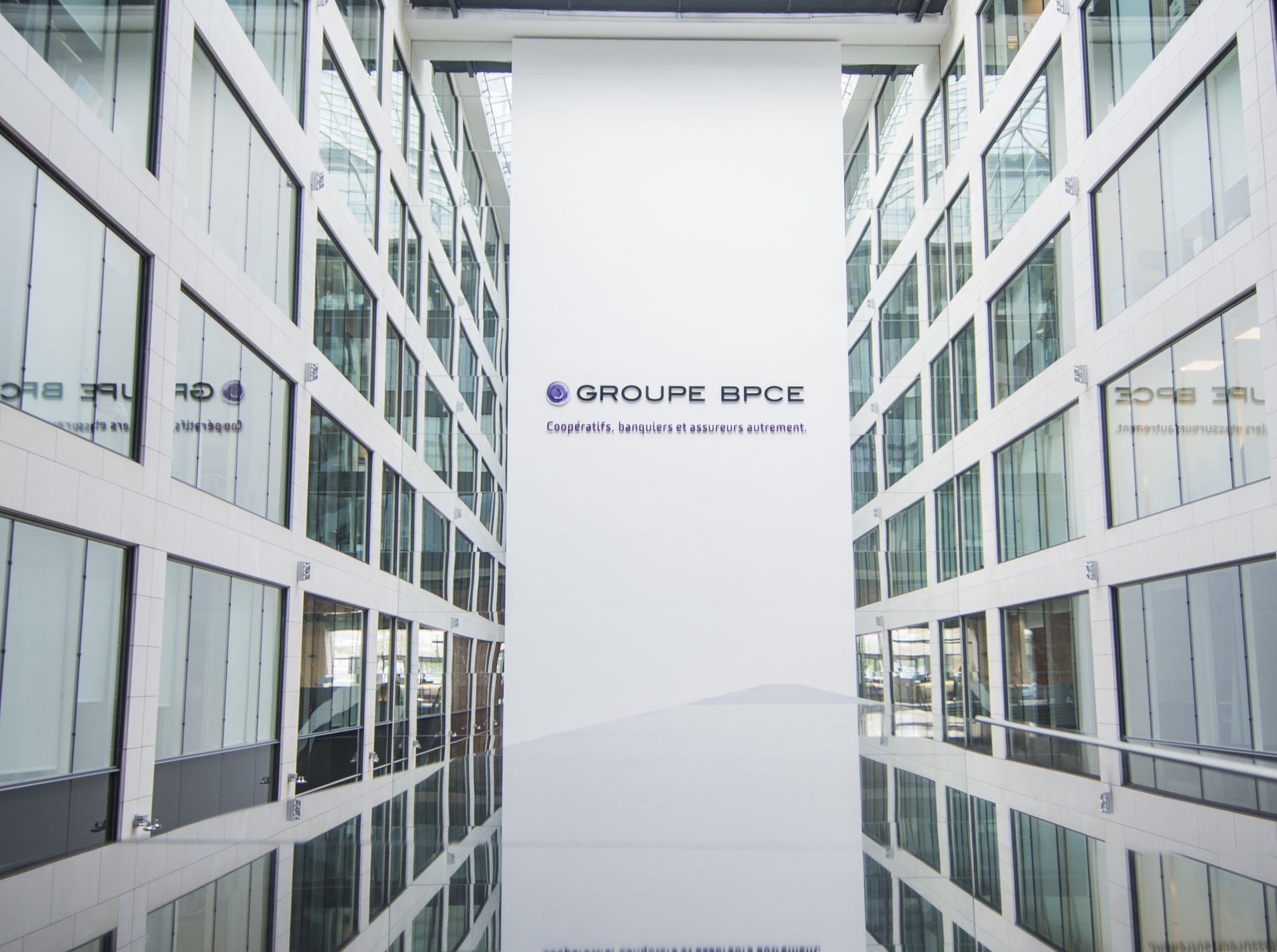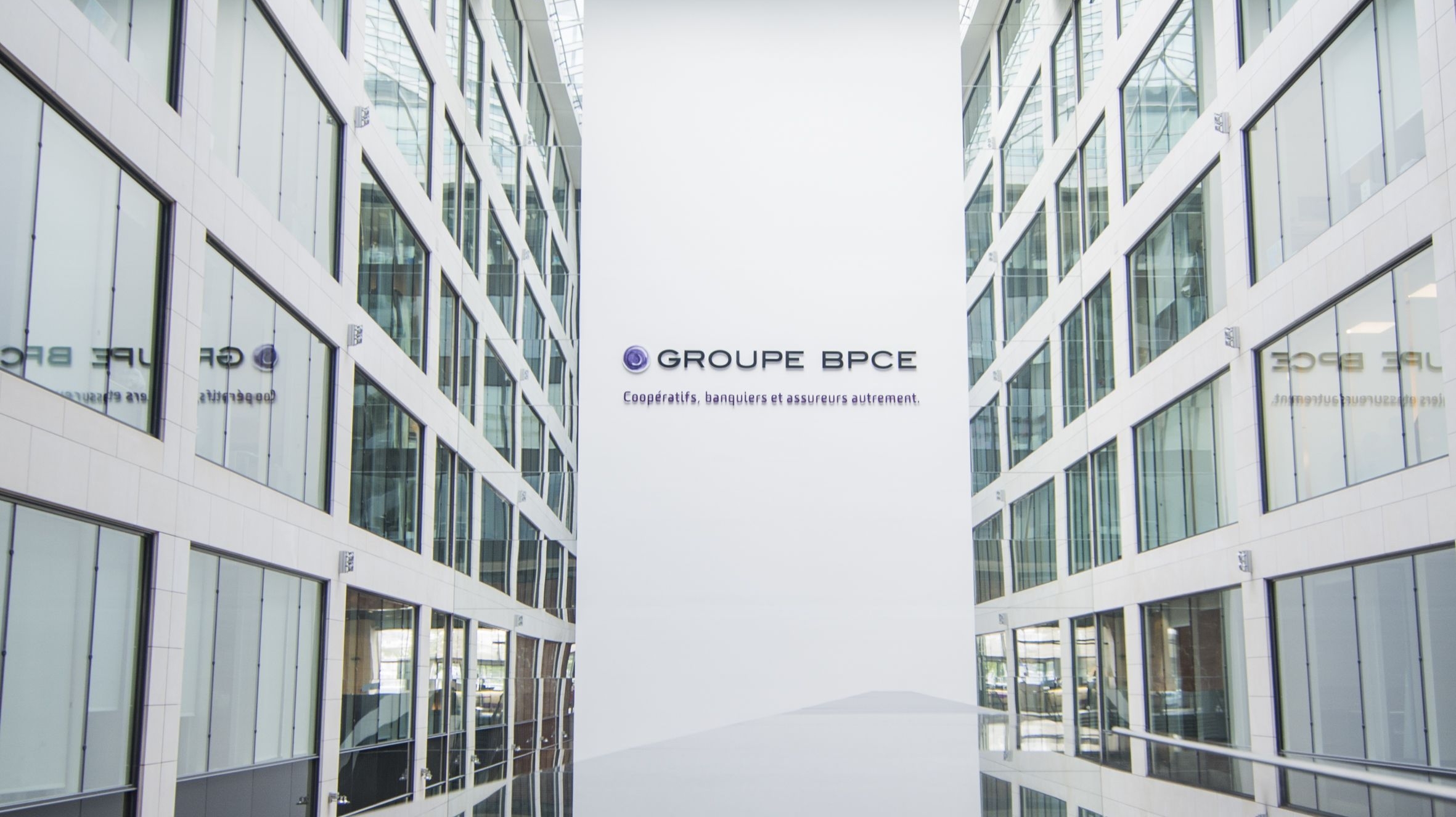 Hall intérieur du siège de Groupe BPCE à Paris, avec le logo et la signature « Coopératifs, banquiers et assureurs autrement ».