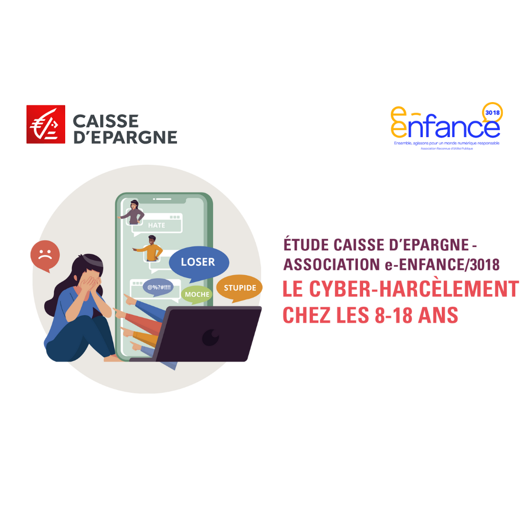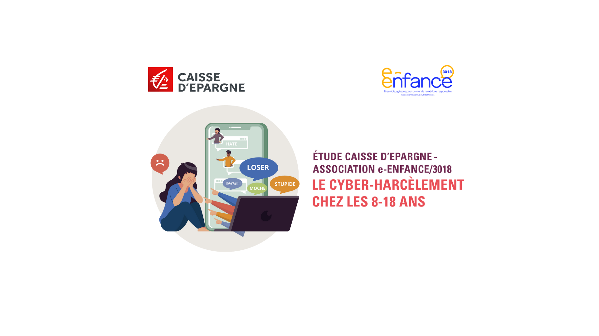 Illustration d'une jeune fille victime de cyberharcèlement devant un ordinateur, avec logos de la Caisse d'Epargne et de l'Association e-Enfance, et le titre de l'étude sur le cyberharcèlement chez les 8-18 ans.