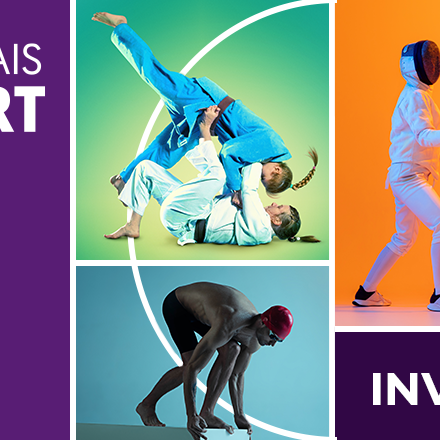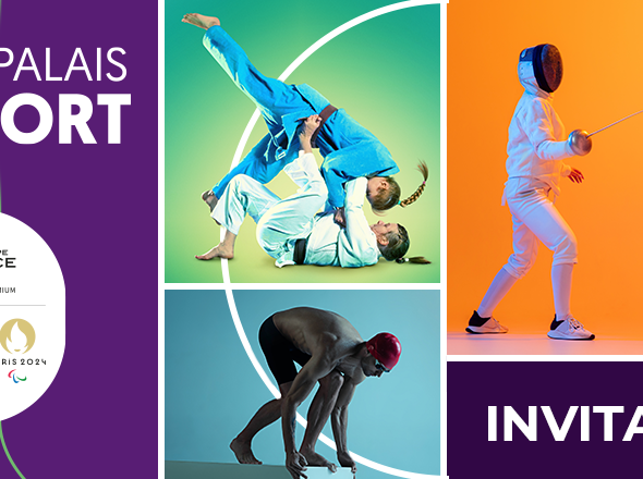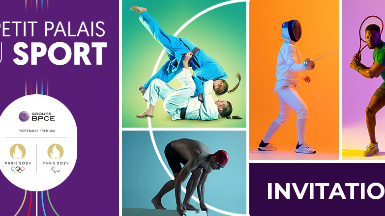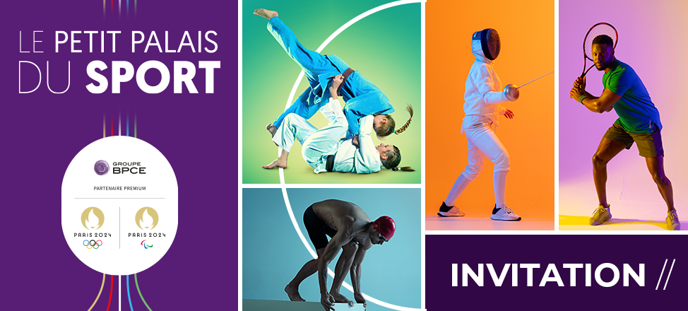 Visuel d'invitation du Groupe BPCE pour l'événement 'Le Petit Palais du Sport' à l'occasion des Jeux Olympiques et Paralympiques Paris 2024, illustrant divers sports en couleurs vives.