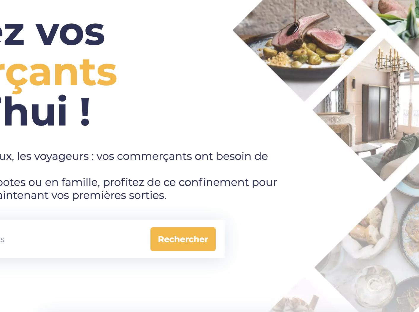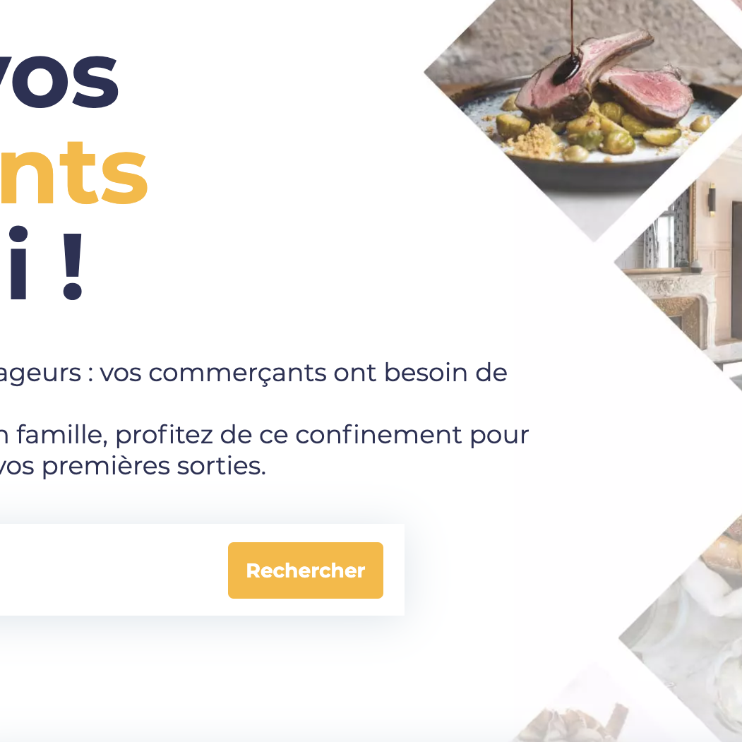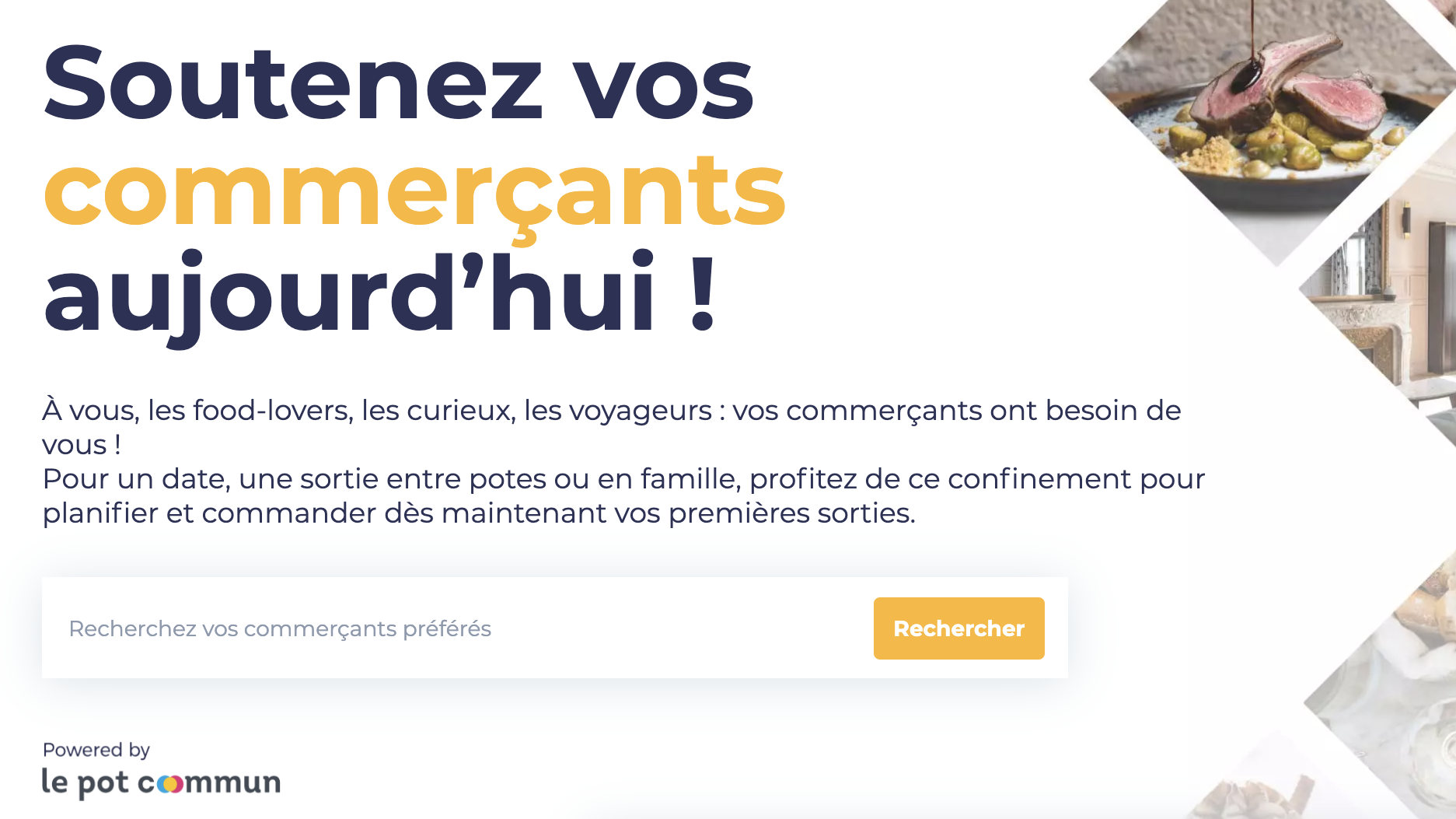 Visuel de la plateforme solidaire #SAUVETONRESTO invitant à soutenir les commerçants locaux avec Le Pot Commun, mettant en avant la recherche des commerces préférés.
