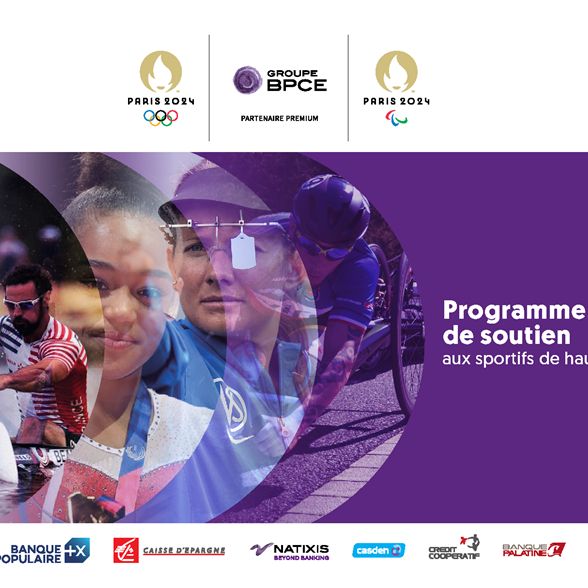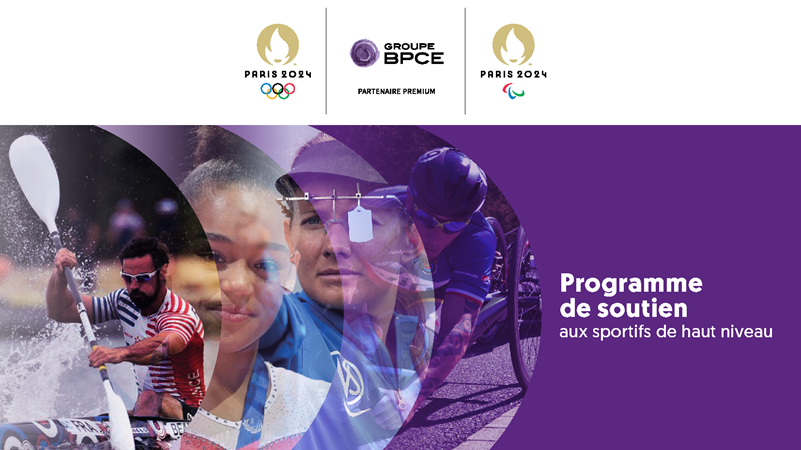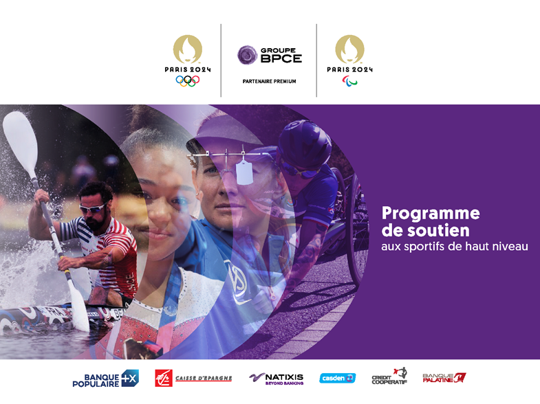 Visuel du programme de soutien du Groupe BPCE aux sportifs de haut niveau, en partenariat avec Paris 2024, illustrant des athlètes et para-athlètes de différentes disciplines.