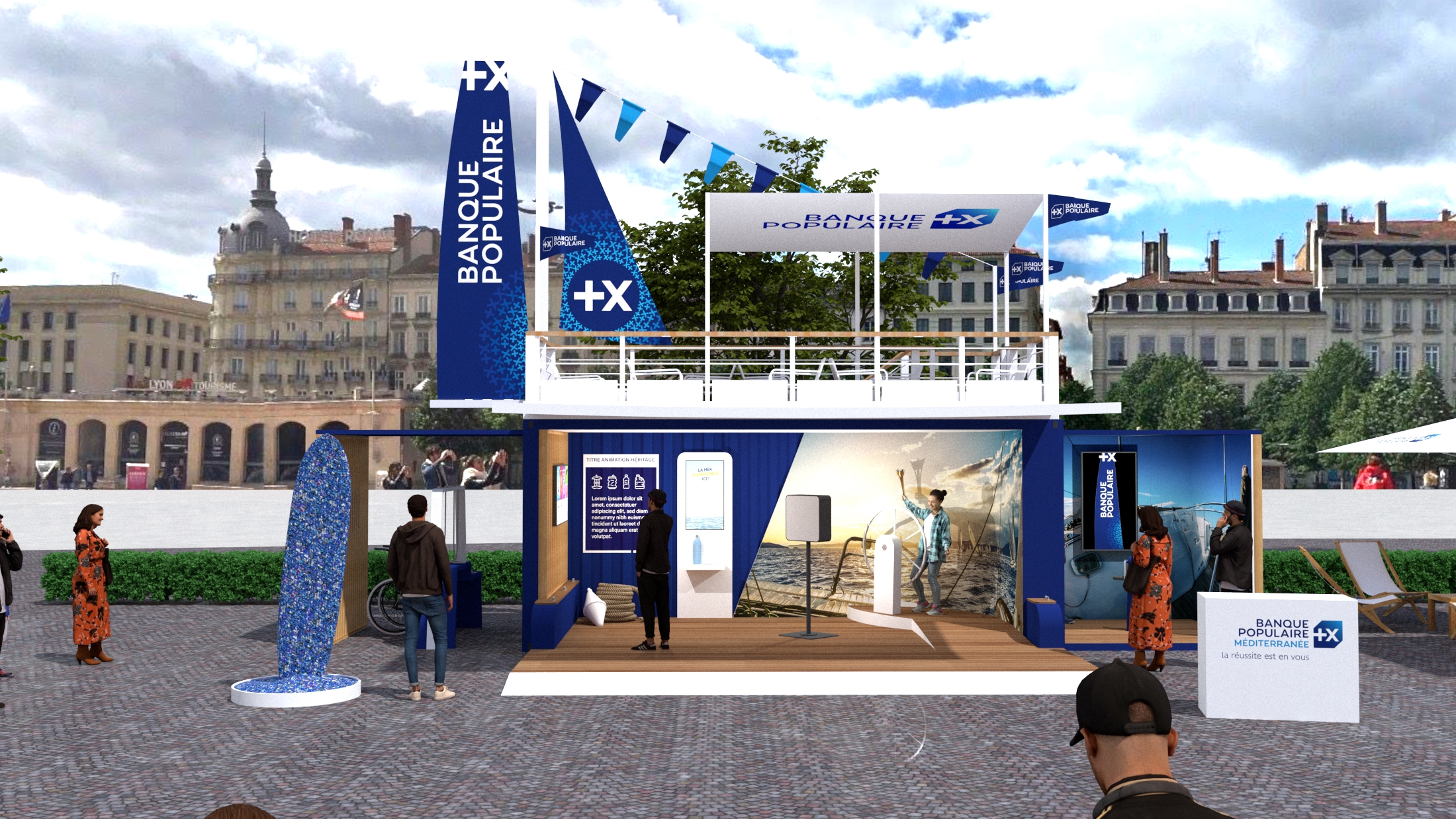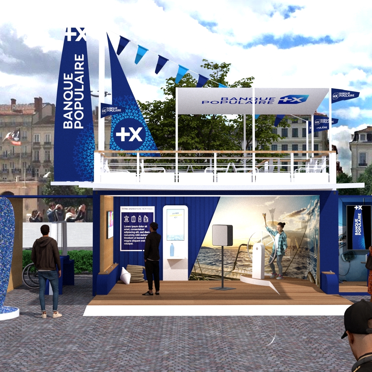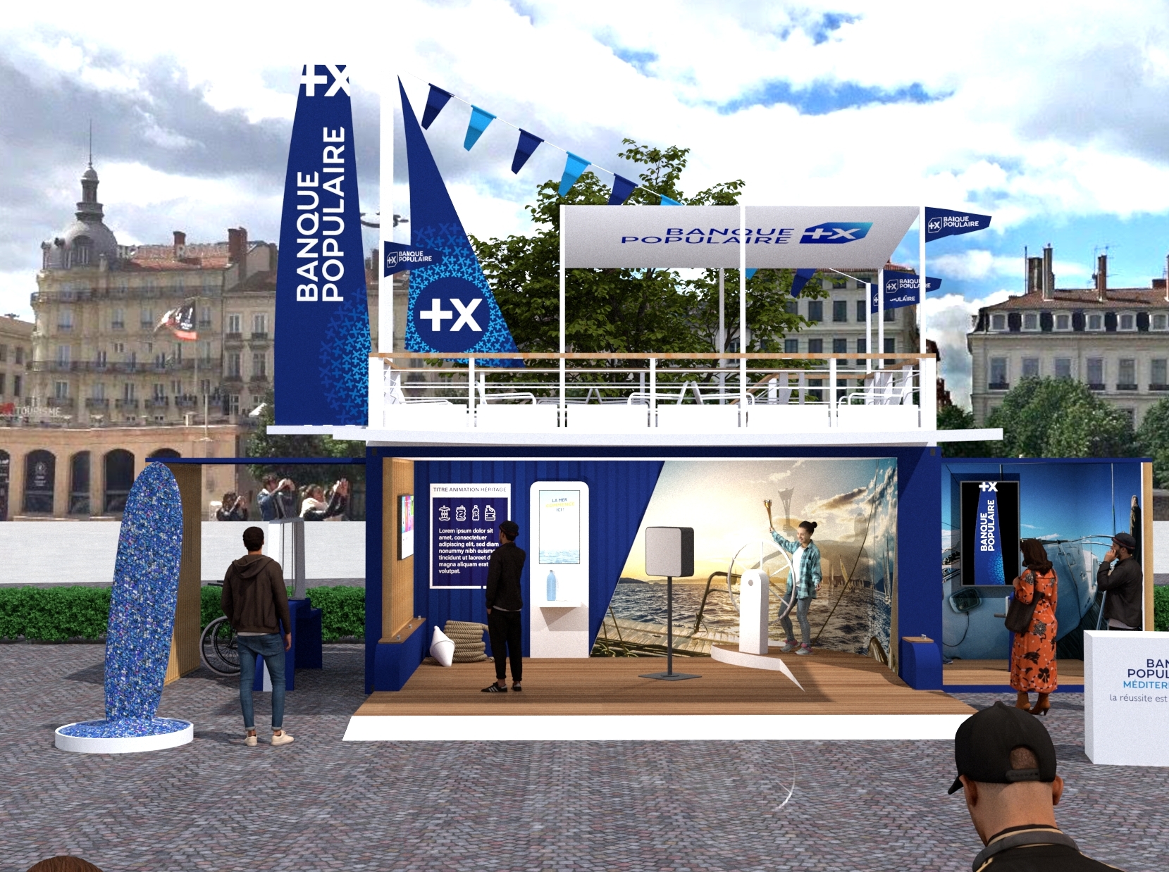 Stand événementiel de la Banque Populaire sur une place urbaine, consacré à la promotion de ses engagements lors des Relais de la Flamme Olympique de Paris 2024 avec des animations autour de la voile et de la préservation des milieux aquatiques.