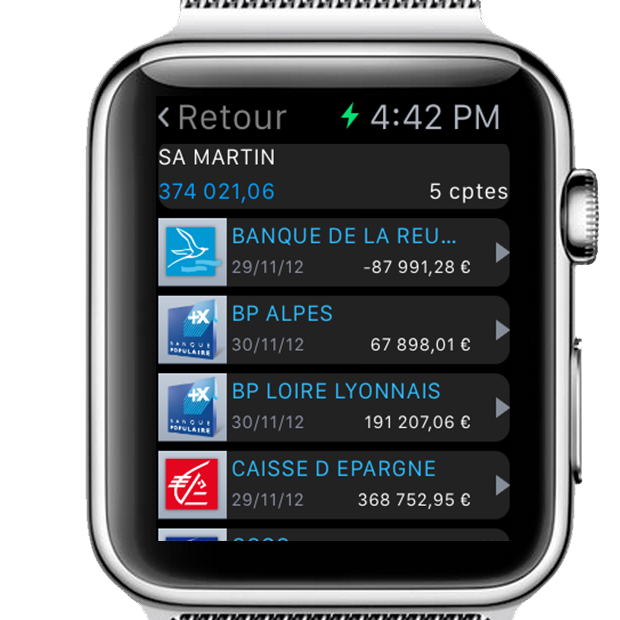 Affichage de l'application Suite Entreprise de Banque Populaire sur Apple Watch, présentant le solde multi-comptes bancaires d'une entreprise en temps réel.
