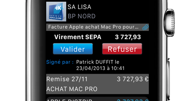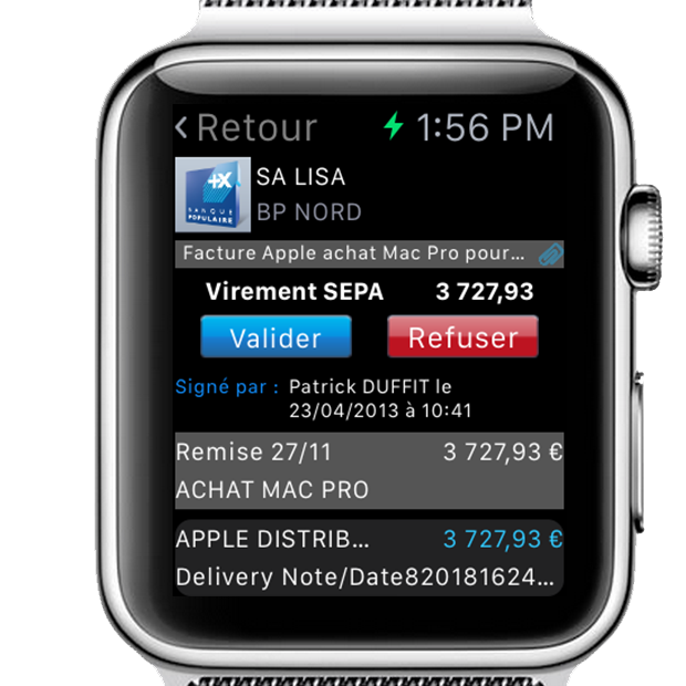 Interface de l'application Suite Entreprise sur Apple Watch, affichant une validation de virement SEPA Banque Populaire pour un achat professionnel.