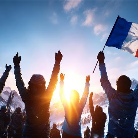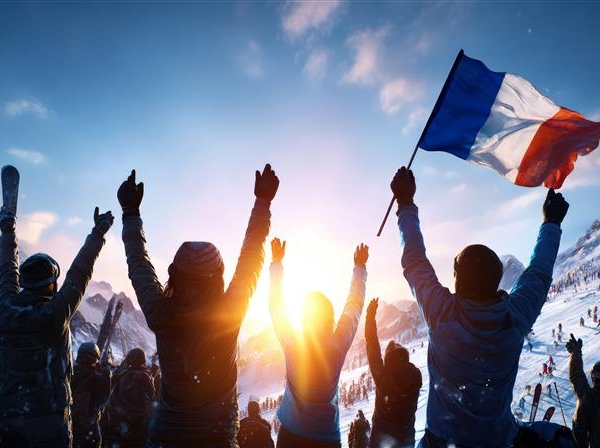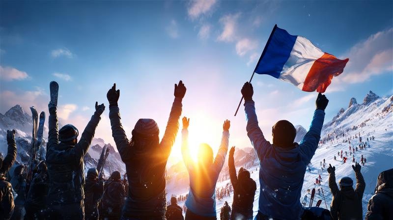 Silhouettes de skieurs français agitant le drapeau tricolore sur fond de montagnes enneigées au coucher du soleil.