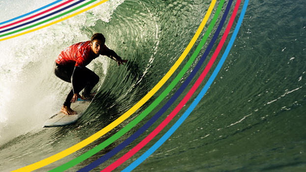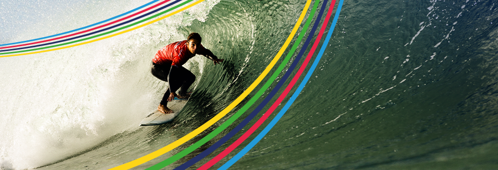 Surfeur vêtu d’un lycra rouge surfant une vague tubulaire avec des bandes colorées symbolisant le partenariat Banque Populaire et Paris 2024.