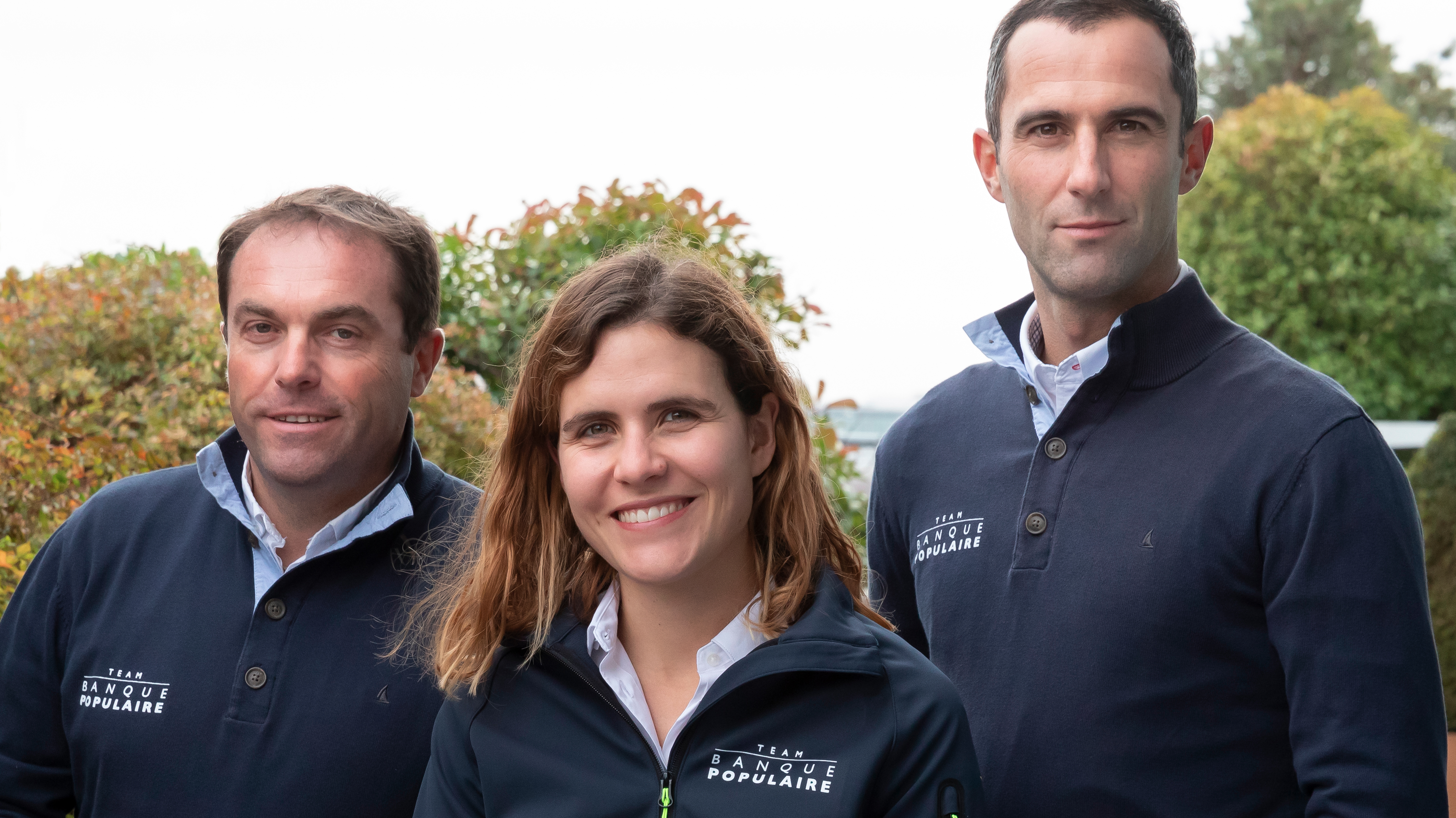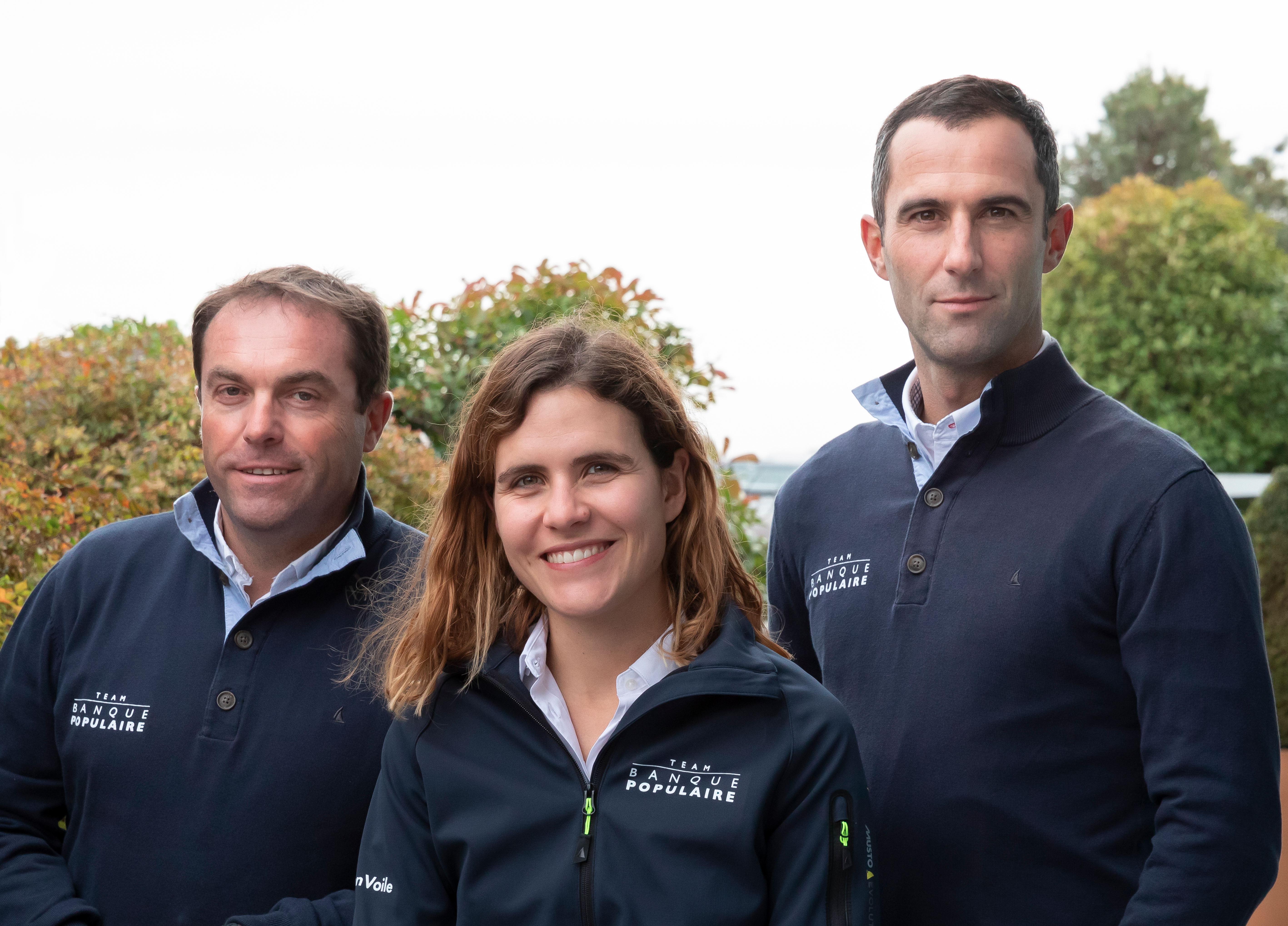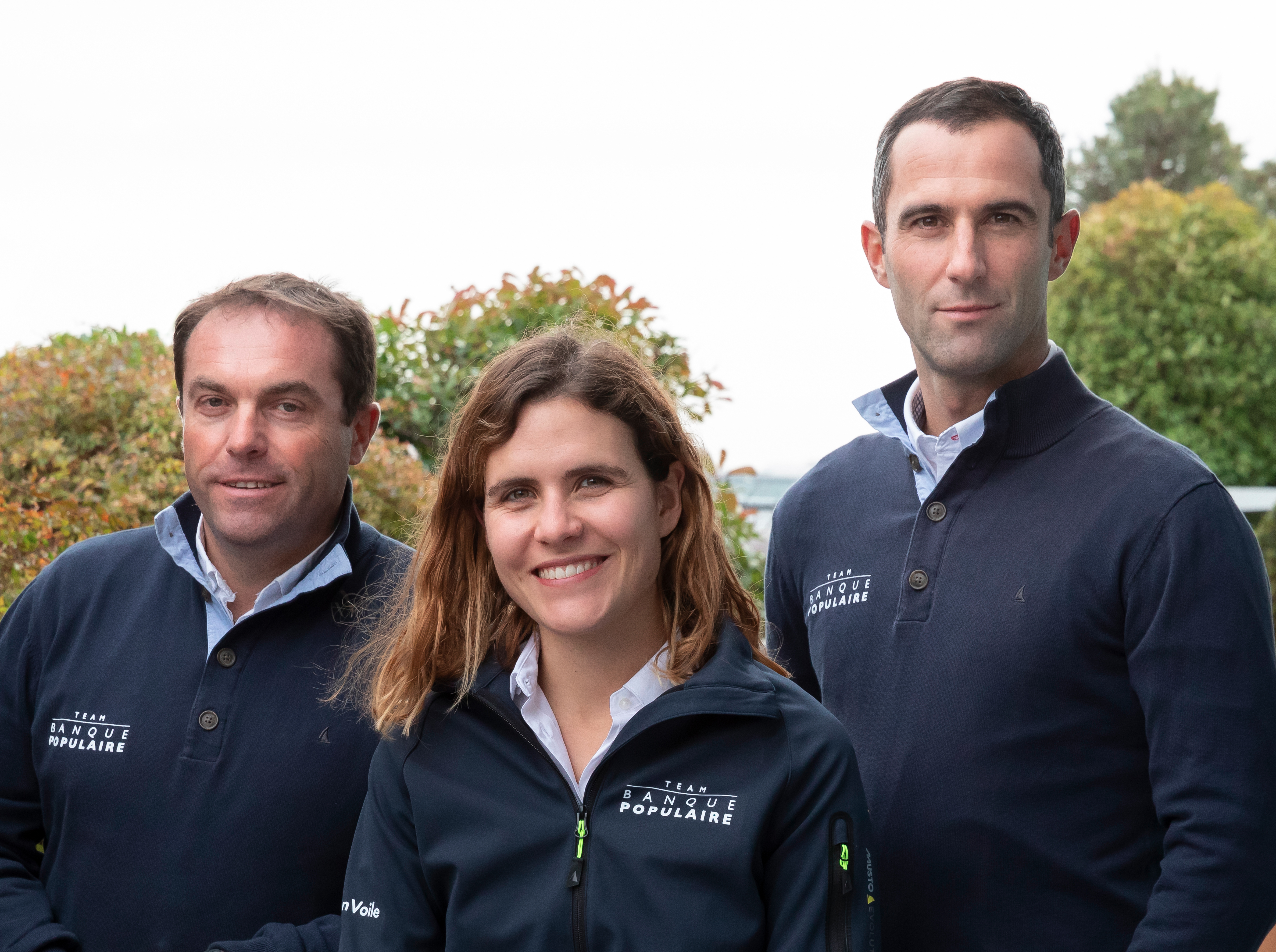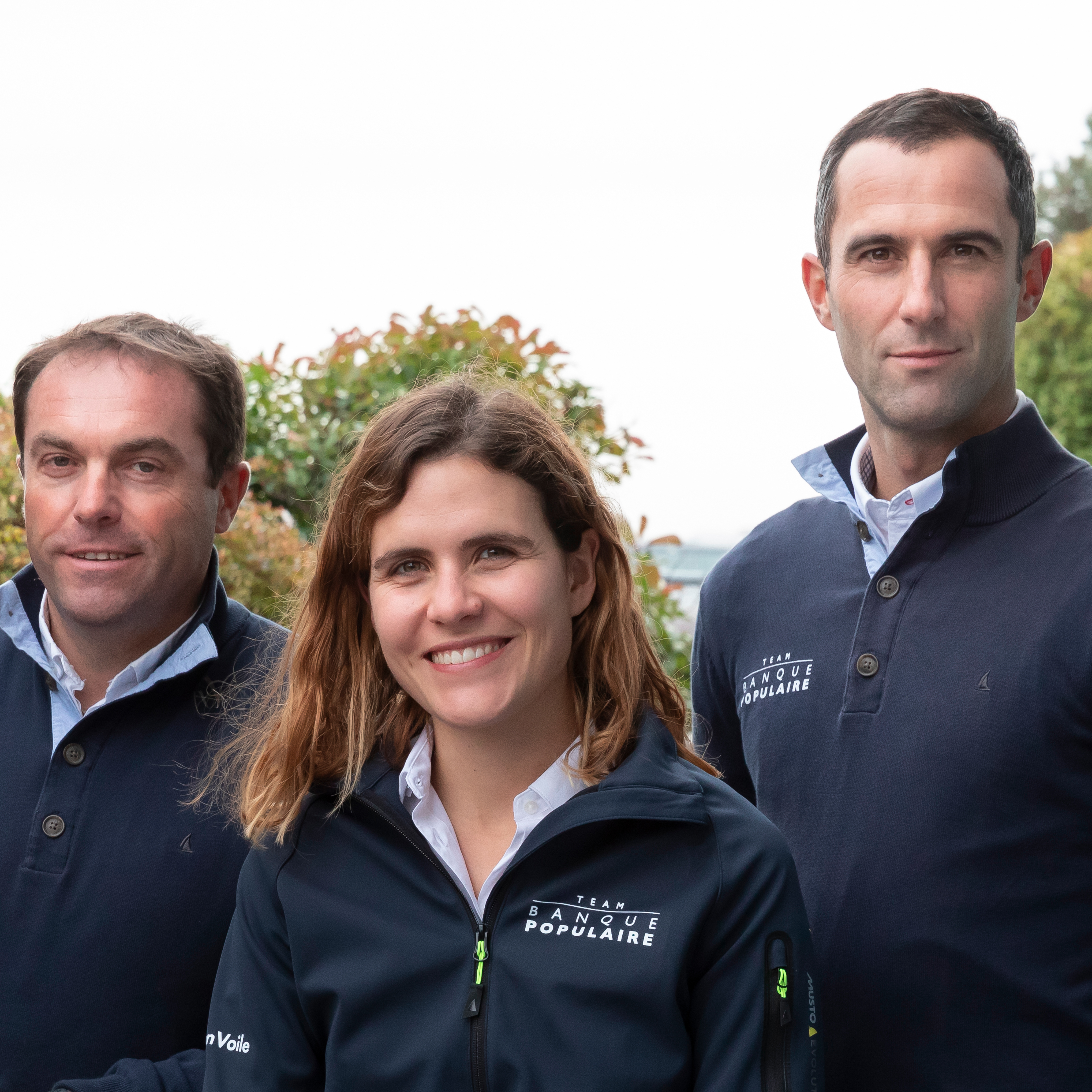 Portrait de trois membres du Team Banque Populaire, photographiés en extérieur lors d'un événement lié à la voile.