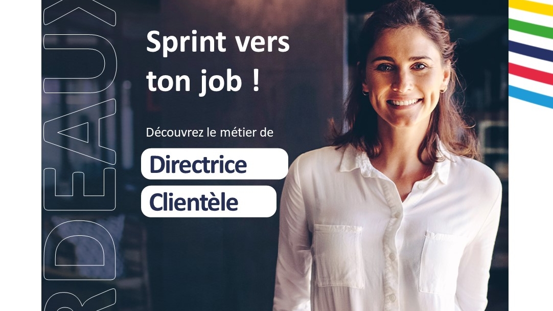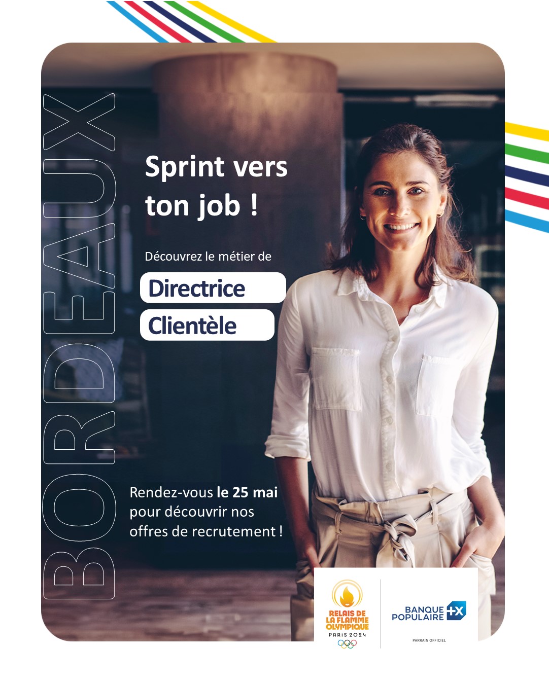 Affiche de recrutement pour le métier de directrice clientèle à Bordeaux, organisée par Banque Populaire lors du Relais de la Flamme Olympique Paris 2024.