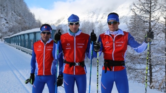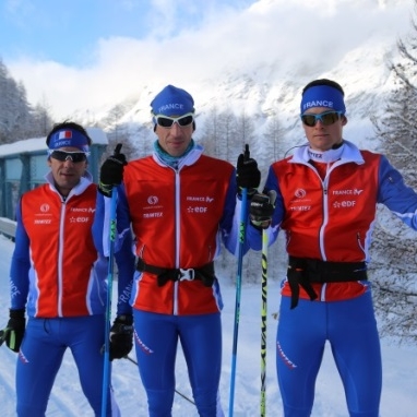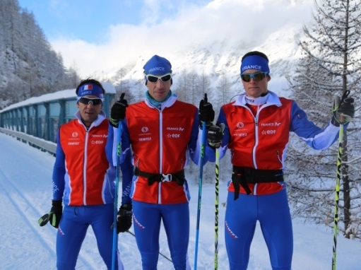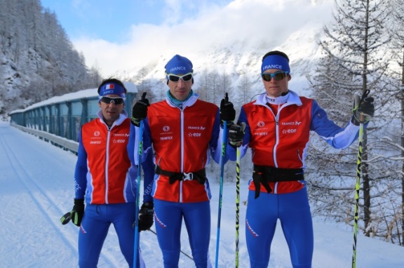 Trois membres de l’équipe de France de ski nordique handisport posent en tenue officielle sur une piste enneigée en montagne.