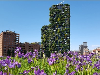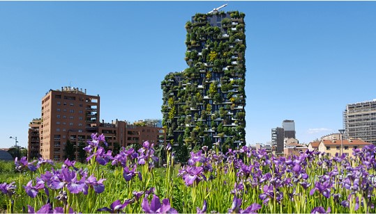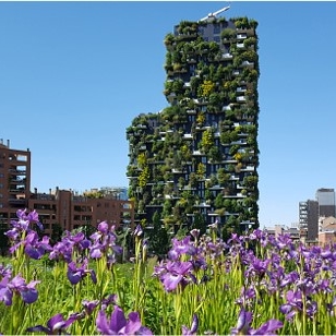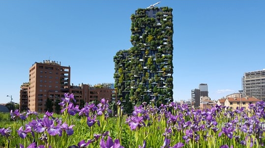 Vue sur la tour Bosco Verticale à Milan, célèbre immeuble résidentiel couvert de végétation, avec des fleurs violettes au premier plan.