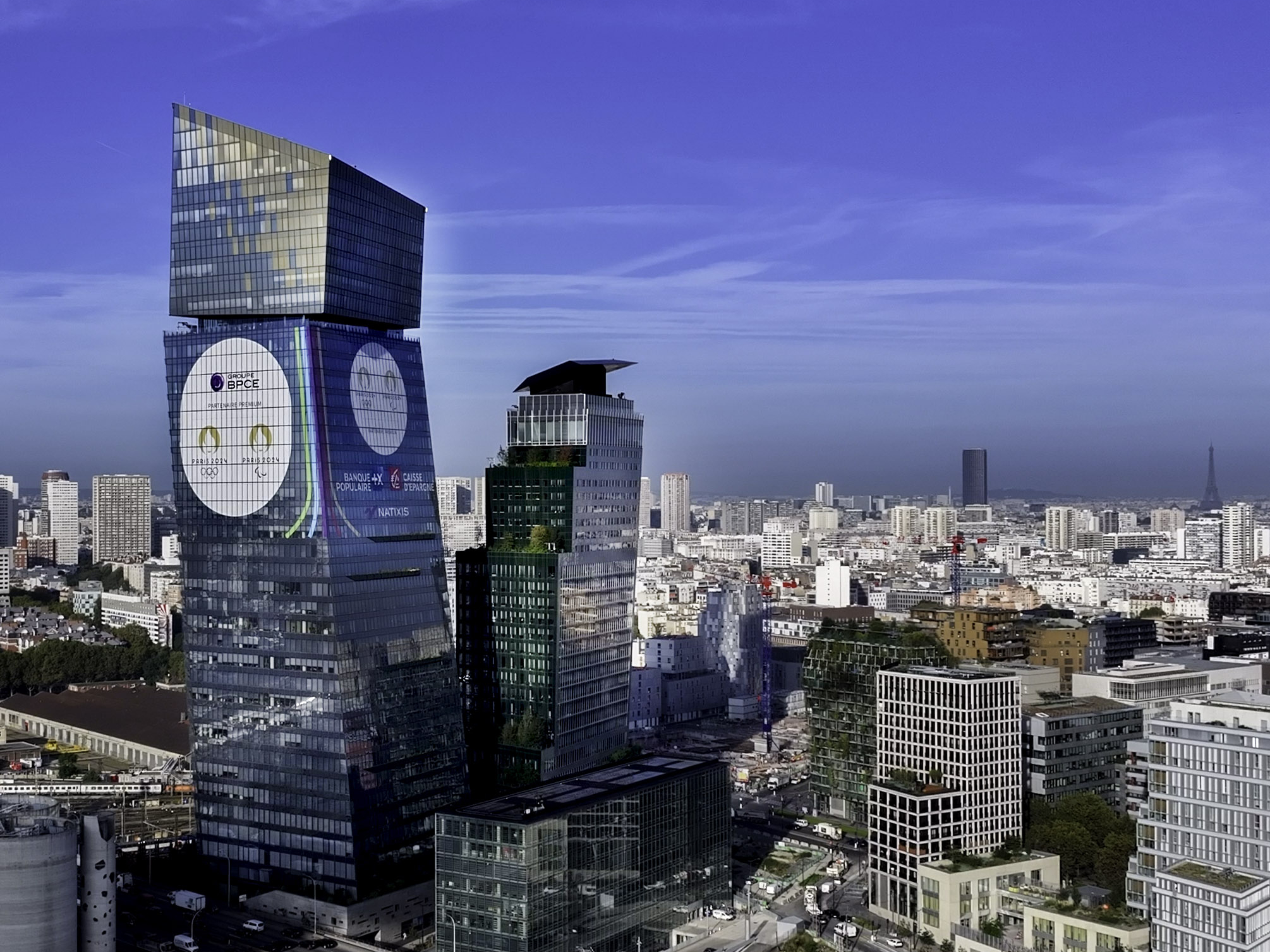 Vue aérienne de la Tour BPCE à Paris ornée d'une vitrophanie géante aux couleurs des Jeux Olympiques et Paralympiques de Paris 2024, mettant en valeur le partenariat du Groupe BPCE.