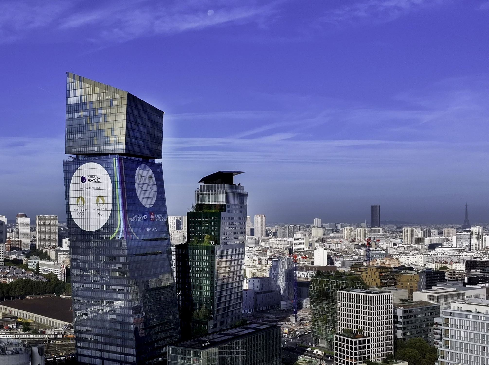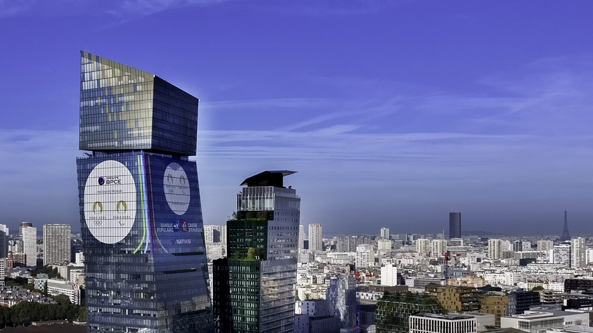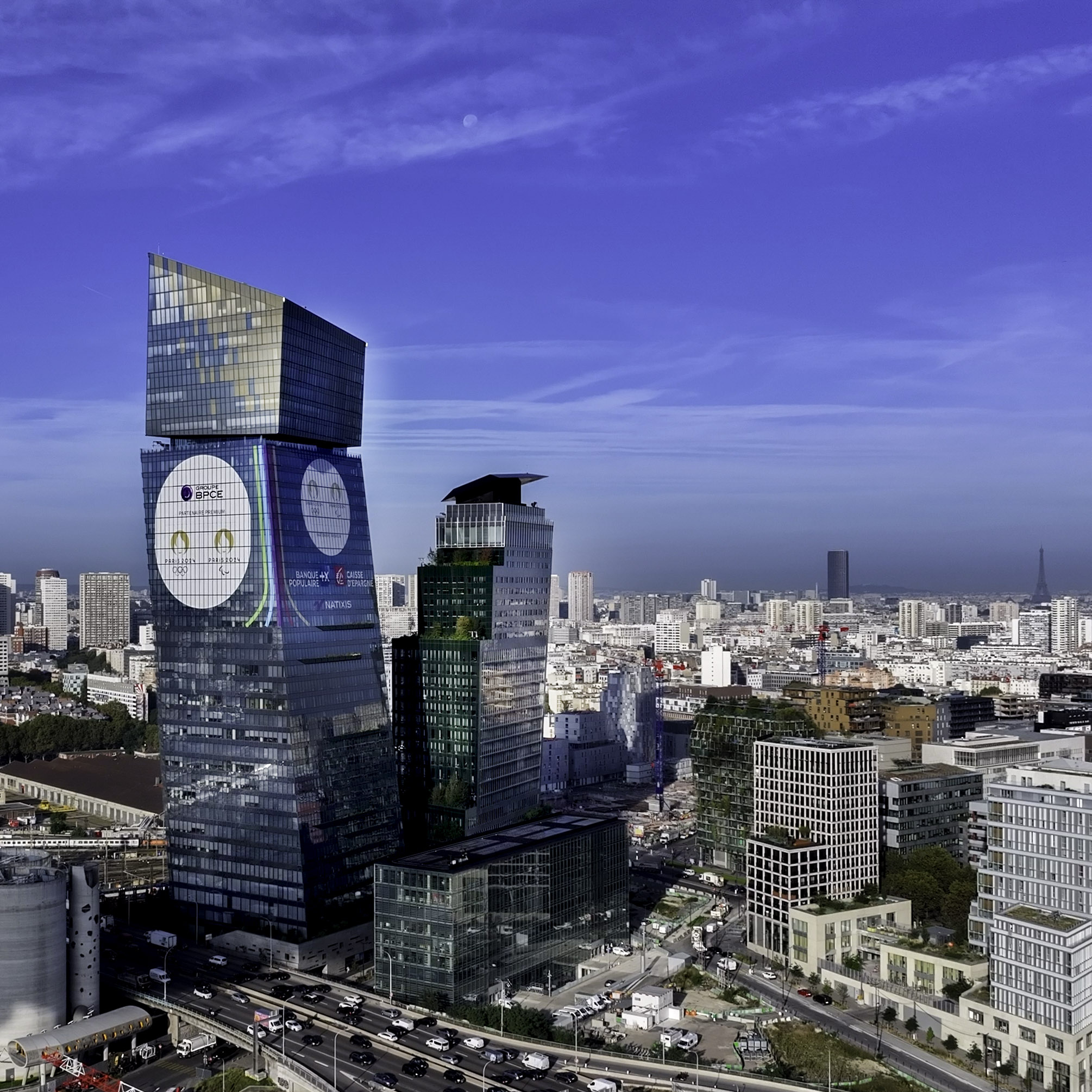 Vue panoramique des tours du Groupe BPCE et de la skyline de La Défense à Paris, mettant en avant l'architecture contemporaine du quartier d’affaires.