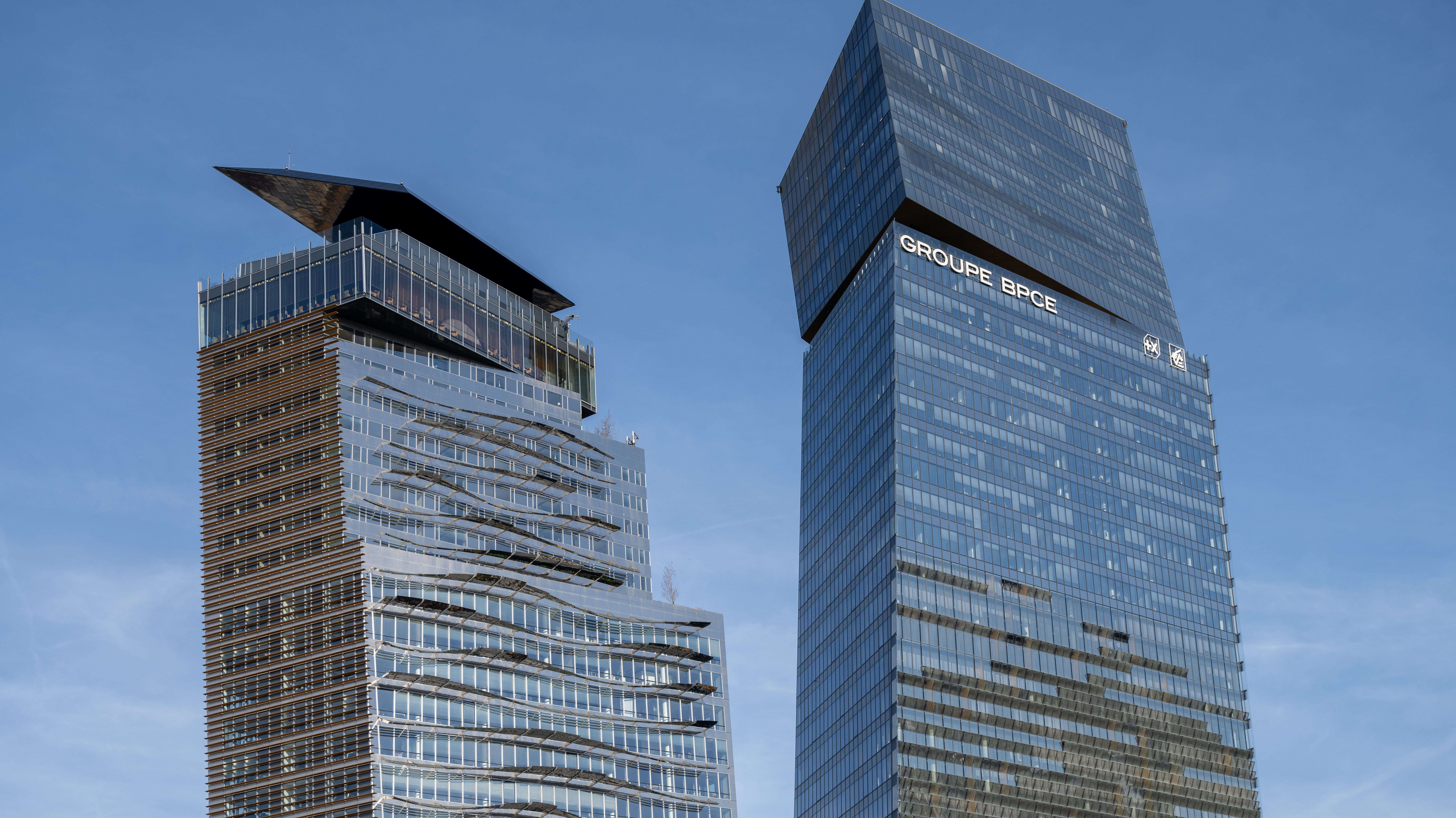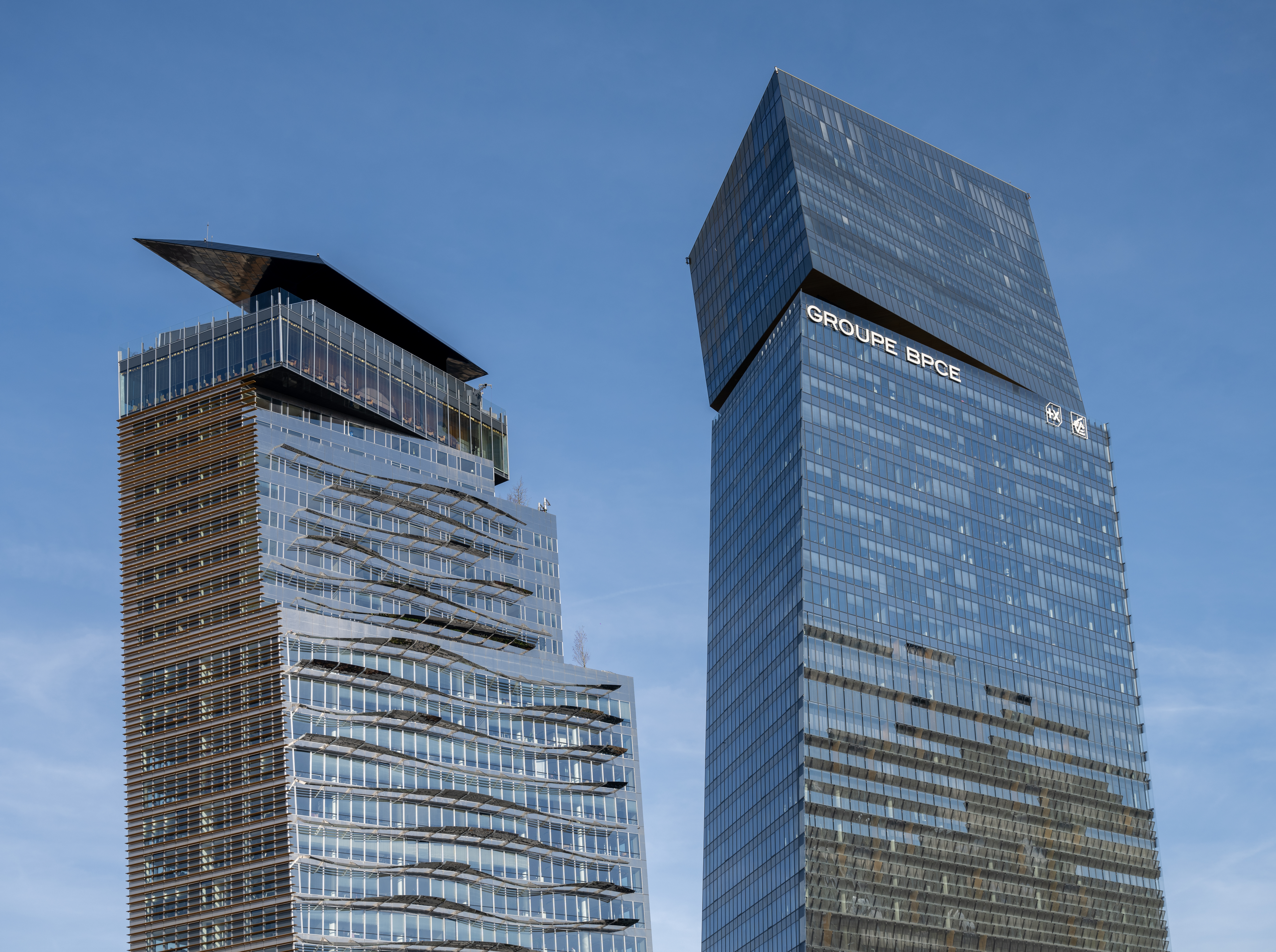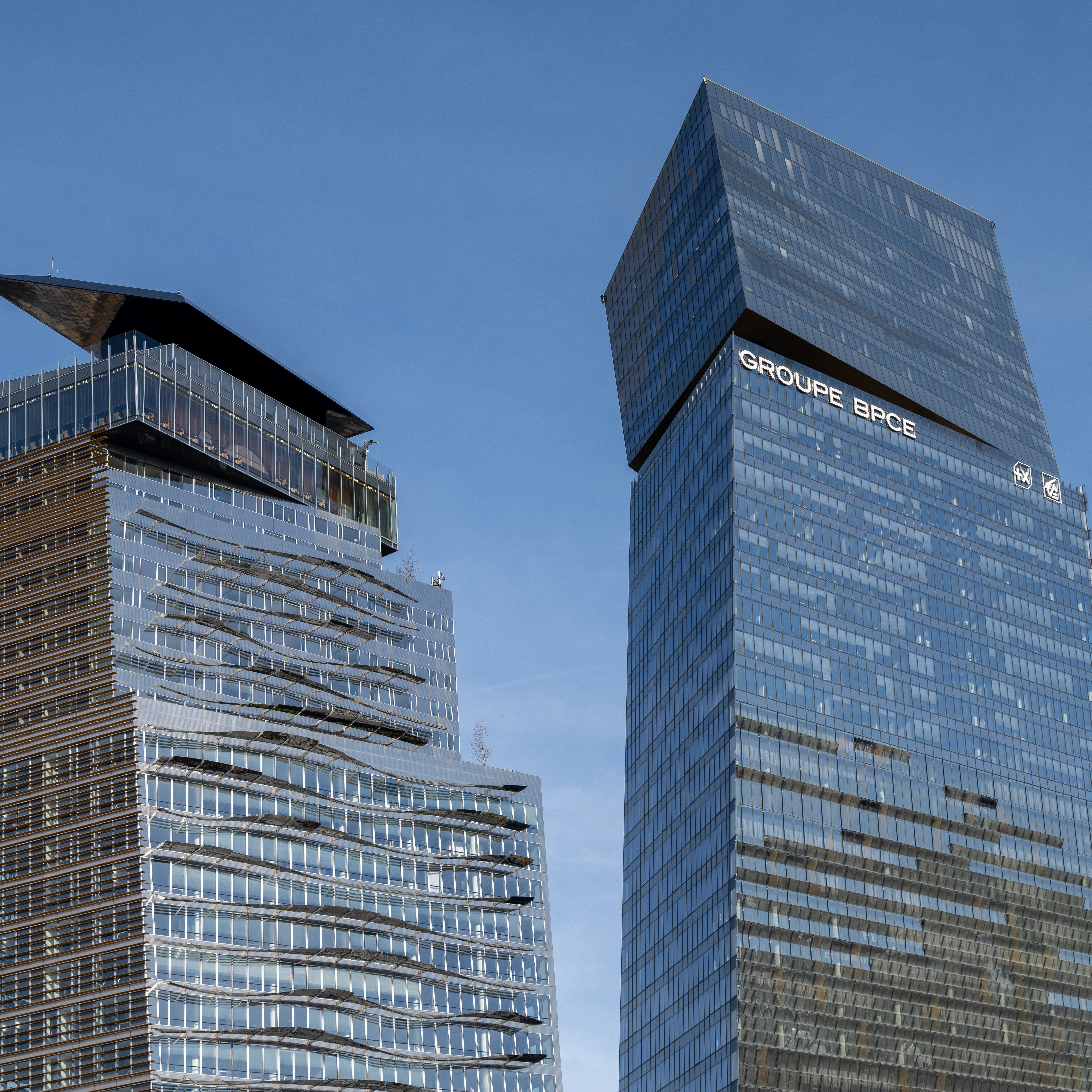 Vue des Tours Duo, sièges du Groupe BPCE à Paris, deux gratte-ciel contemporains conçus par Jean Nouvel dans le 13e arrondissement.