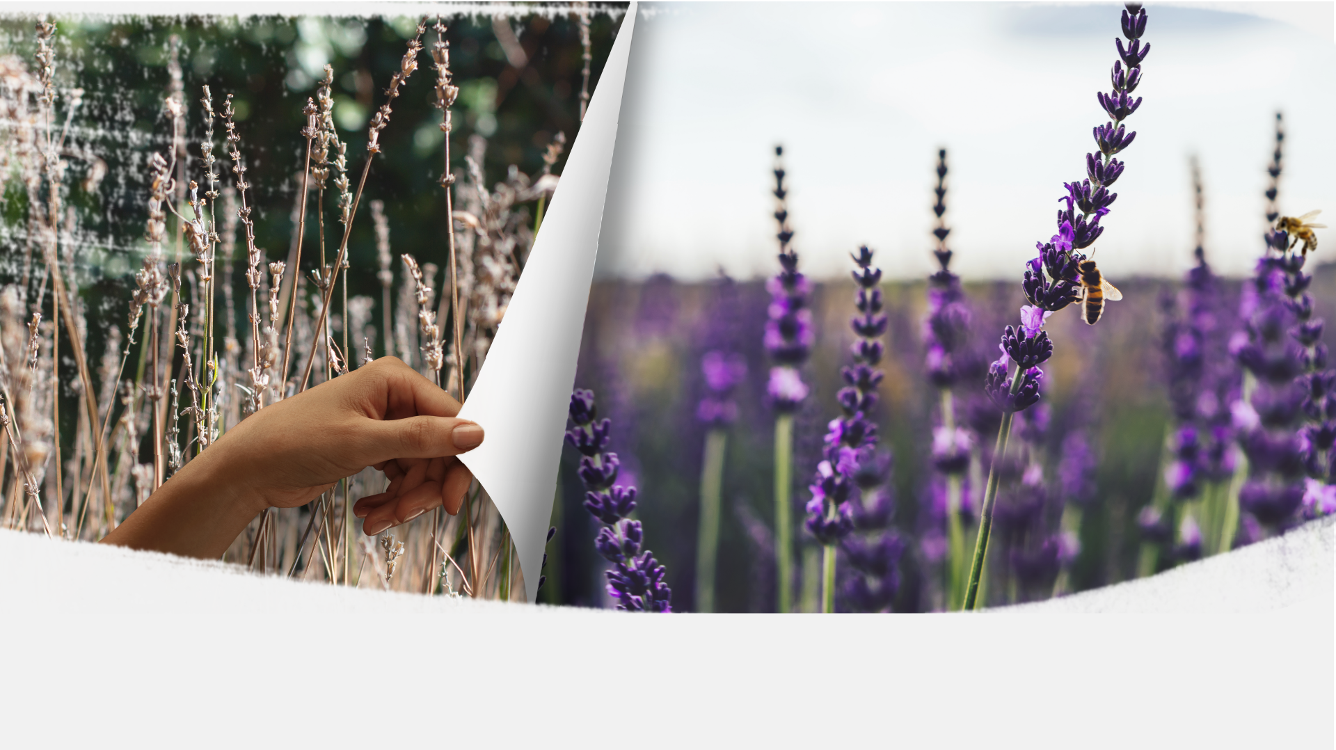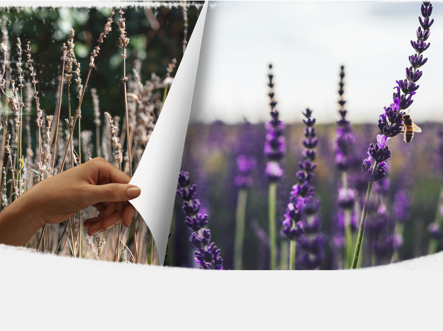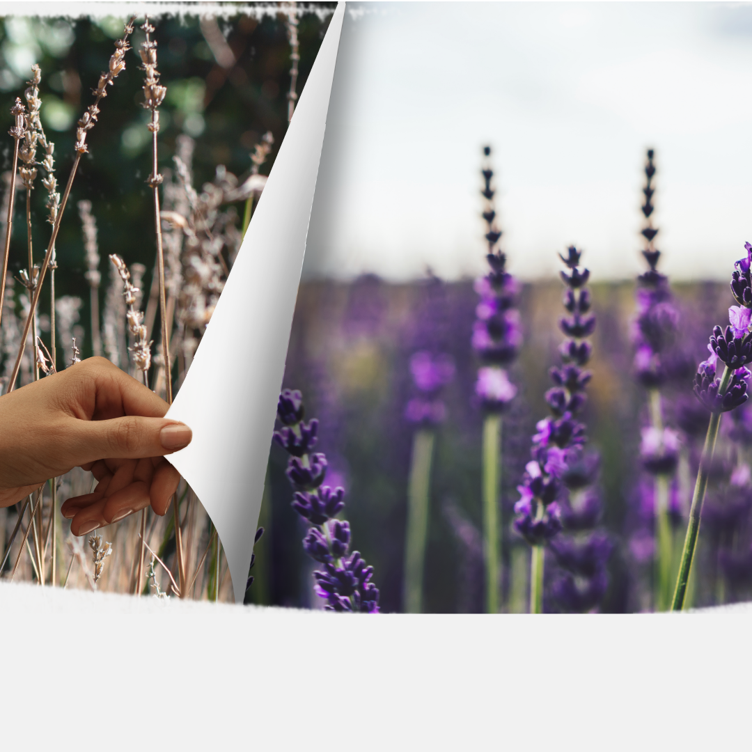 Main tendant une page révélant une transition d’un champ sec à un champ de lavande en fleur avec des abeilles, illustrant le passage vers la biodiversité.