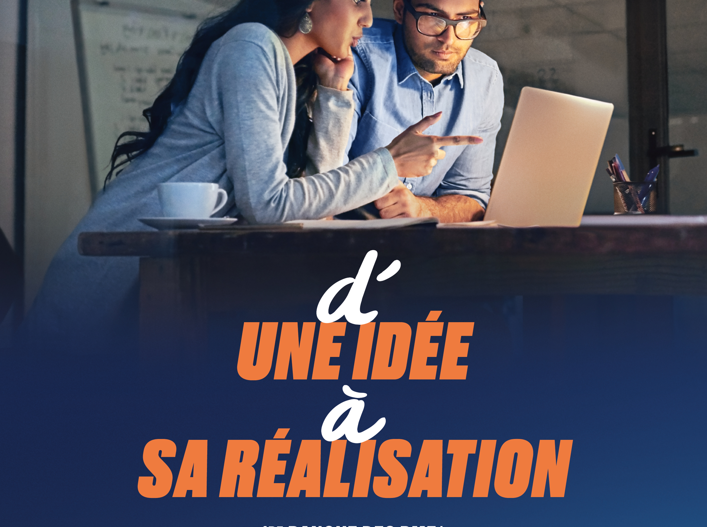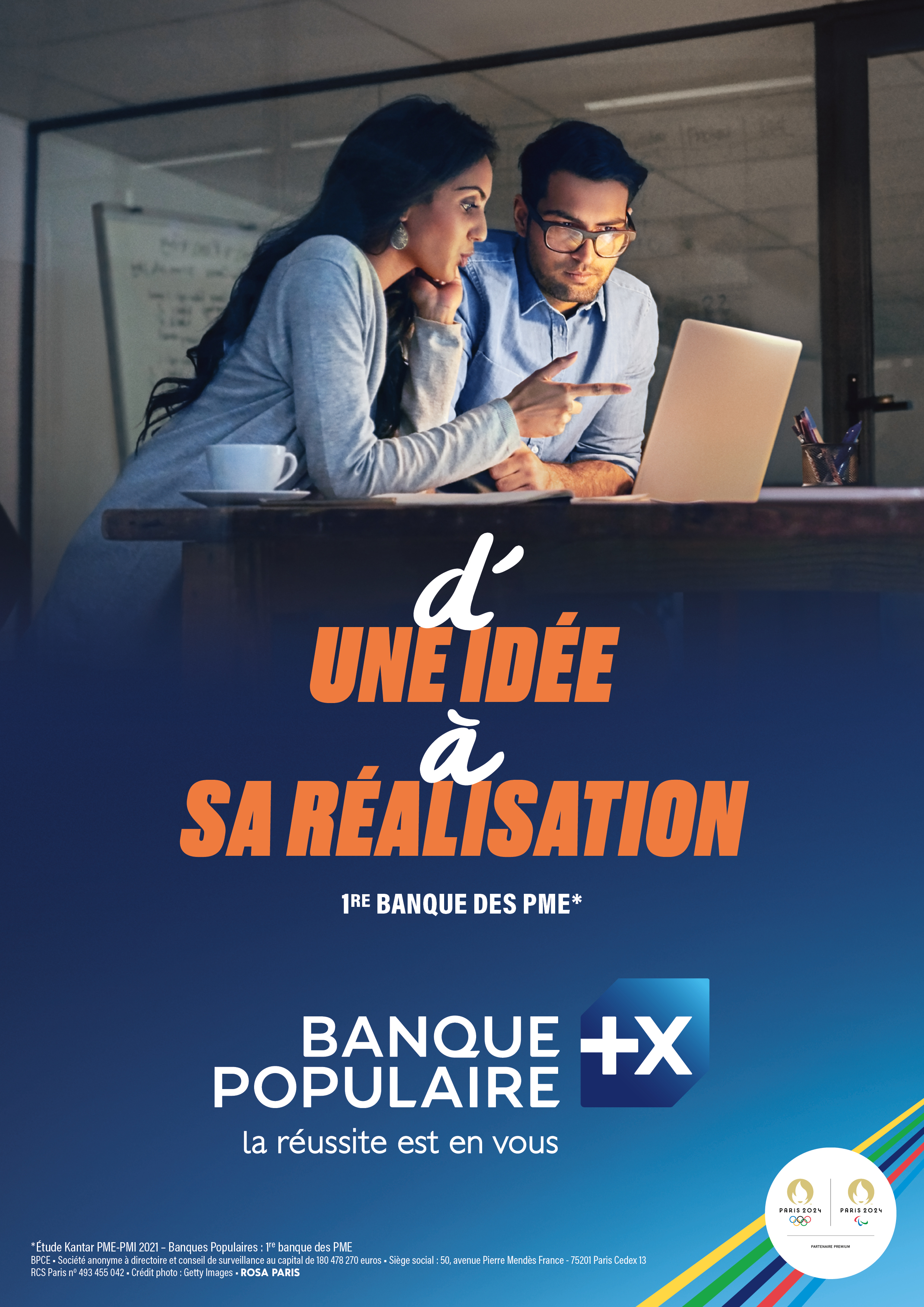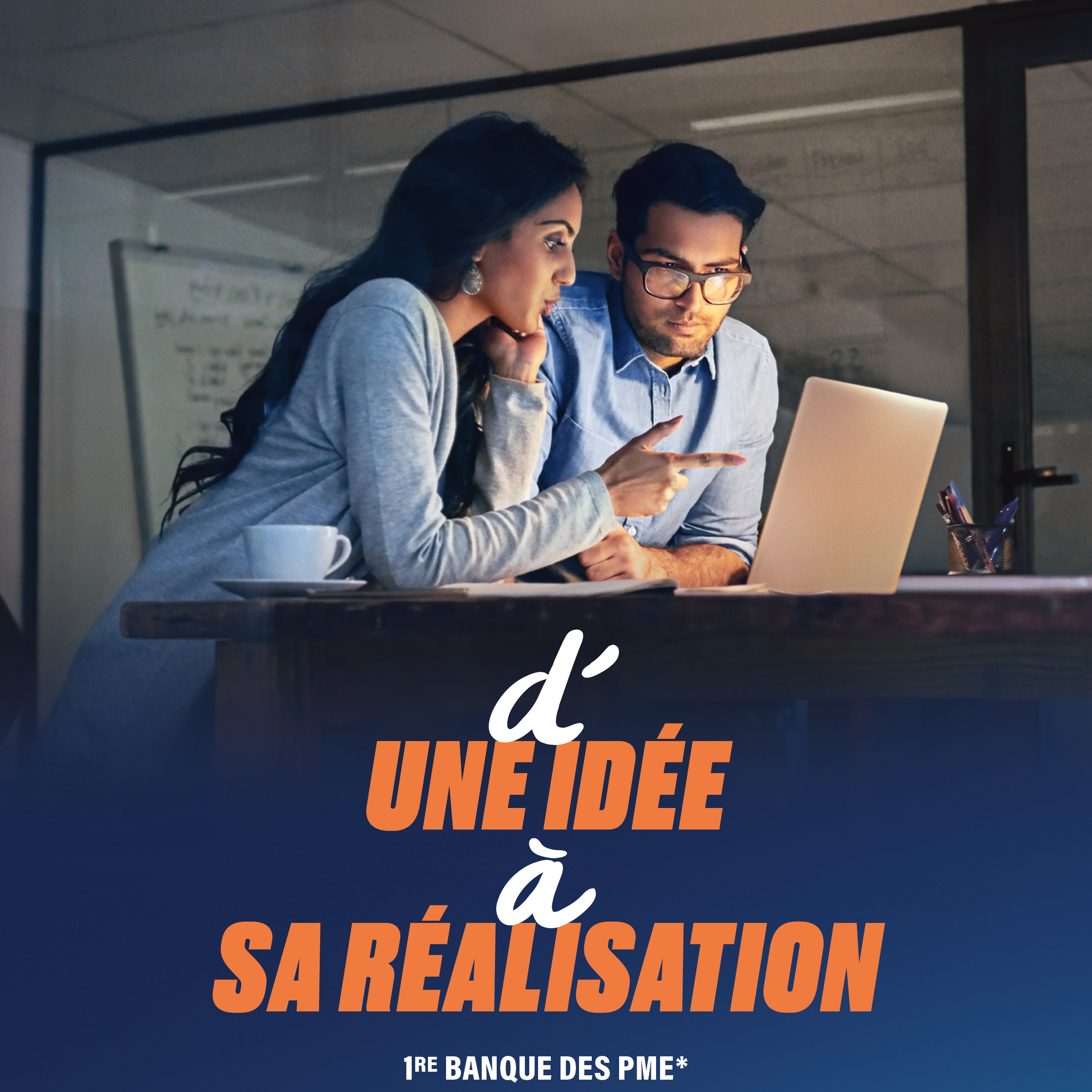 Deux entrepreneurs échangent devant un ordinateur portable dans un bureau avec le slogan Banque Populaire « d'une idée à sa réalisation », illustrant l'accompagnement des PME par la banque.