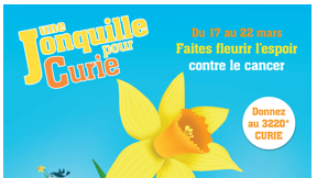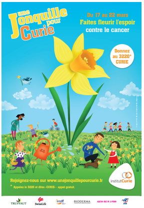 Affiche de l'opération « Une Jonquille pour Curie », campagne de mobilisation et d'appel aux dons contre le cancer, organisée par l'Institut Curie.