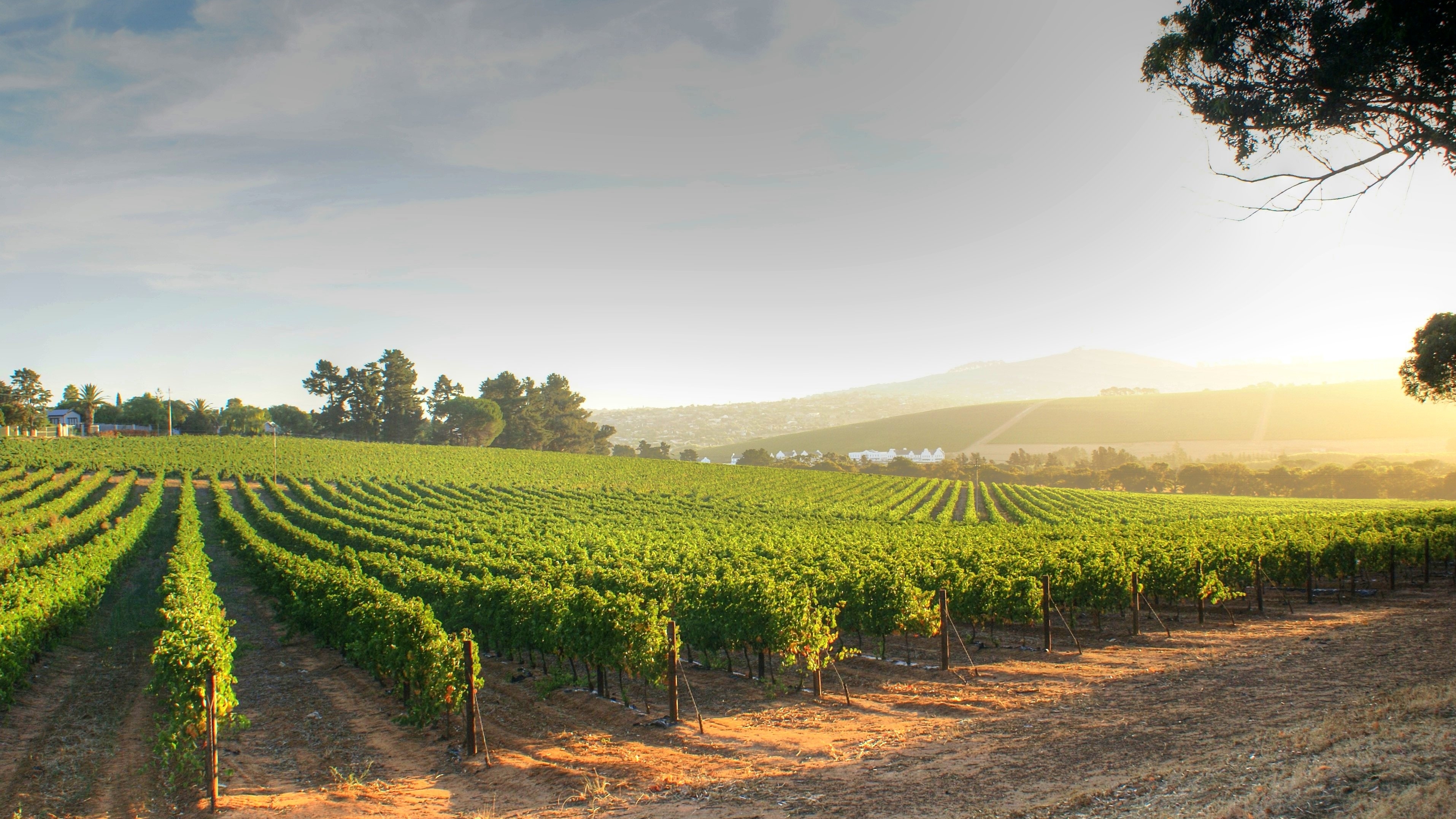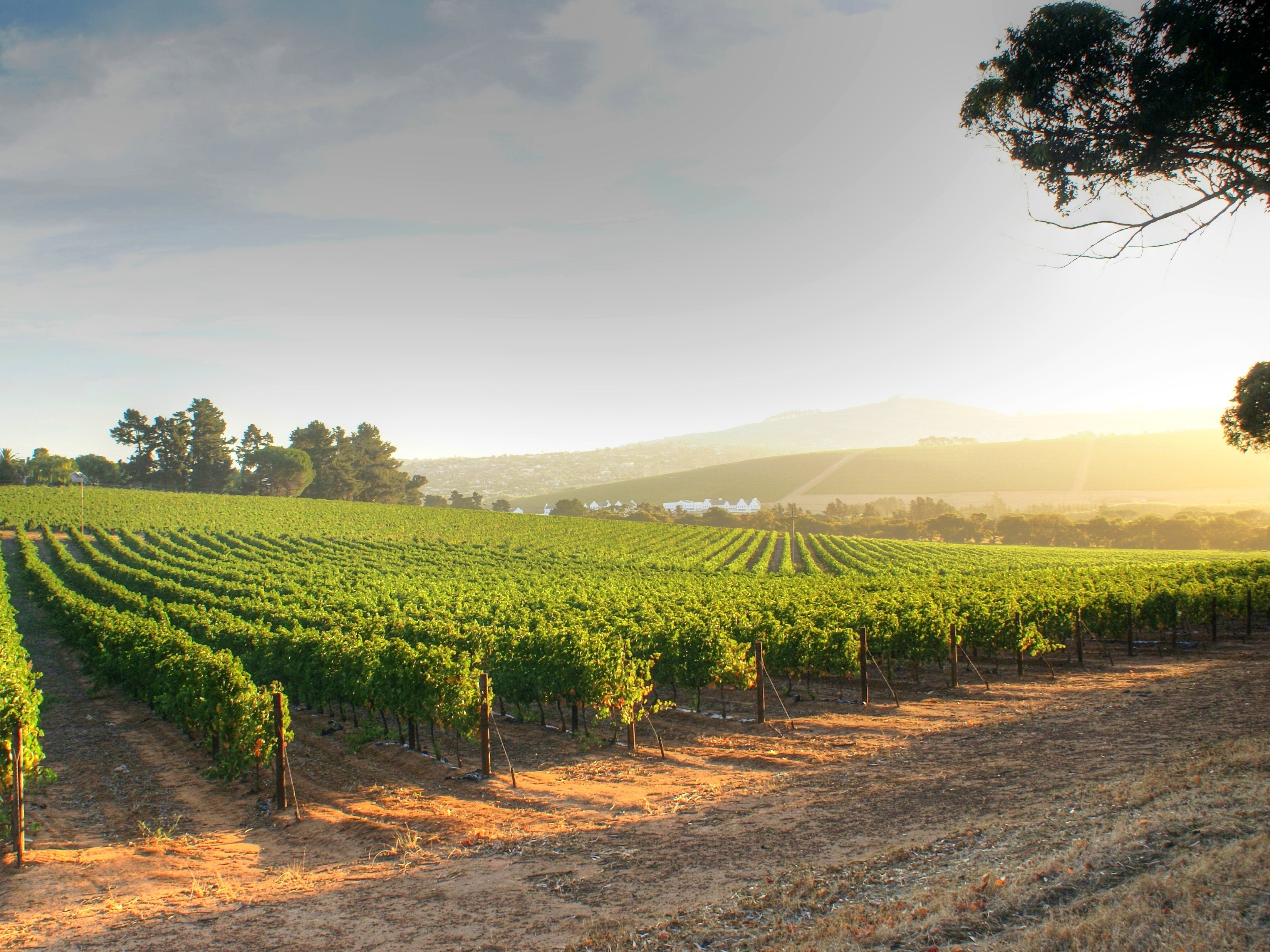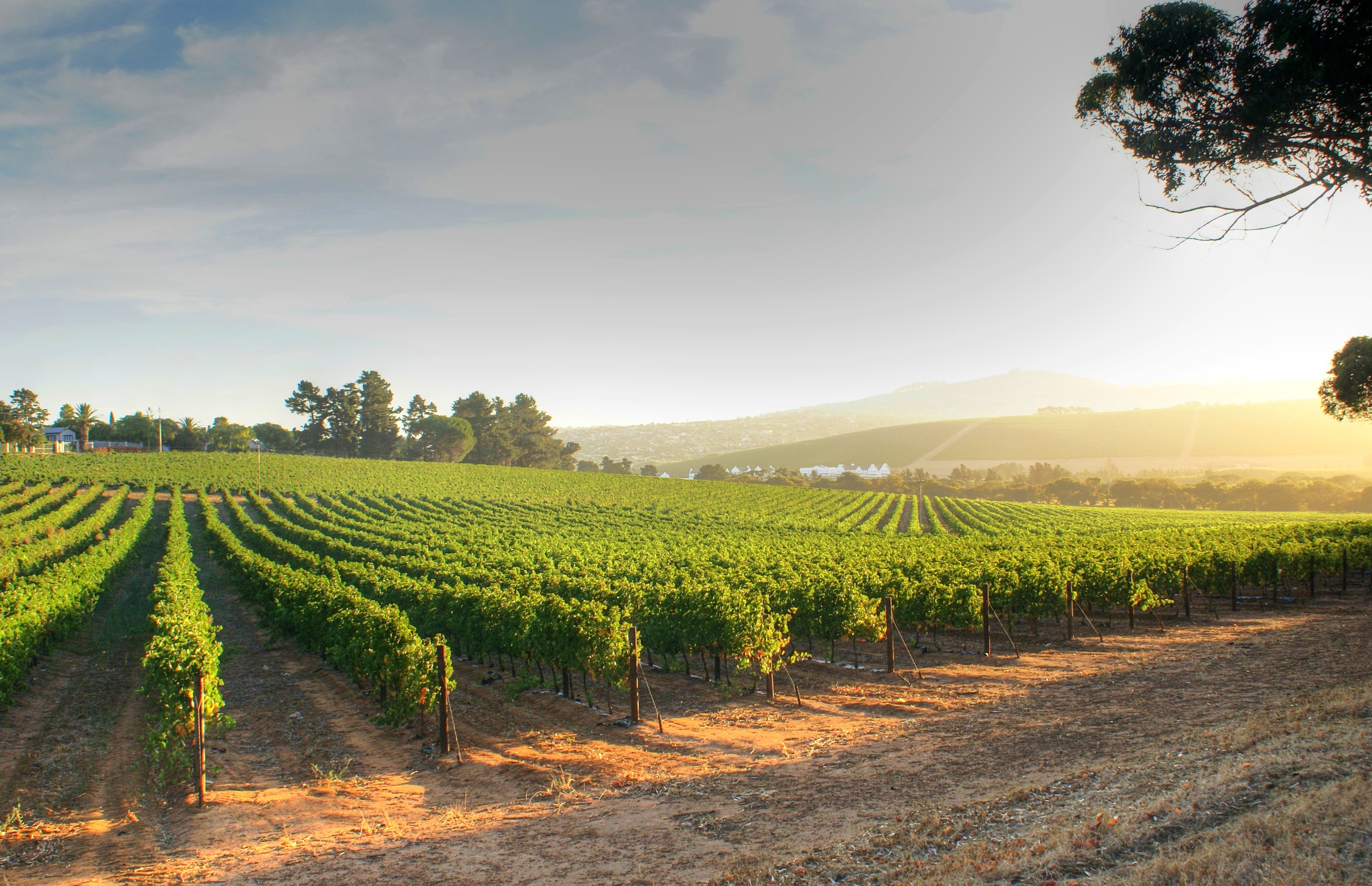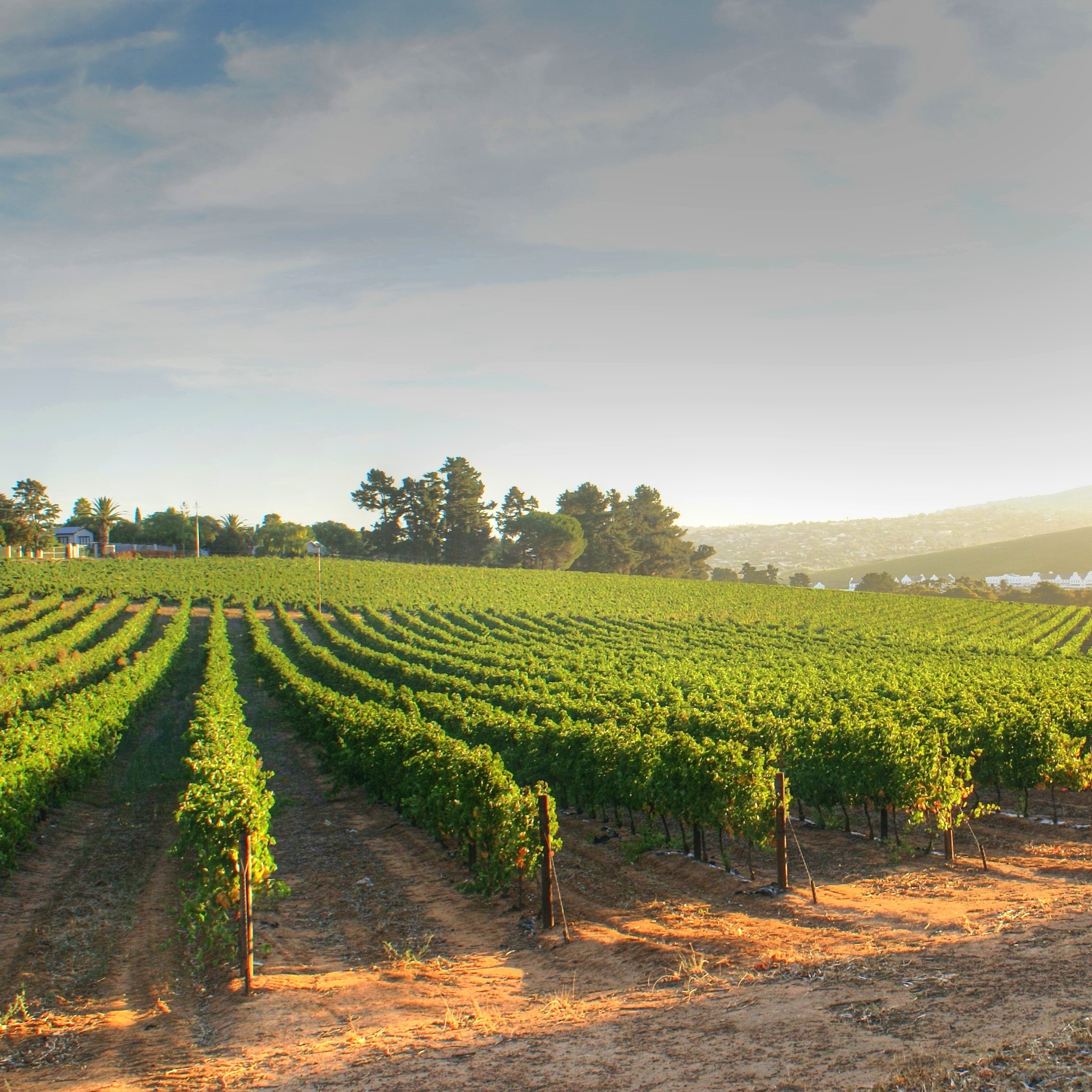 Vue d'un vignoble au lever du soleil, montrant des rangs de vignes bien entretenues s'étendant sur un paysage vallonné, illustrant la viticulture et l'environnement rural.
