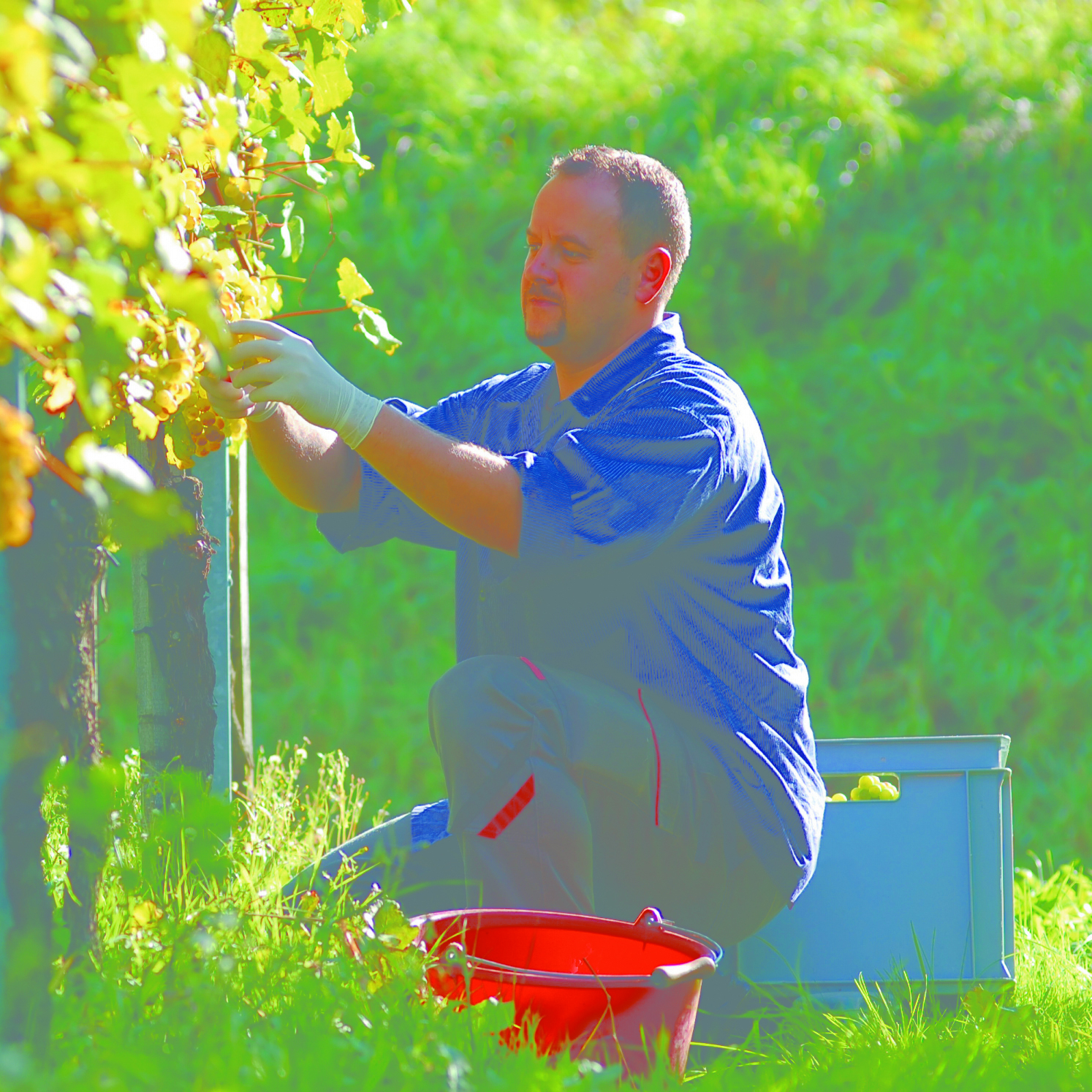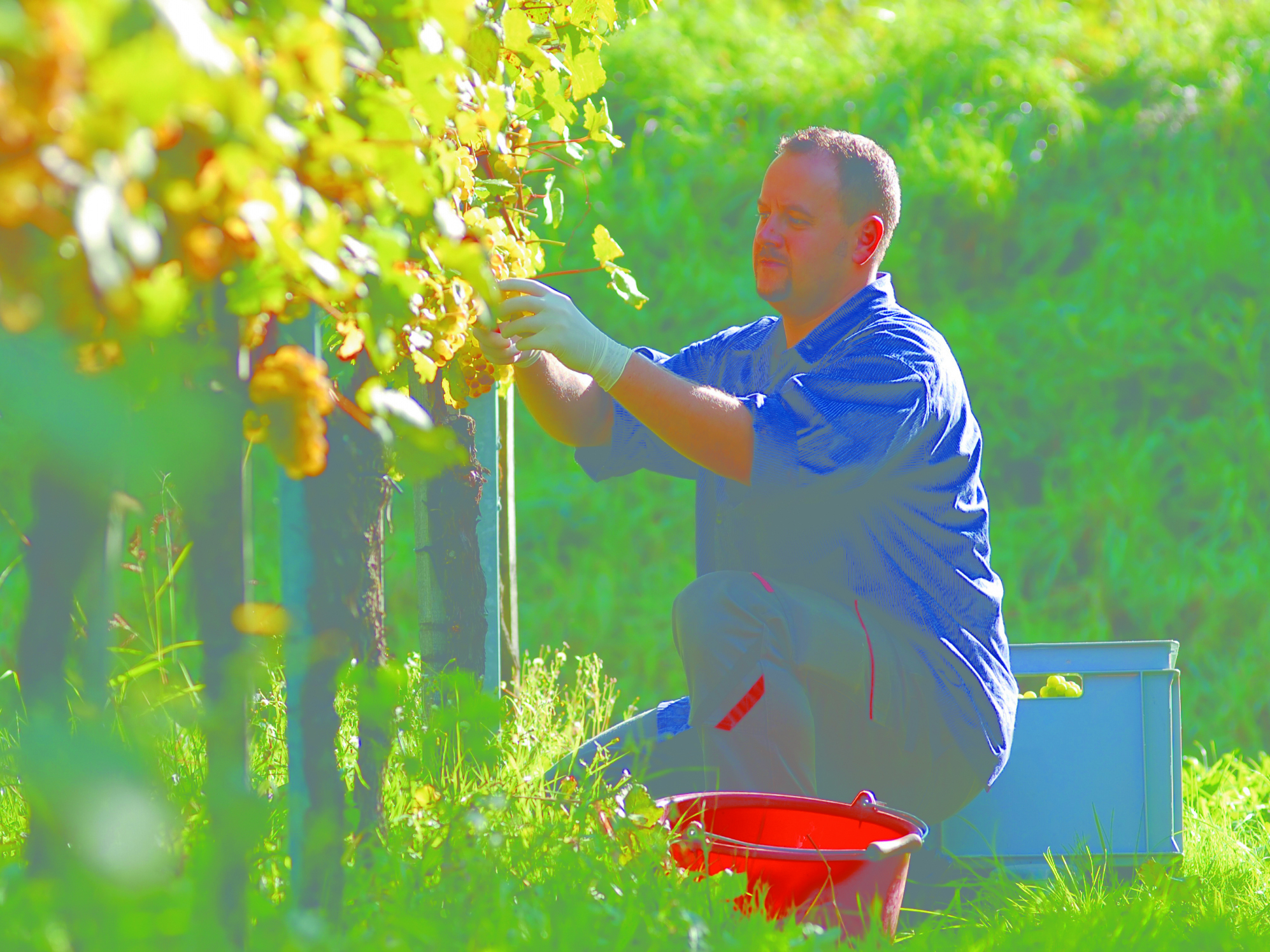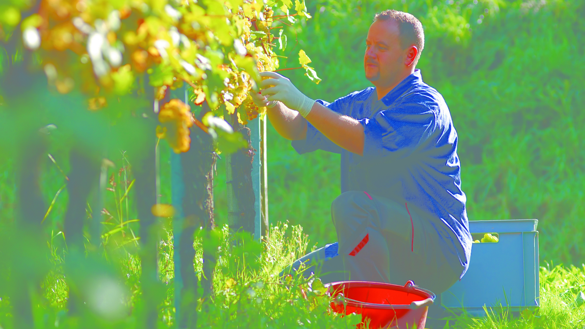 Homme récoltant des grappes de raisin à la main dans un vignoble, avec un seau rouge et une caisse à récolte posés sur l'herbe.