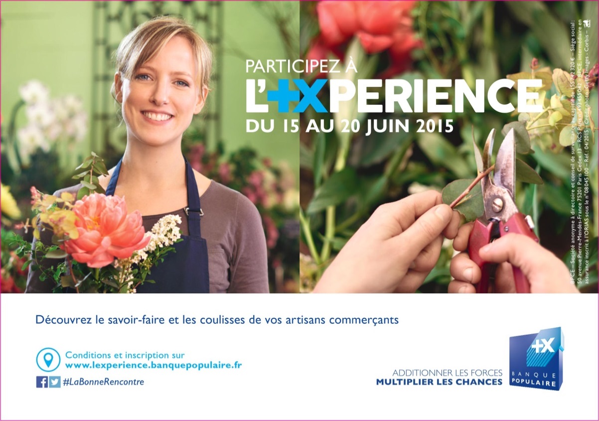 Affiche de l’événement L’+xpérience par Banque Populaire, valorisant le savoir-faire des artisans commerçants du 15 au 20 juin 2015.