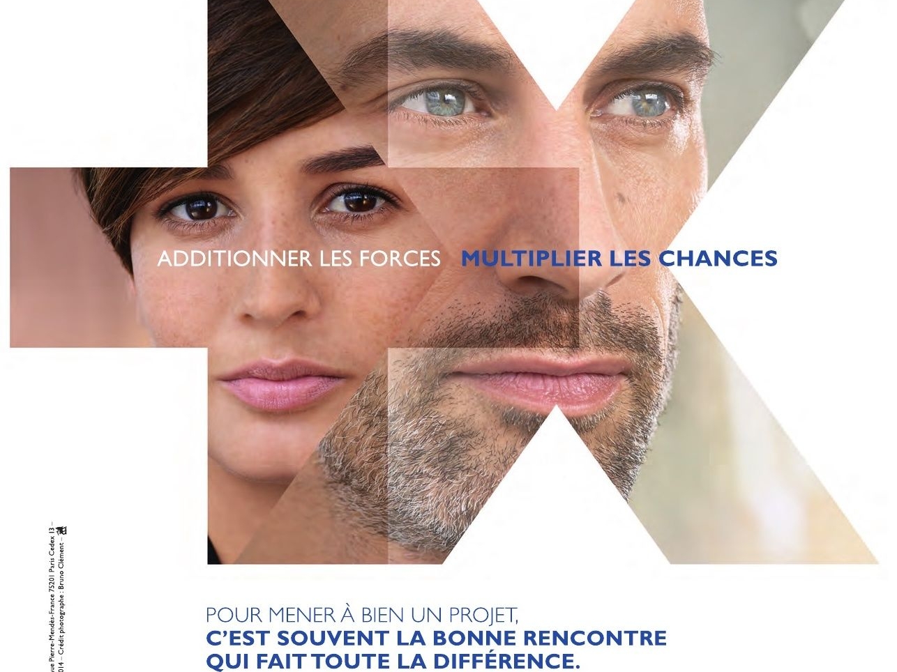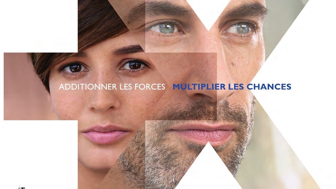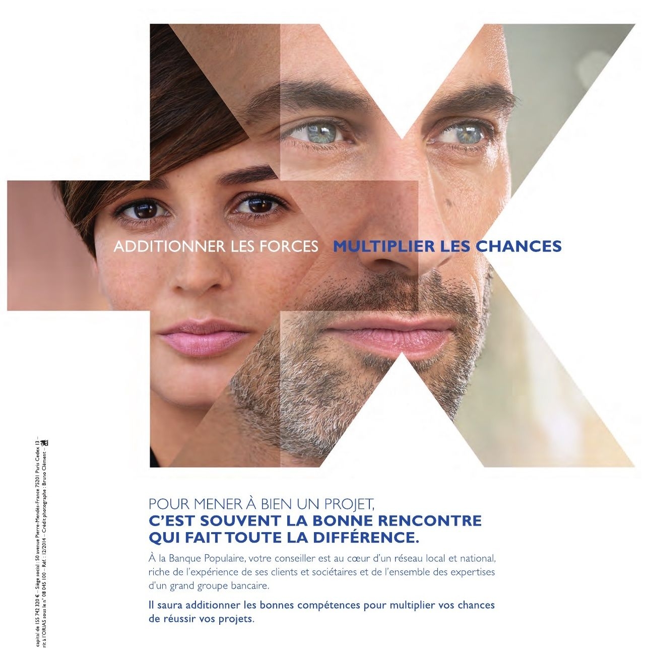 Affiche de la campagne Banque Populaire, mettant en avant la nouvelle signature 'Additionner les forces, multiplier les chances' avec visages superposés symbolisant la rencontre et la mise en réseau.