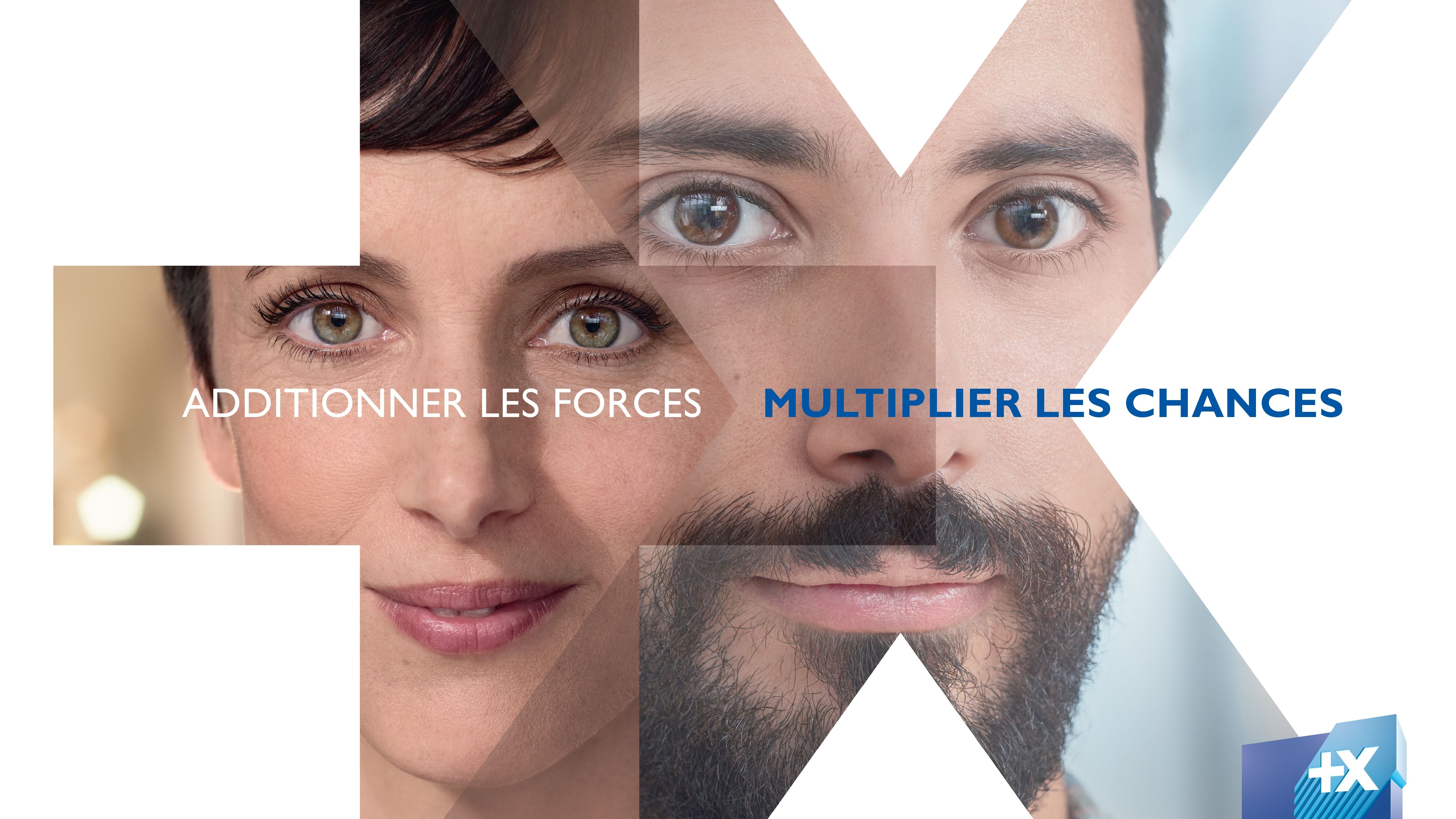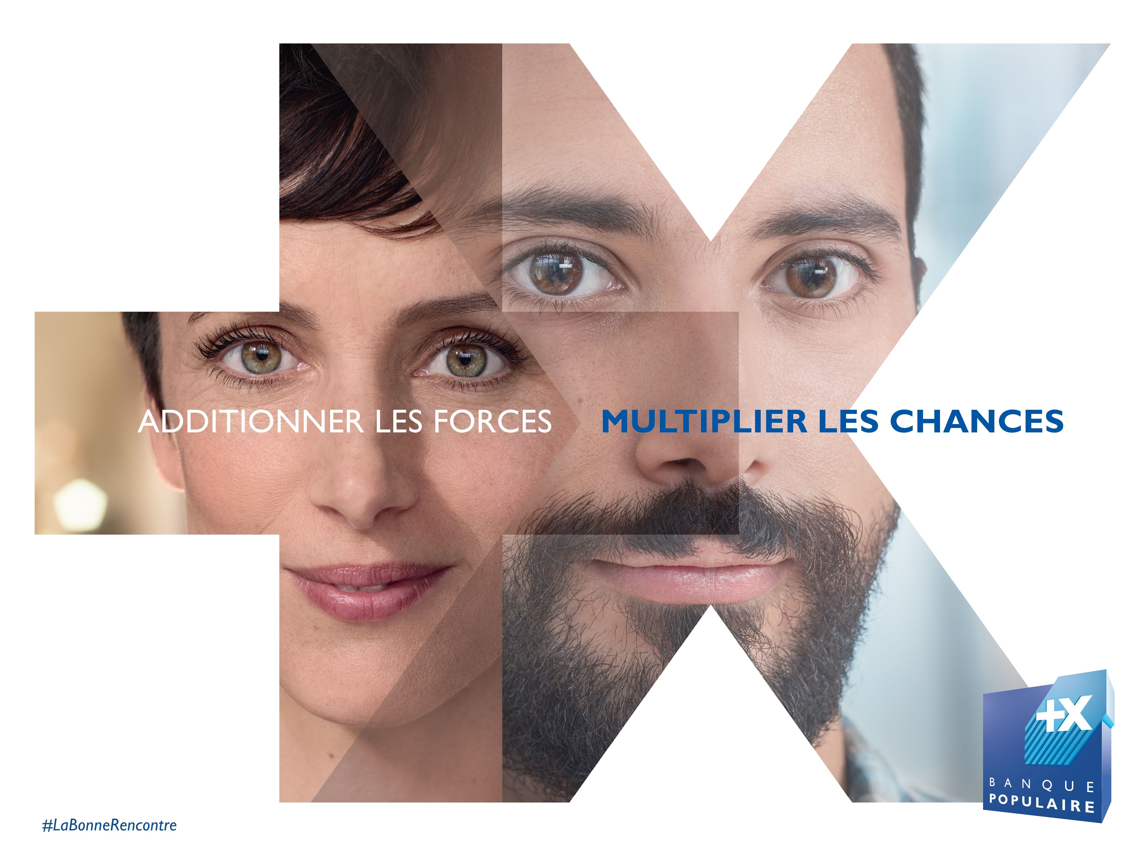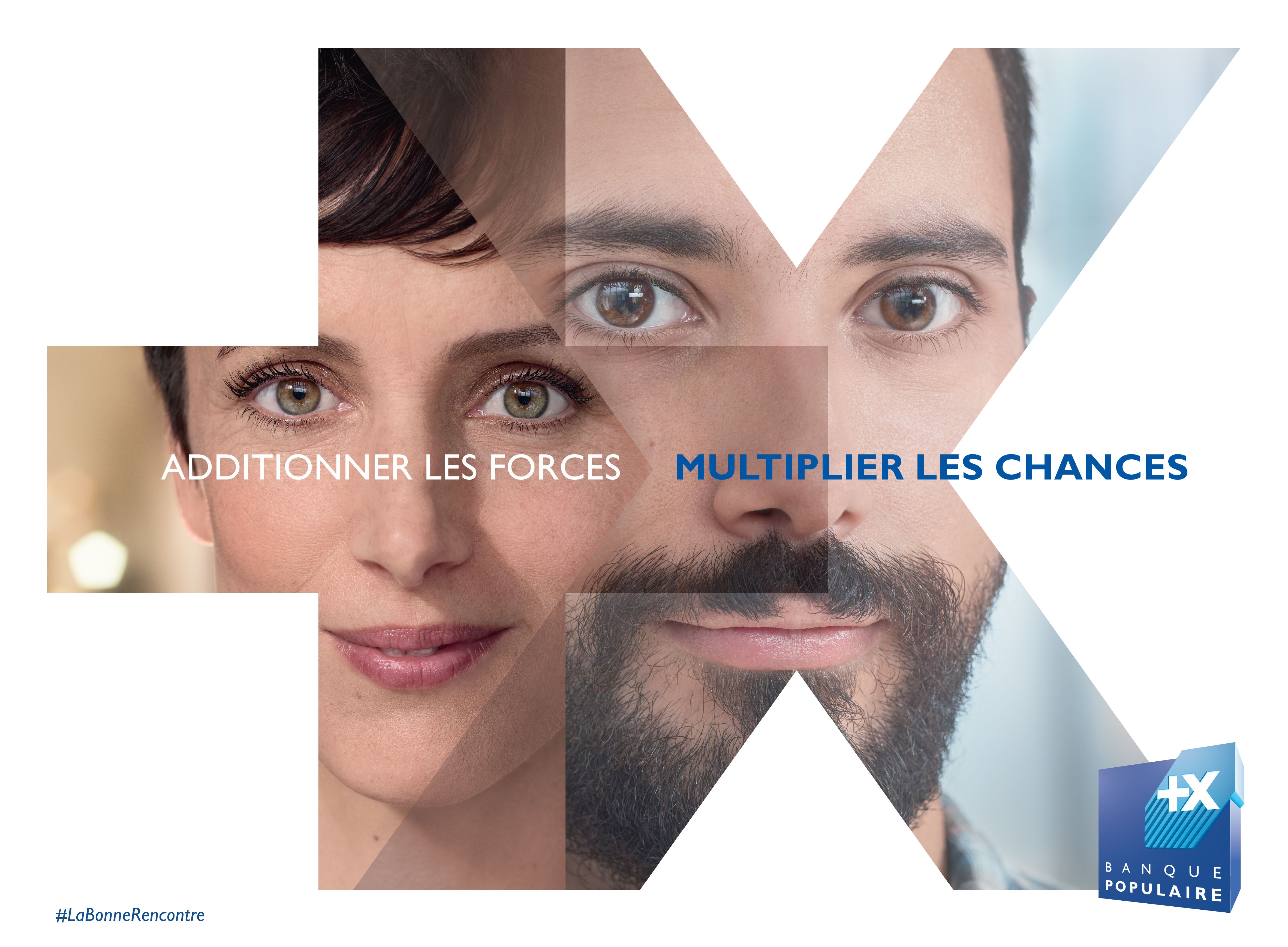 Visuel de la campagne Banque Populaire avec la signature 'Additionner les forces, multiplier les chances', illustrant la nouvelle image de marque.