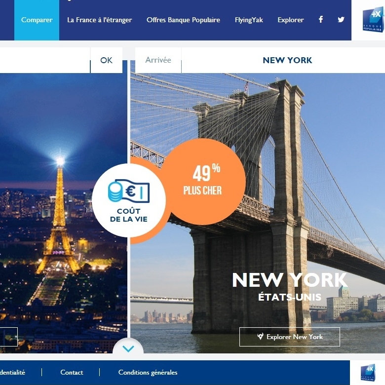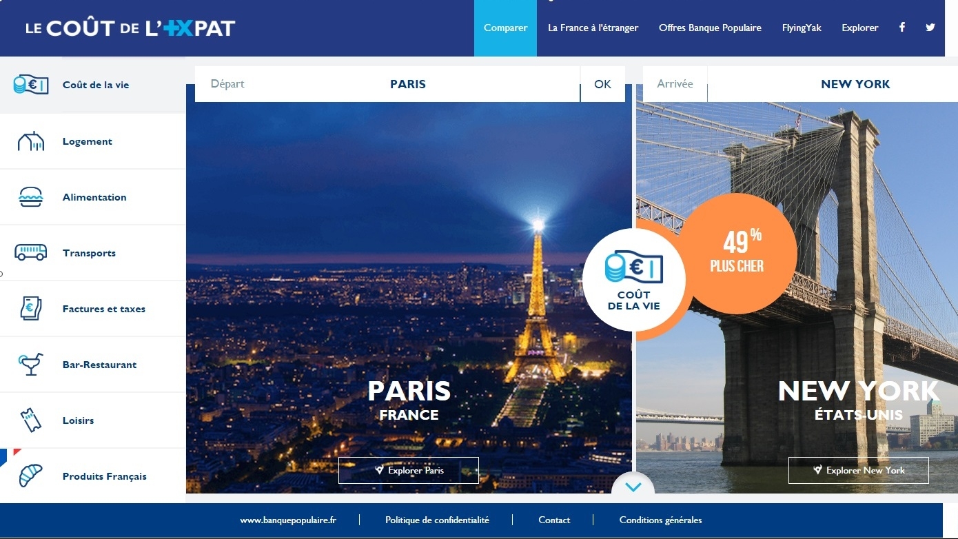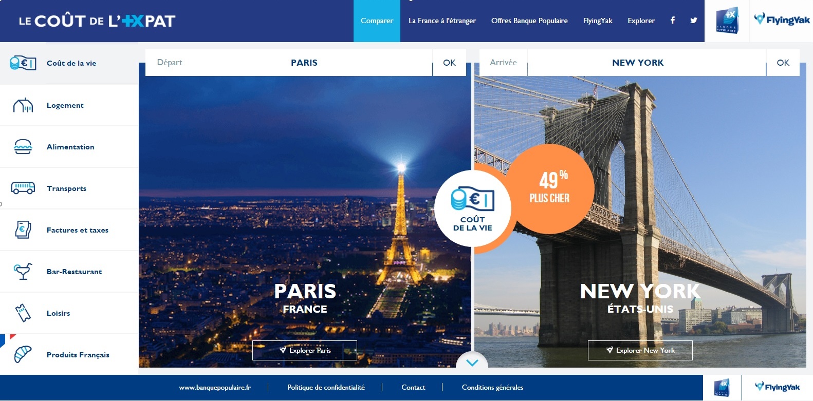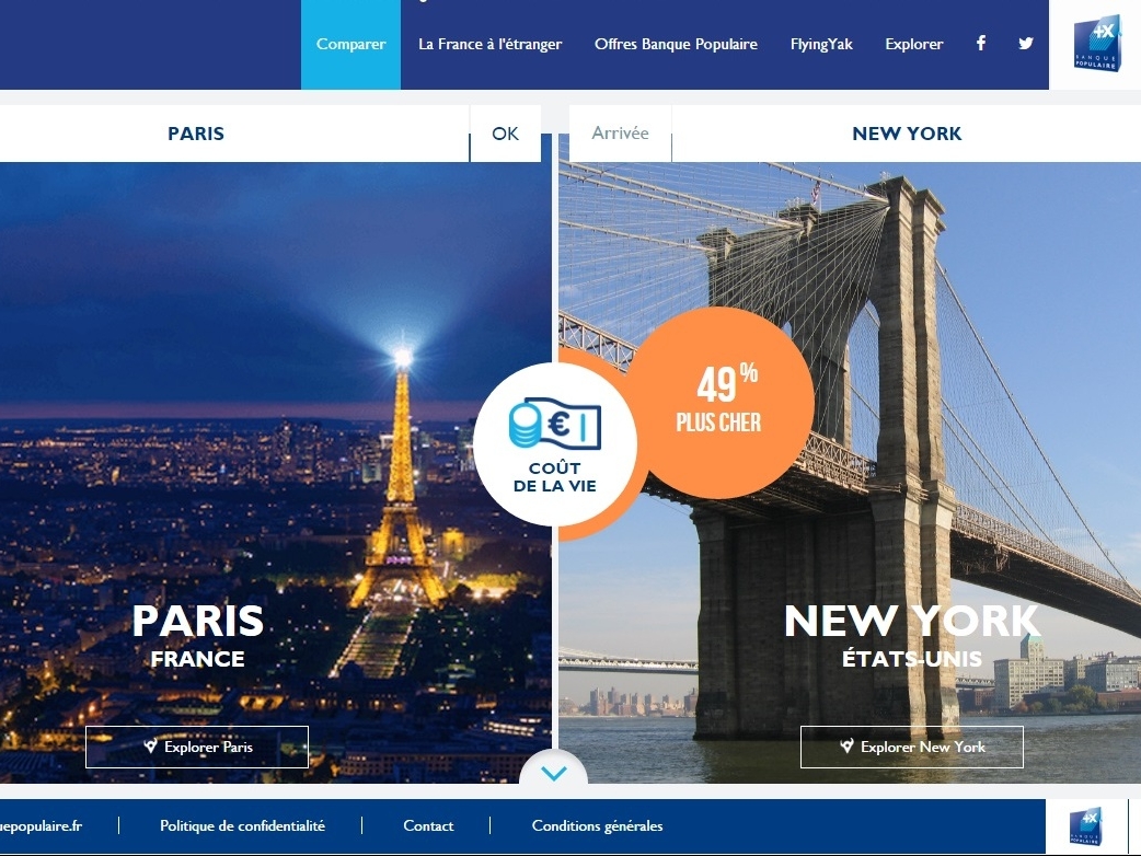 Interface du comparateur Banque Populaire affichant un coût de la vie à New York 49% plus cher qu'à Paris, illustrée par la tour Eiffel et le pont de Brooklyn.