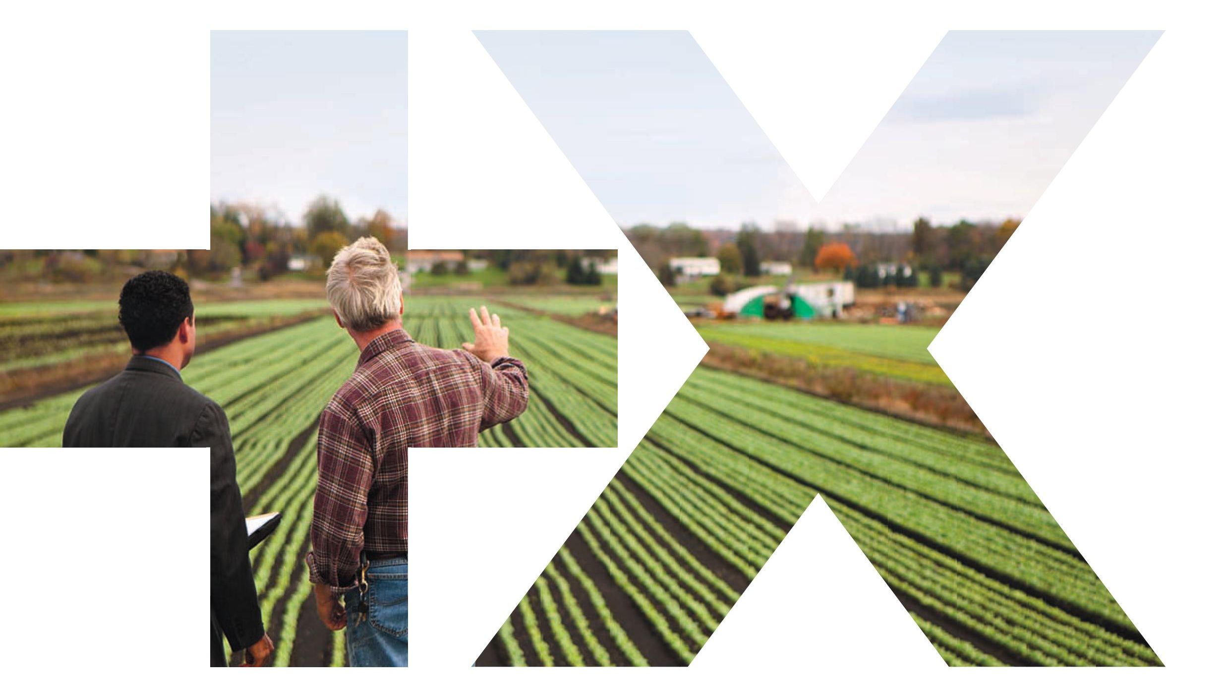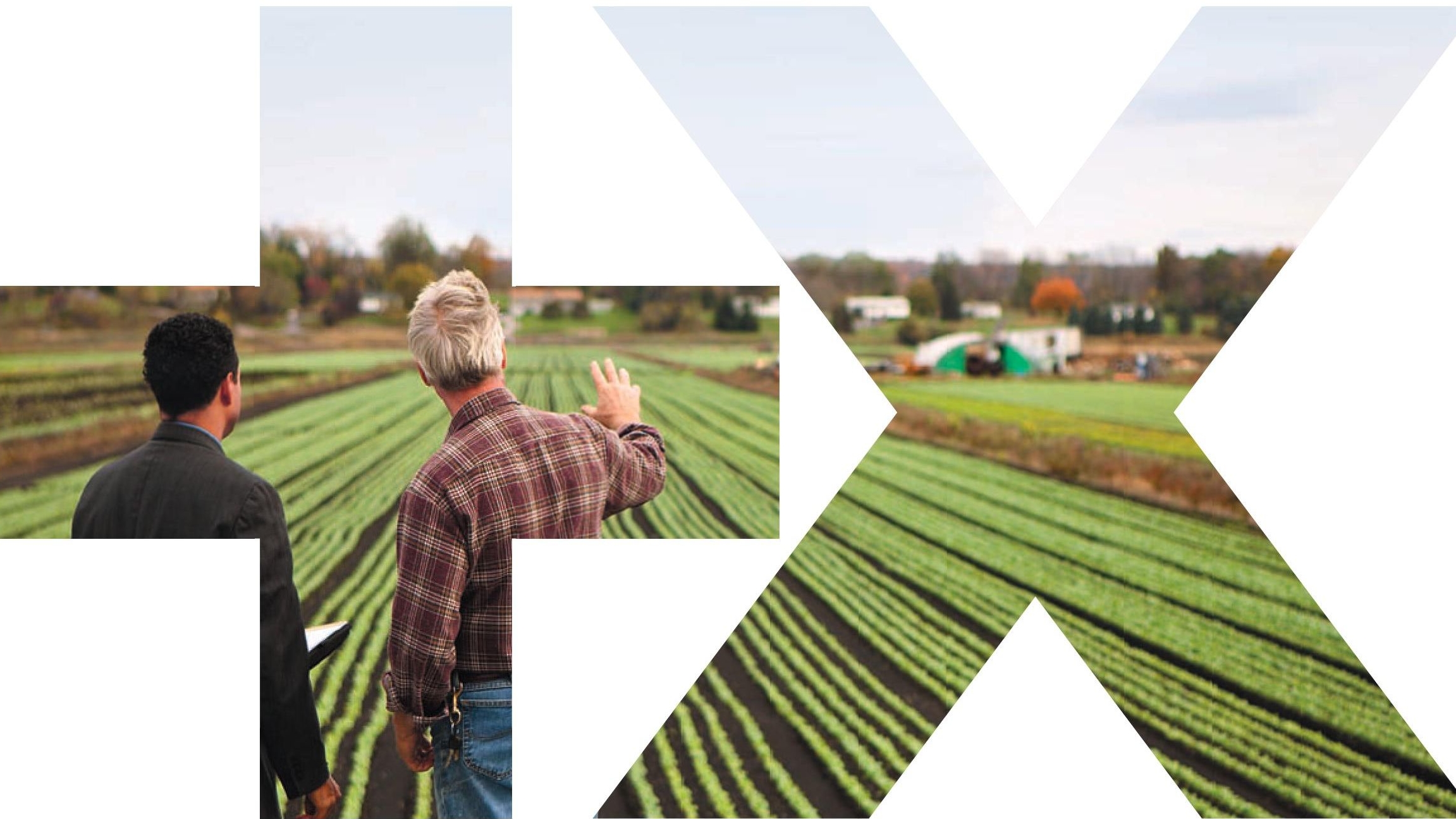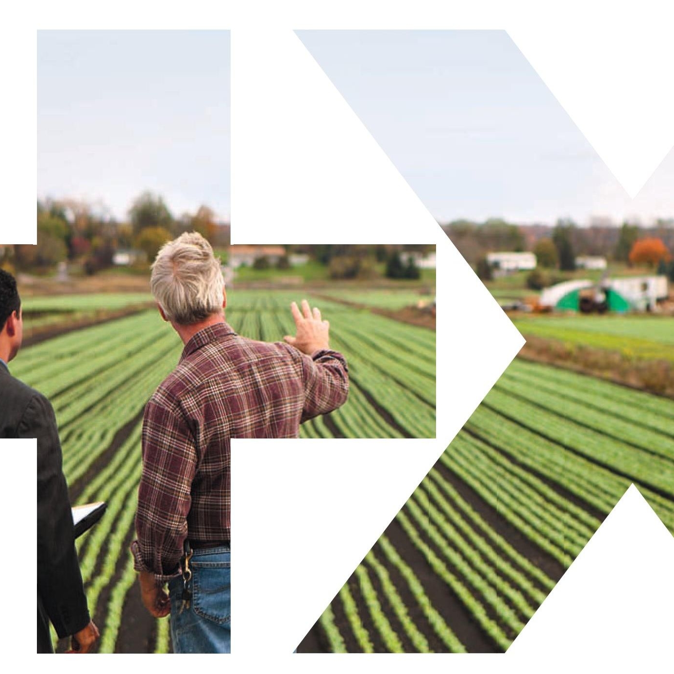 Deux personnes observent une exploitation agricole moderne avec des rangées de cultures, symbolisant l’innovation et le développement durable dans l’agriculture.