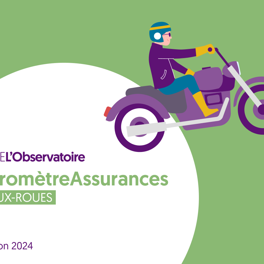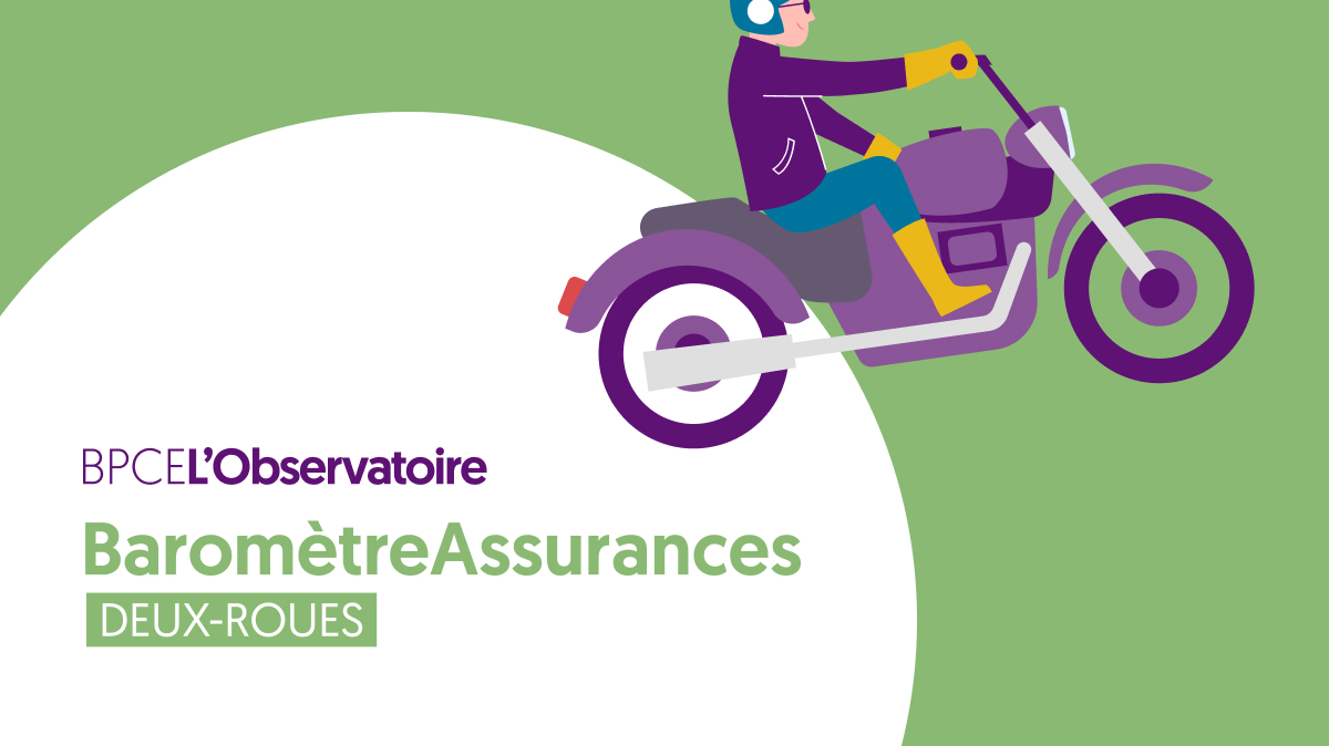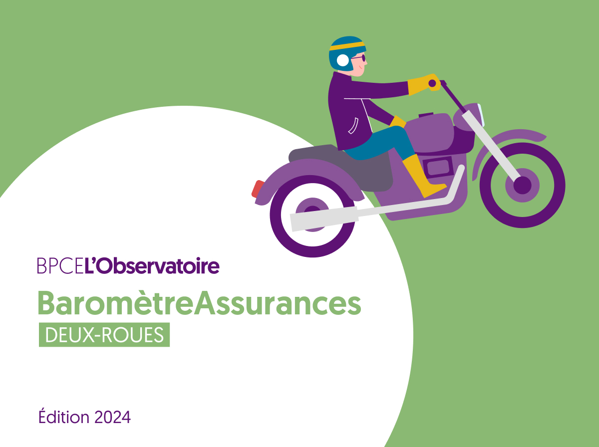 Couverture du Baromètre Assurances deux-roues 2024 de BPCE L’Observatoire, avec illustration stylisée d’un motard sur fond vert.