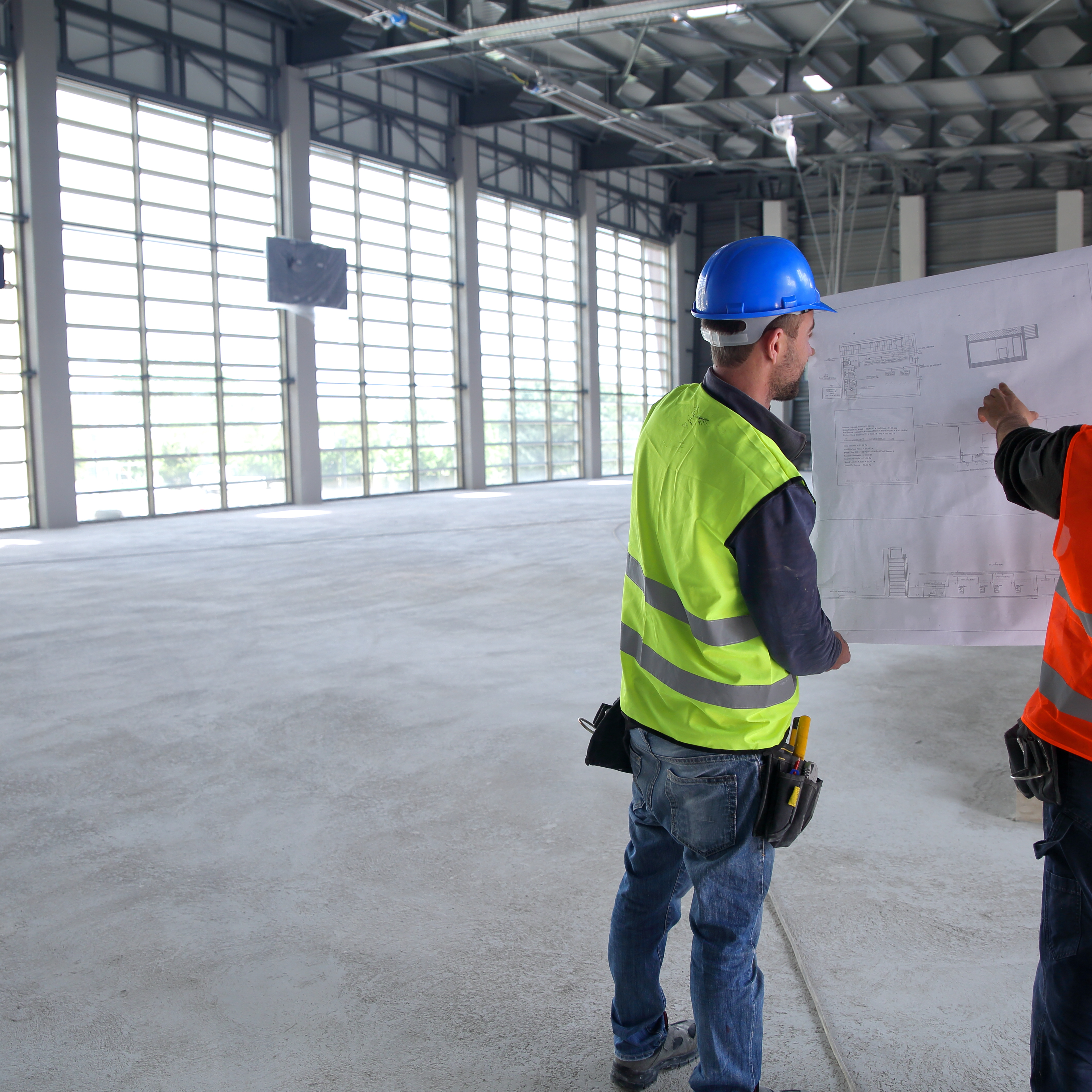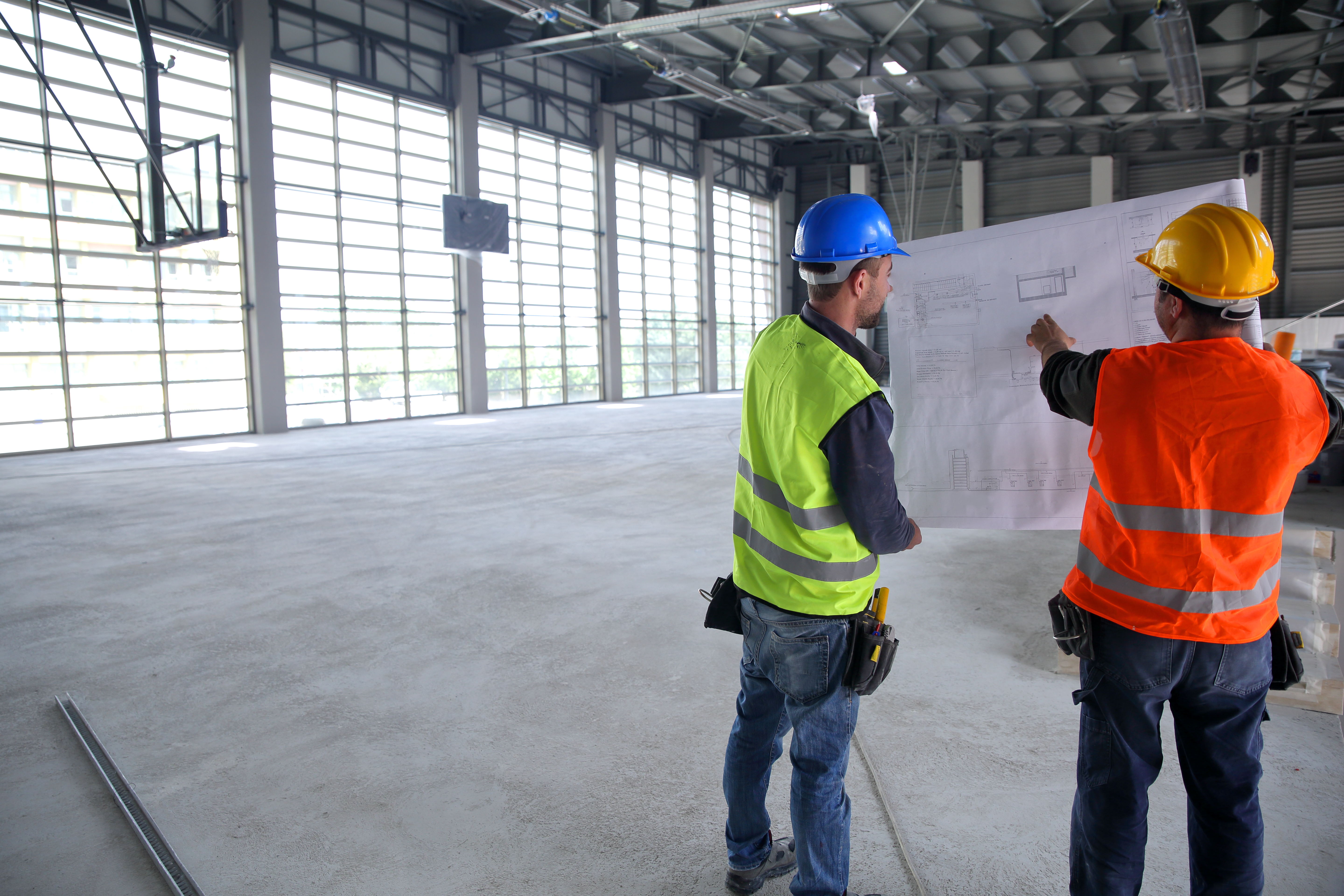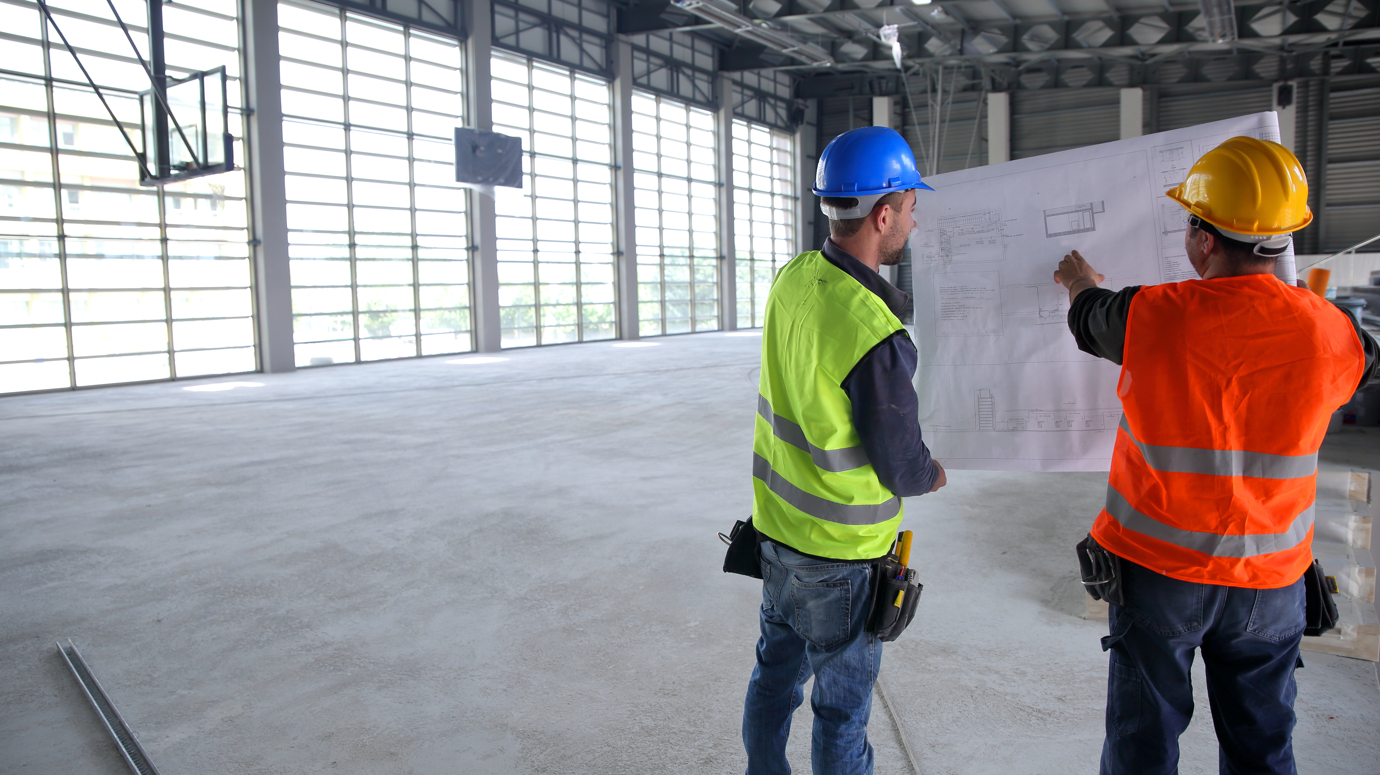 Deux ingénieurs examinent les plans d'un futur complexe sportif en cours de construction, dans un grand gymnase lumineux équipé de panneaux vitrés et de paniers de basket.