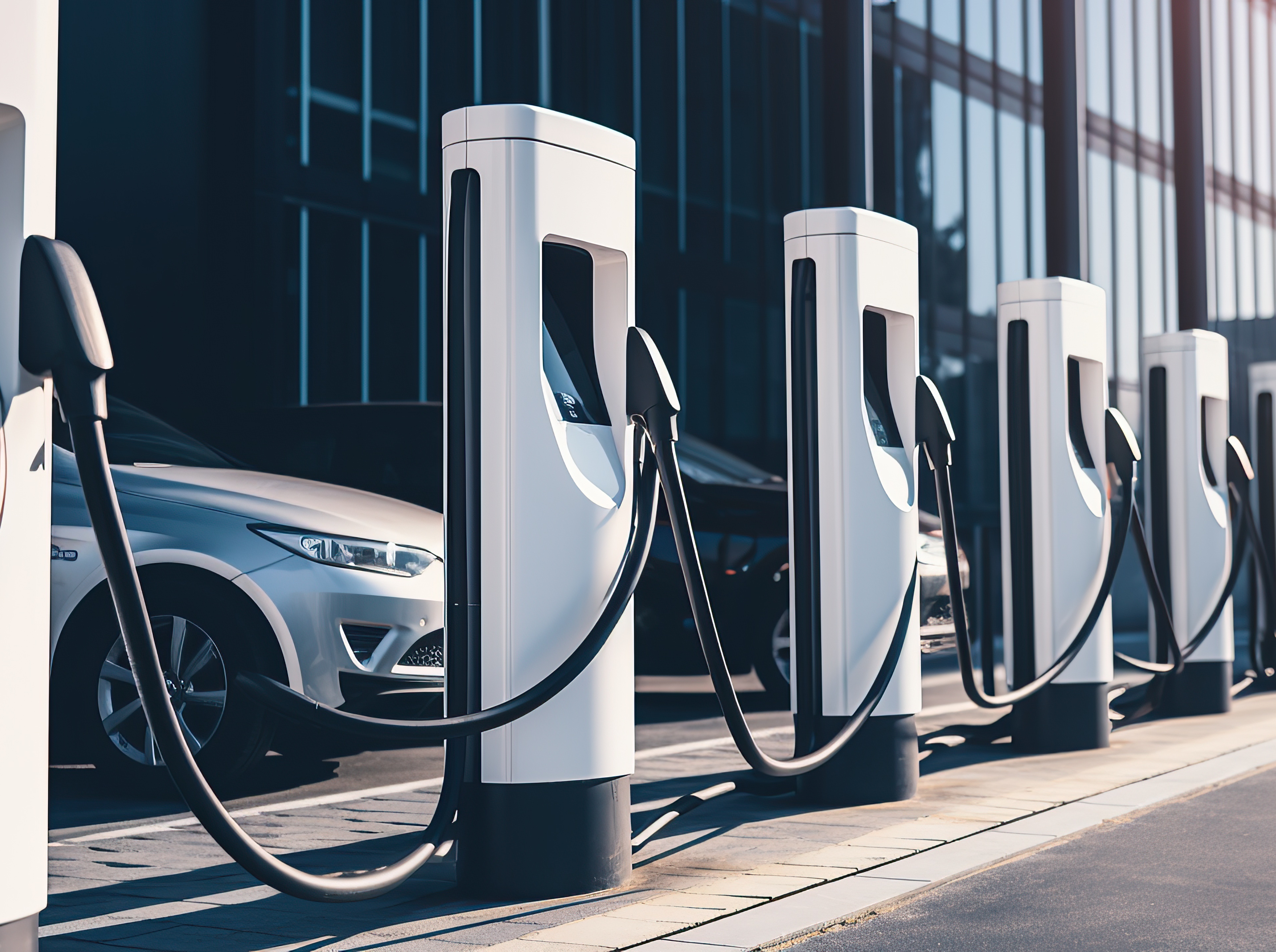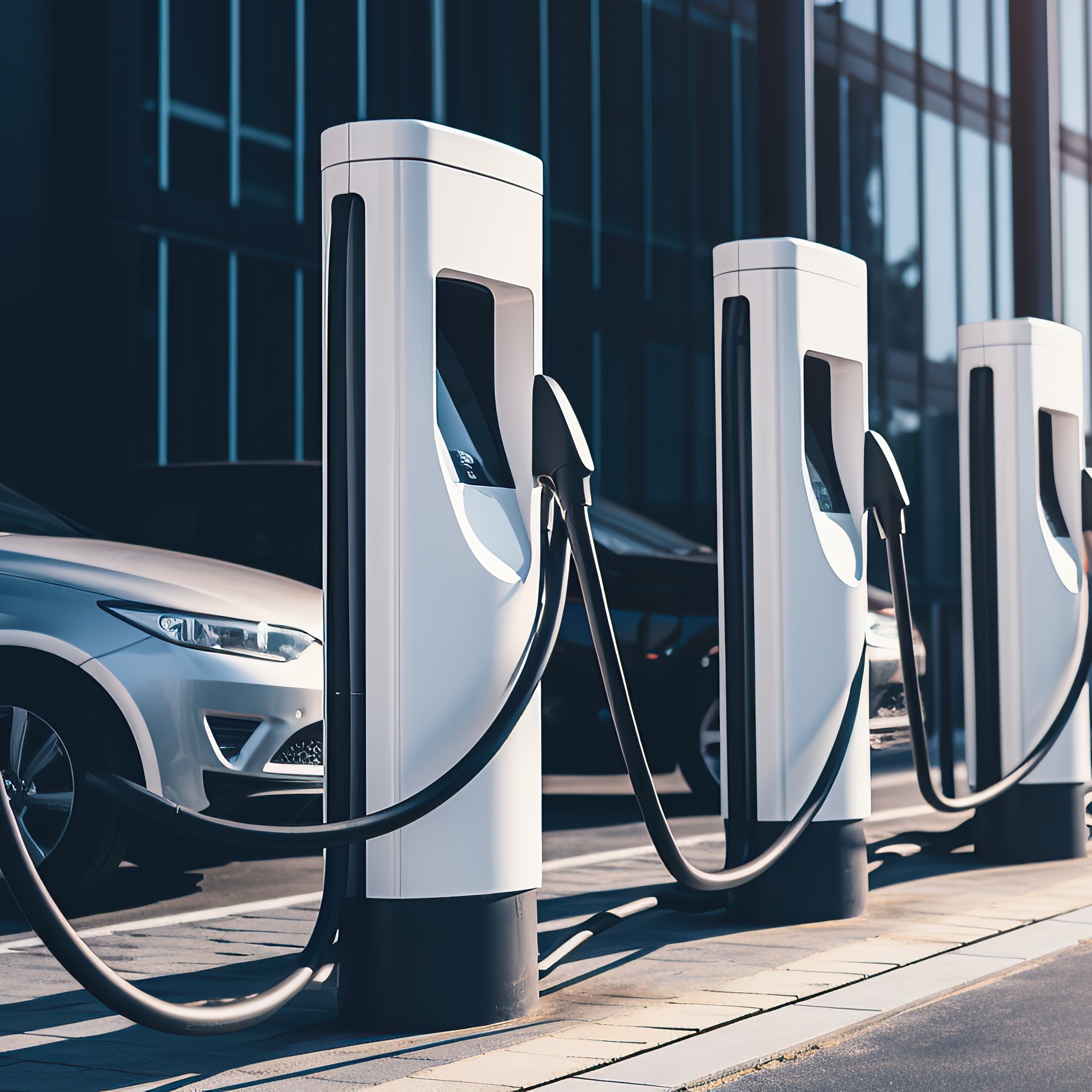 Bornes de recharge pour véhicules électriques alignées devant un bâtiment moderne, illustrant l'infrastructure urbaine dédiée à la mobilité durable et à la transition énergétique.