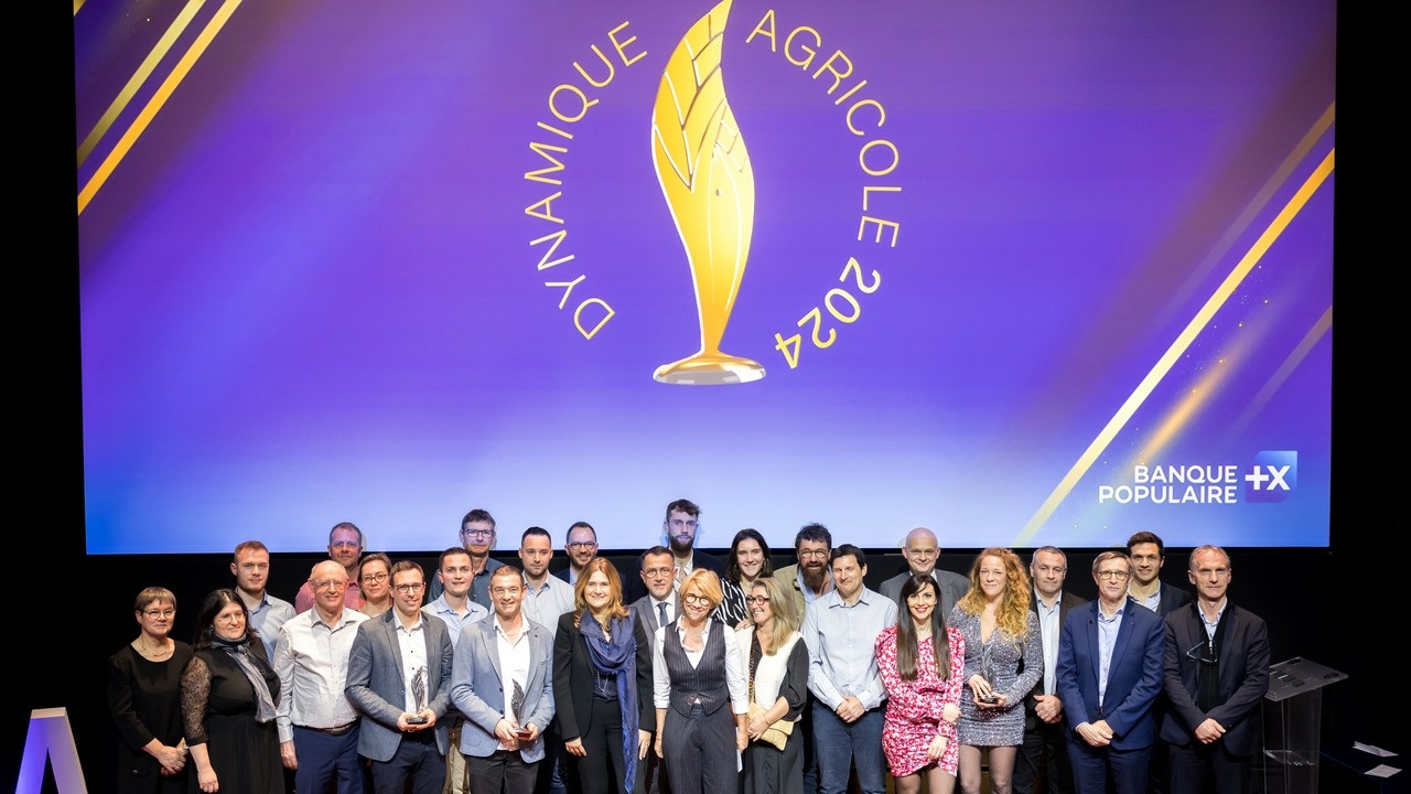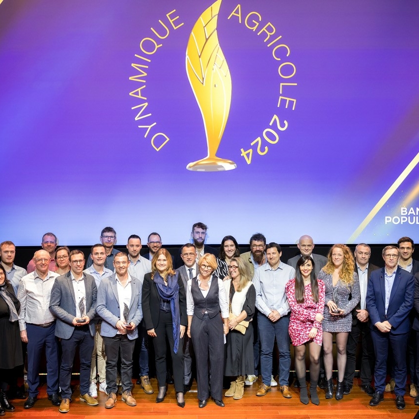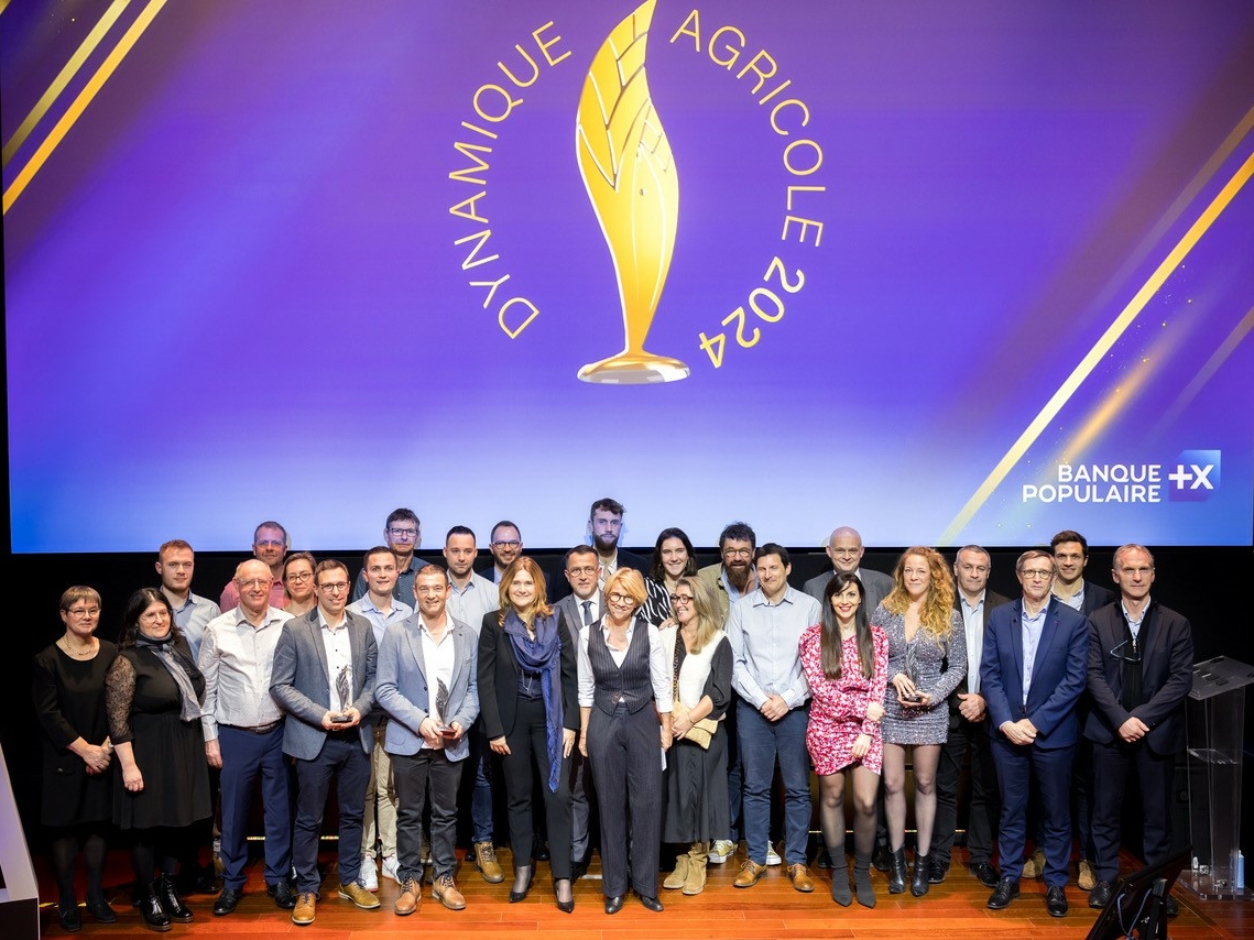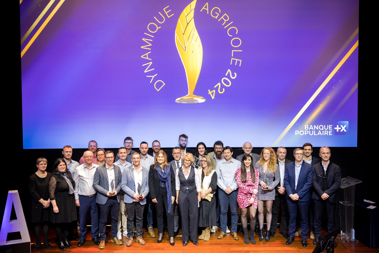 Photo de groupe lors de la remise du Prix National de la Dynamique Agricole 2024 par Banque Populaire, réunissant les lauréats et organisateurs devant un écran arborant le logo du prix.
