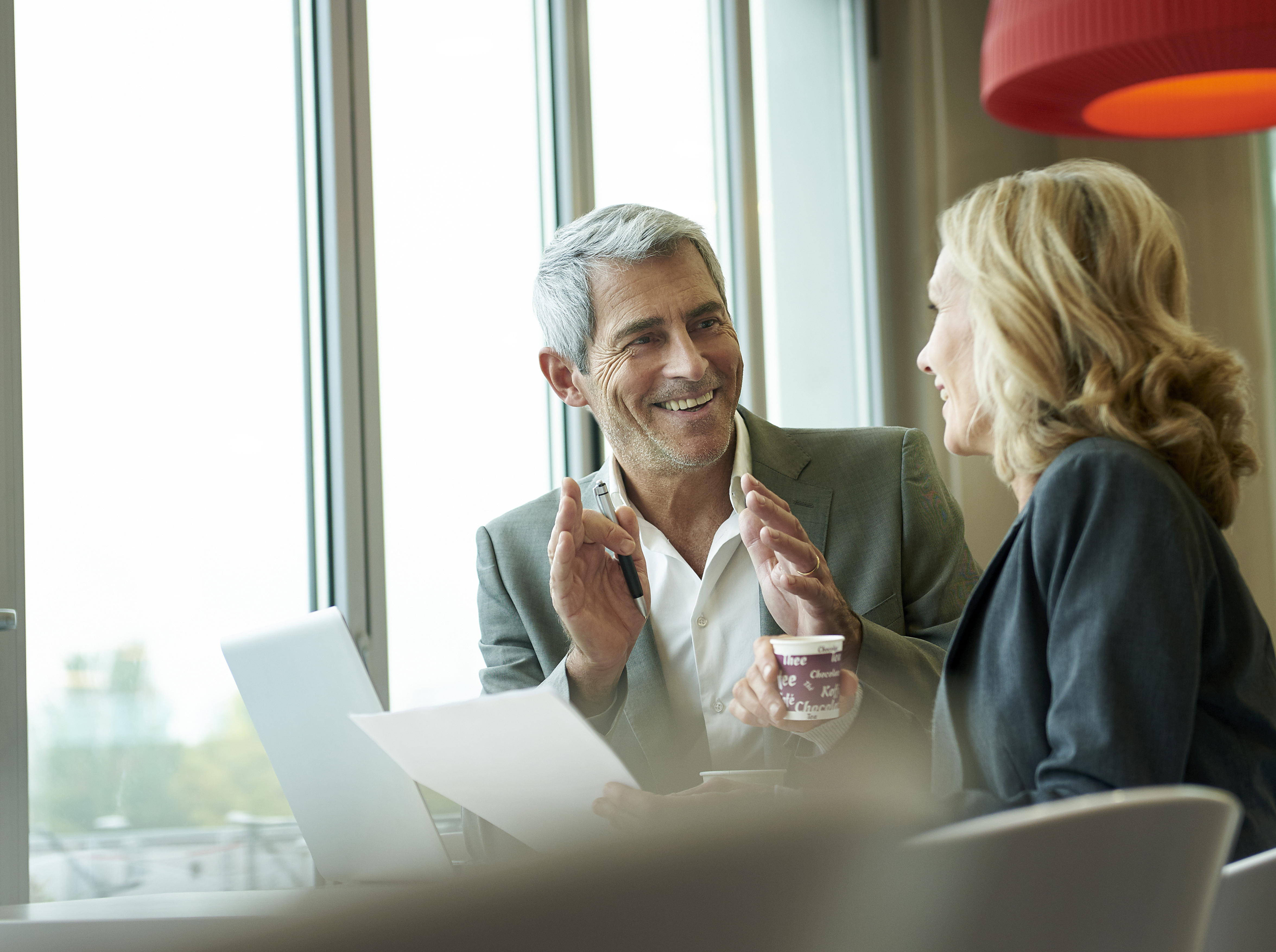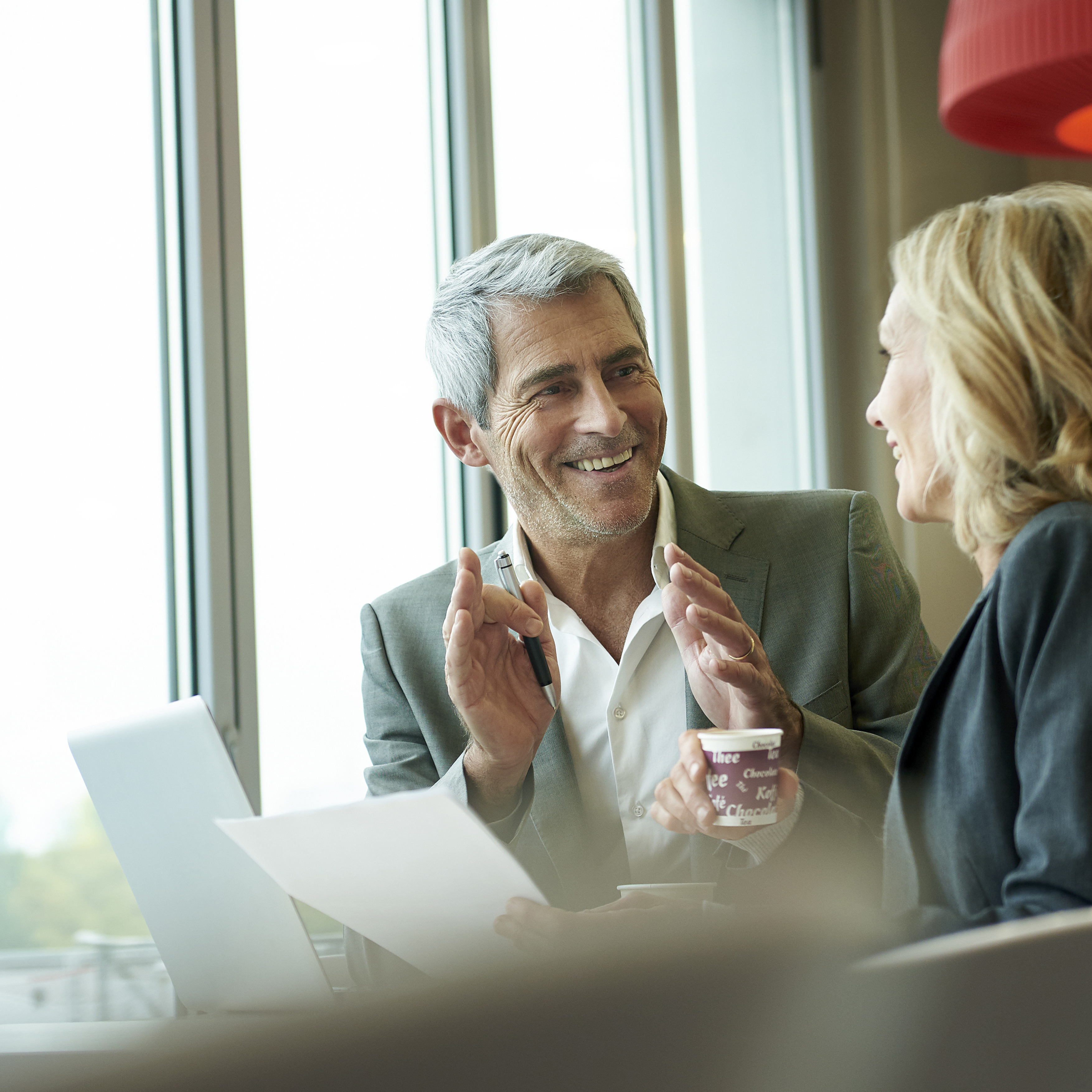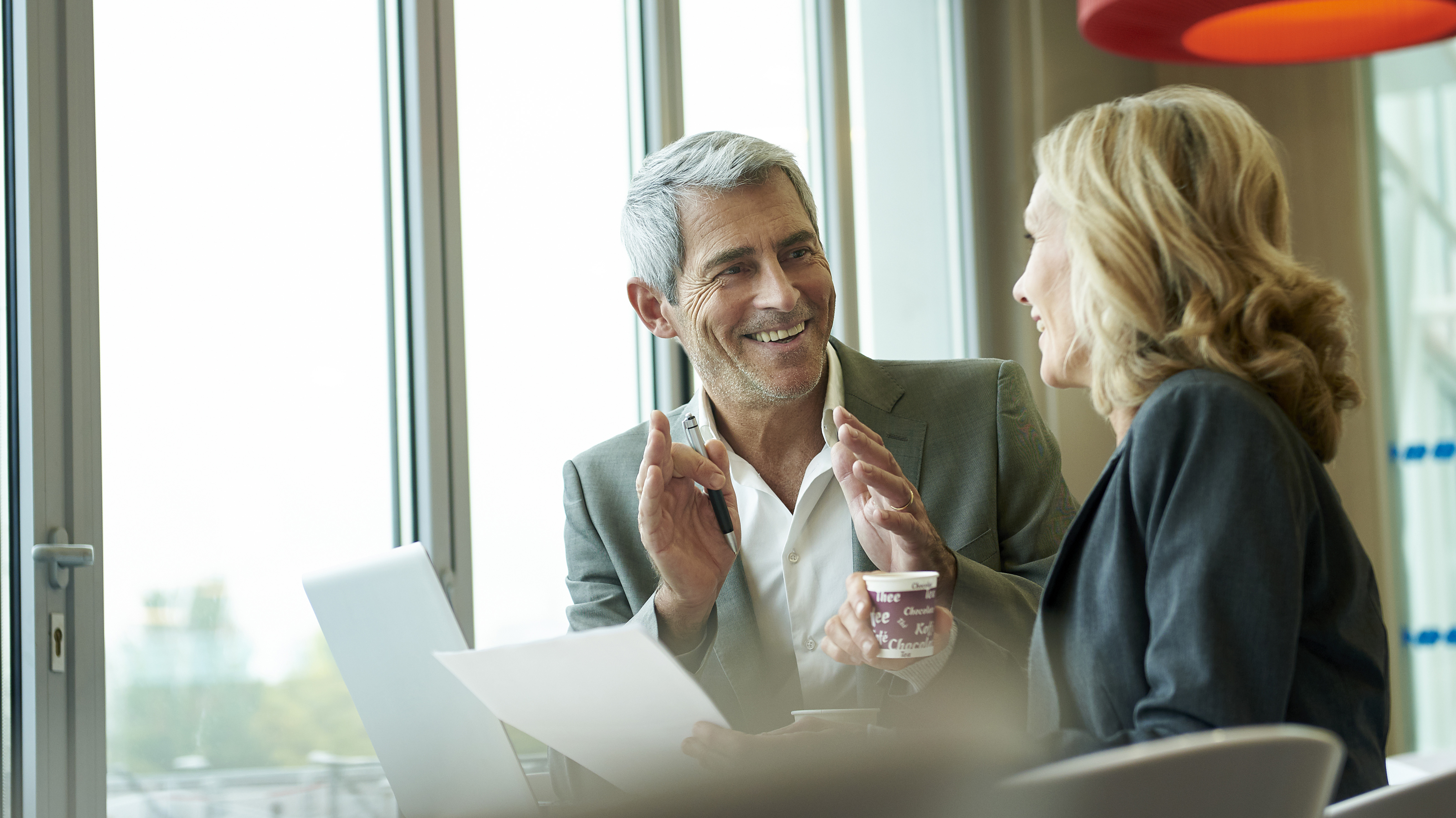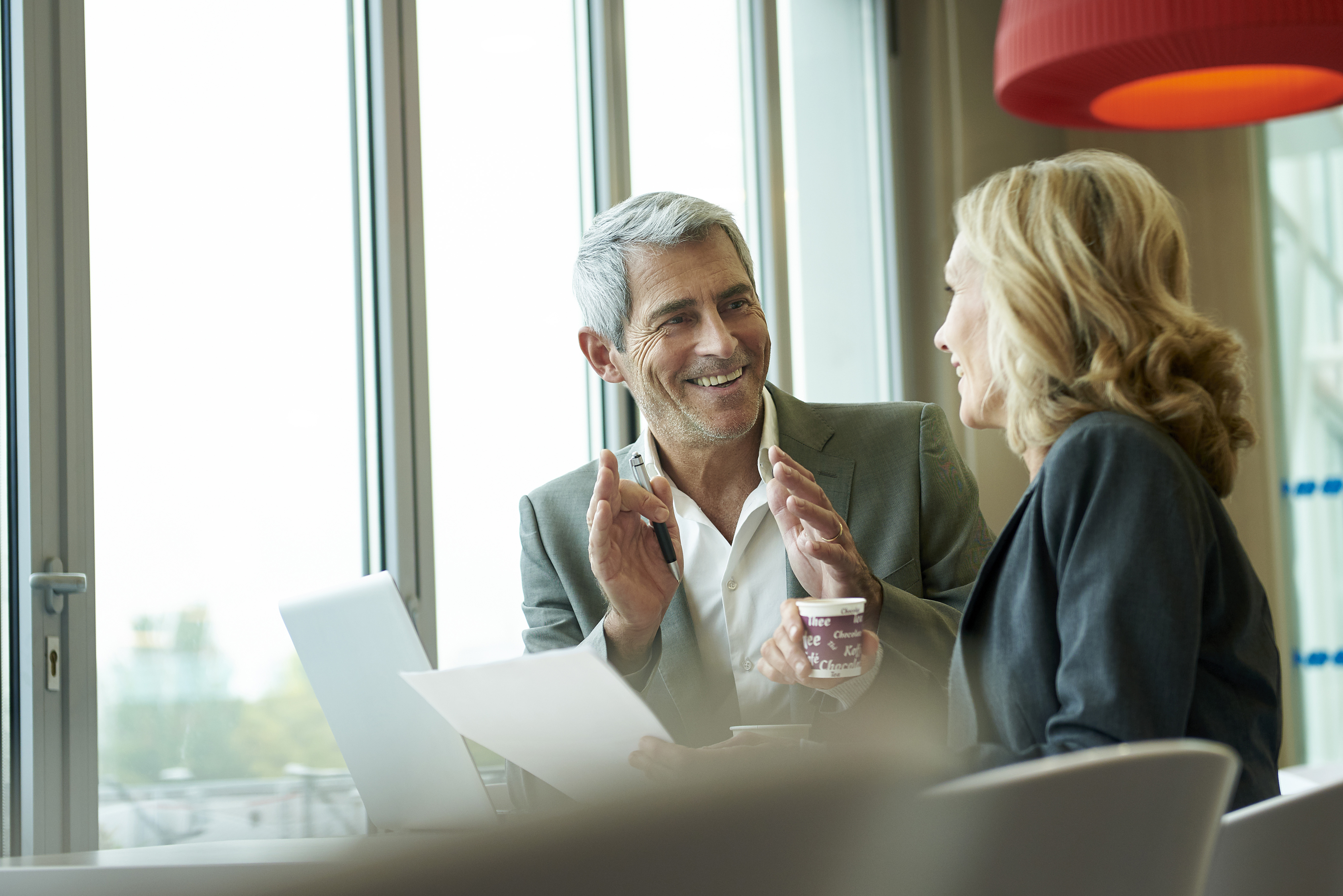 Deux professionnels échangent dans un bureau lumineux avec ordinateur portable et documents lors d'une réunion afin d'illustrer le 5e chapitre de l'étude sur la franchise Banque Populaire FFF.