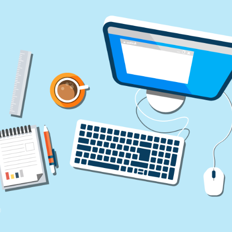 Illustration d'un espace de travail numérique avec un ordinateur, carnet, café et logo e-cotiz, représentant la gestion digitale des cotisations associatives.