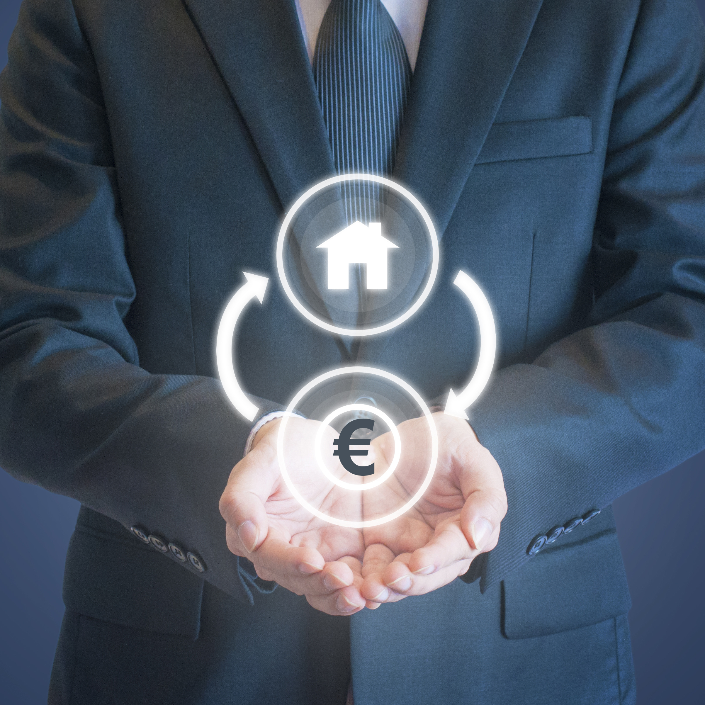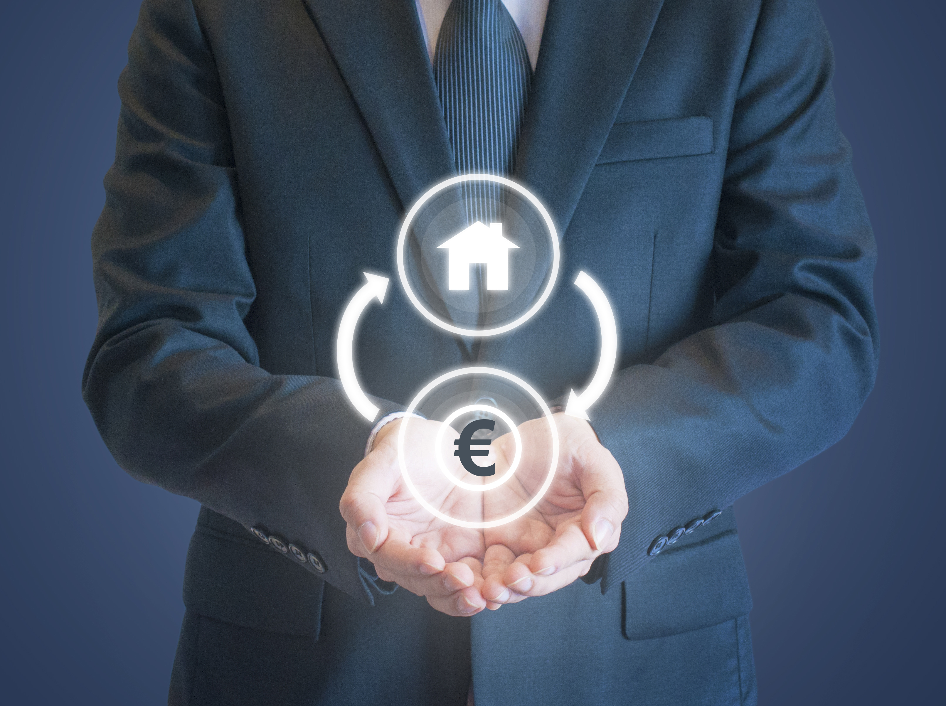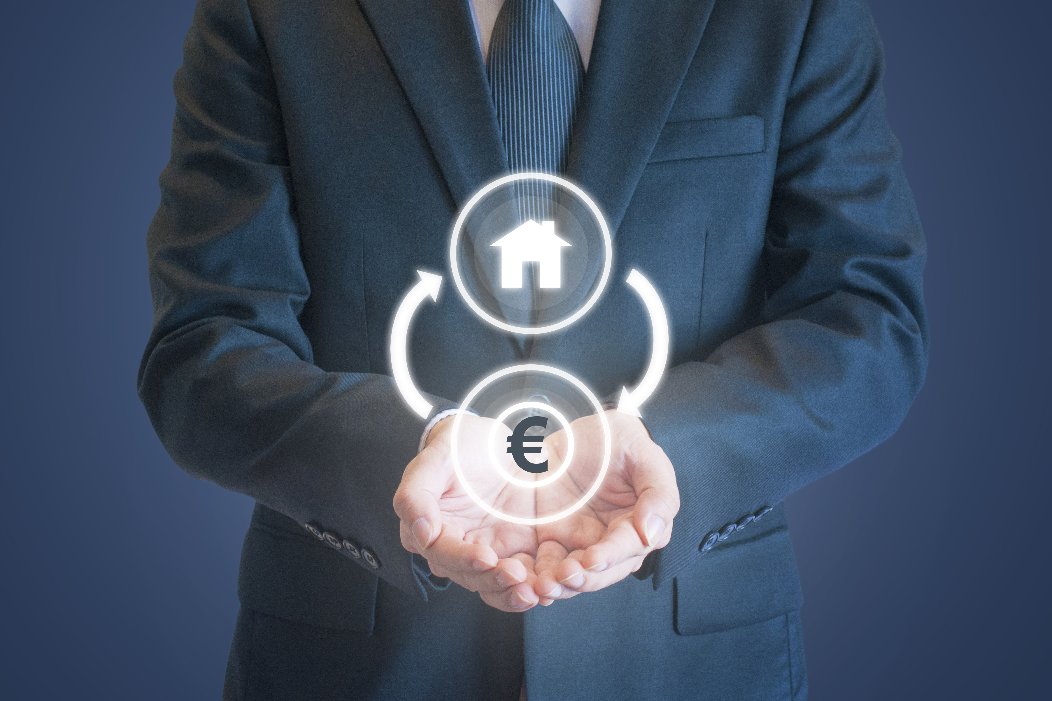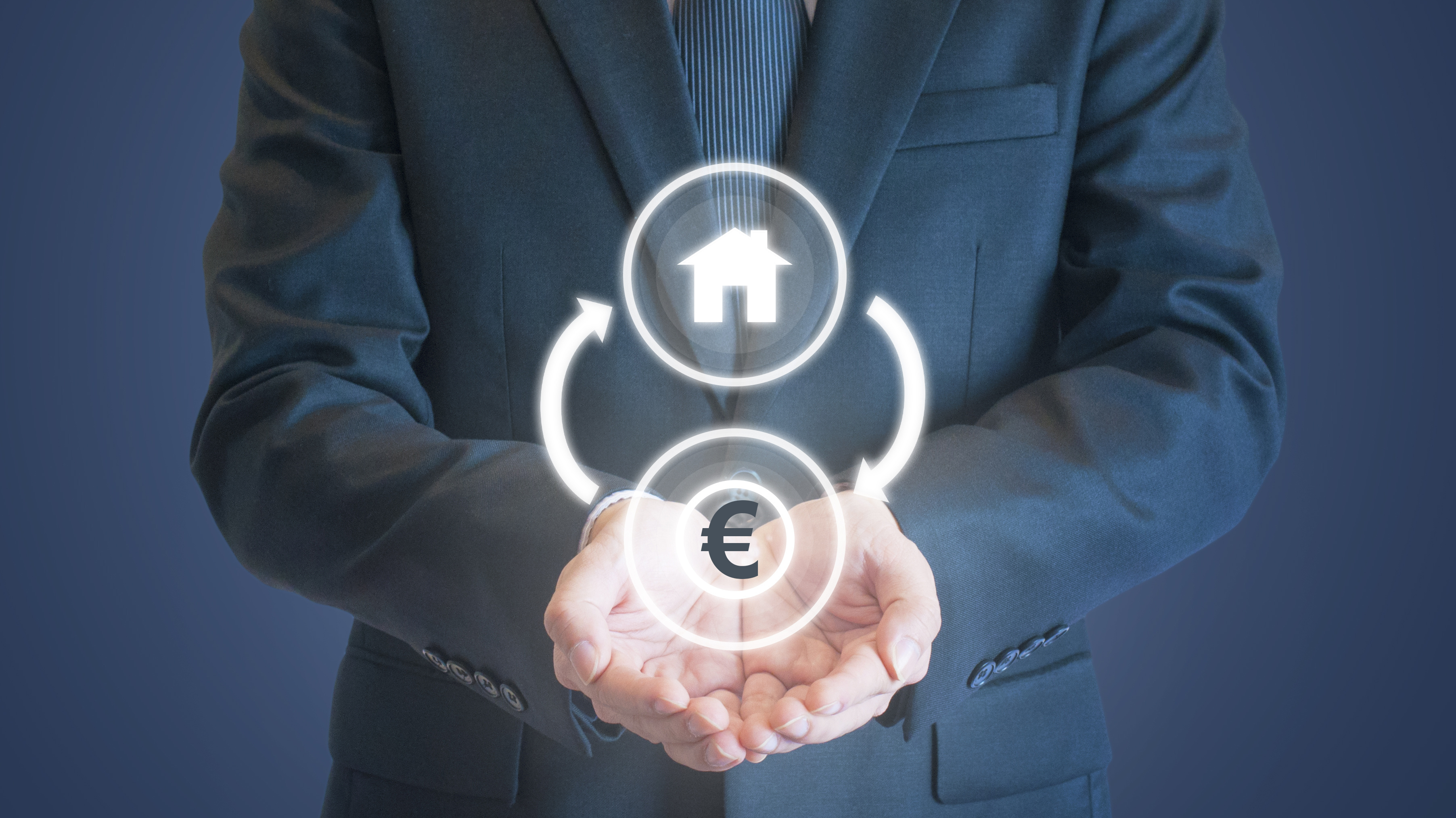 Un homme en costume présente un schéma digital illustrant la circulation entre un actif immobilier et l’euro, symbolisant un mécanisme financier d’investissement ou de fiducie sûreté.