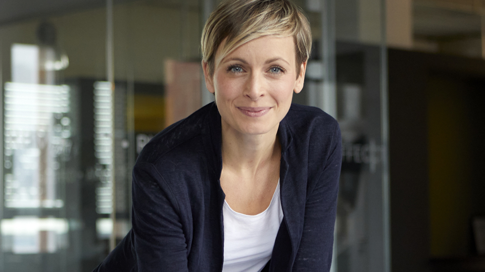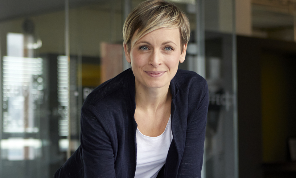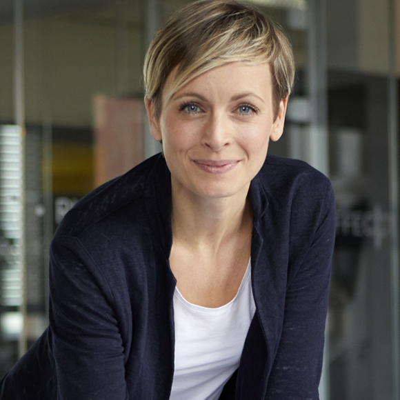 Portrait professionnel d'une femme souriante dans un environnement de bureau moderne, illustrant l'entrepreneuriat ou le monde des affaires.