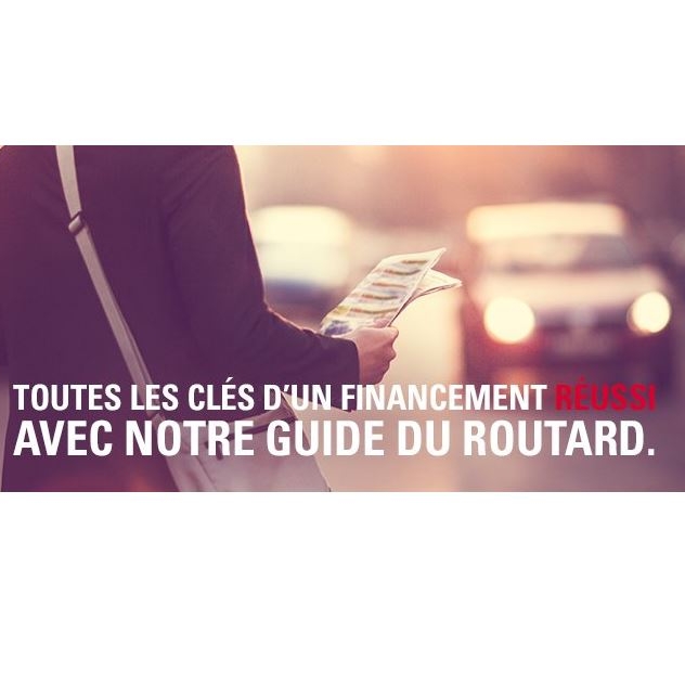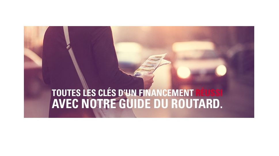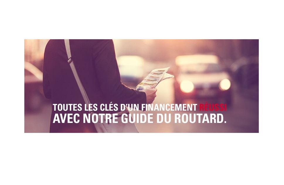 Affiche mettant en avant le Guide du Routard du financement d’entreprise, avec une personne tenant un guide en ville.