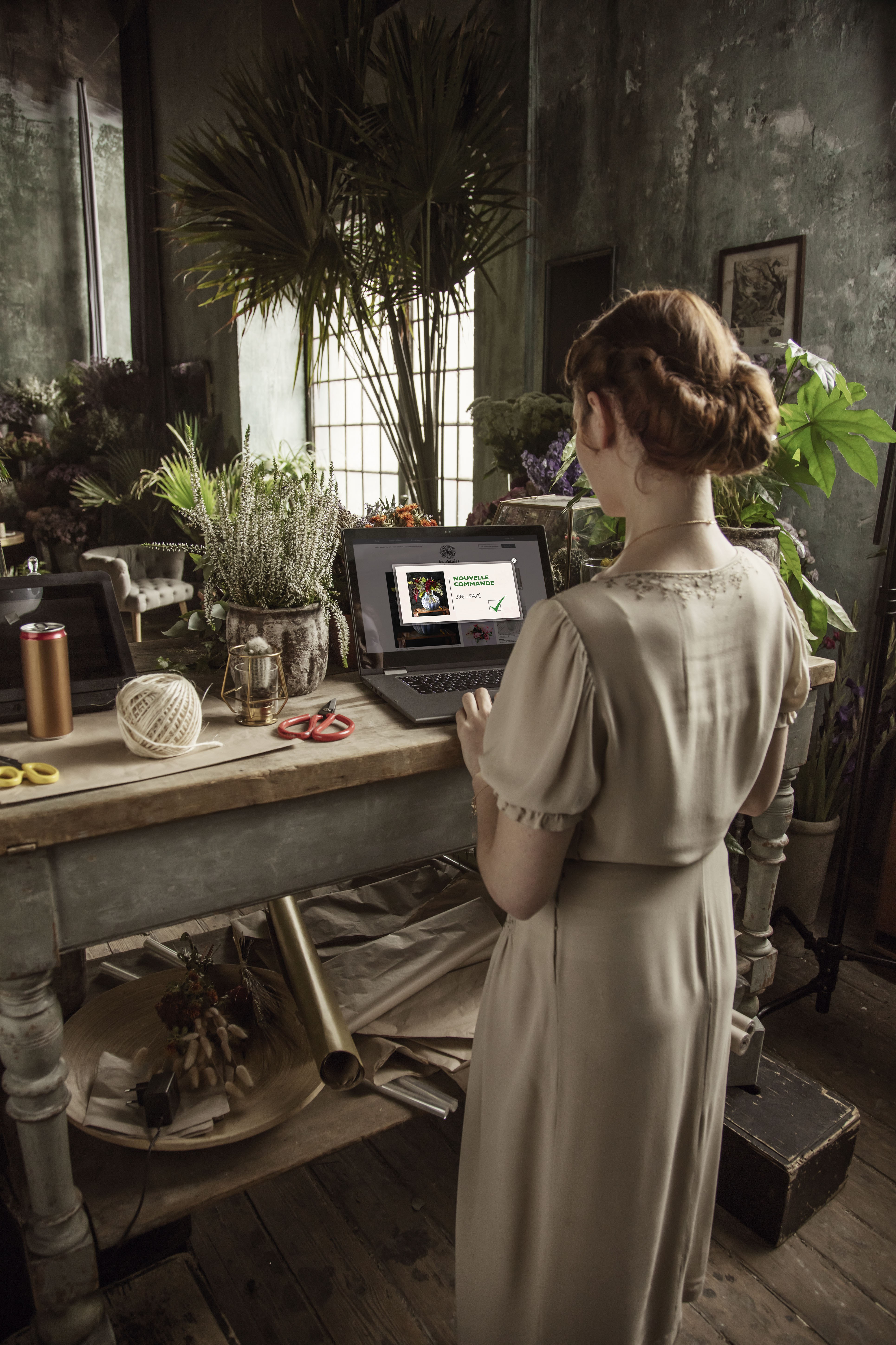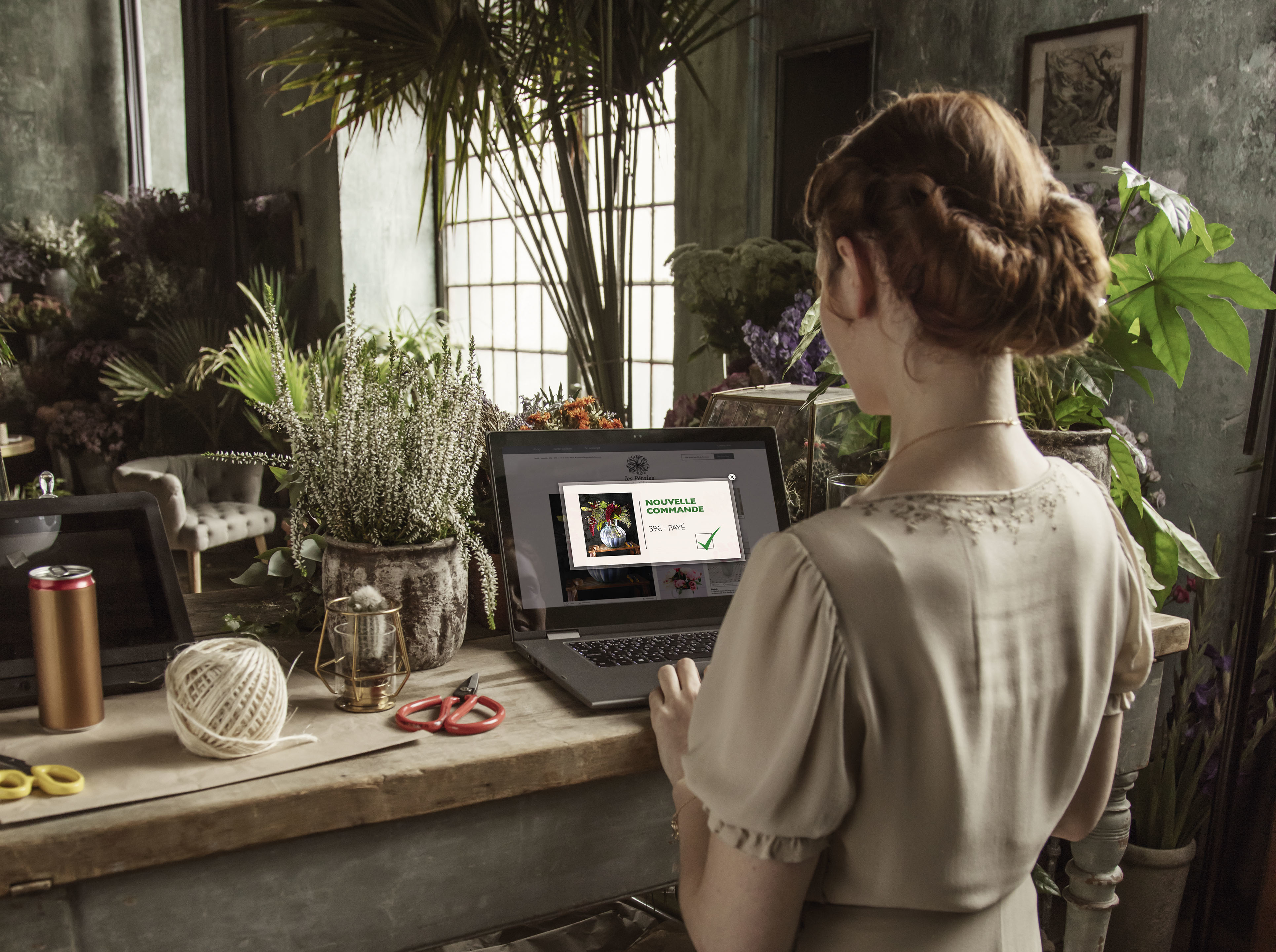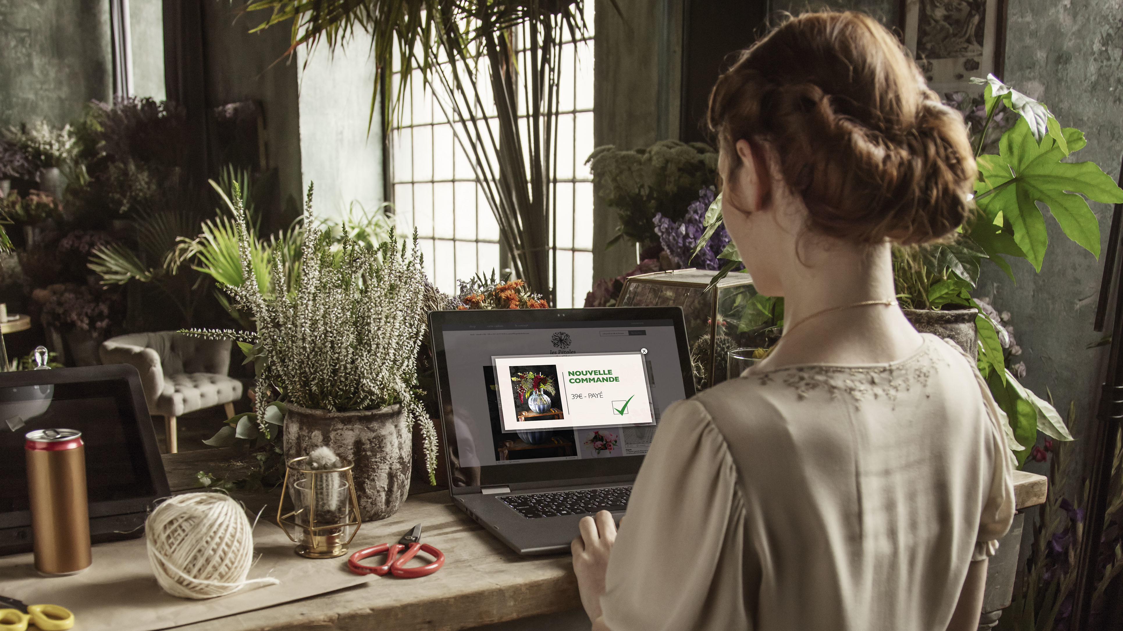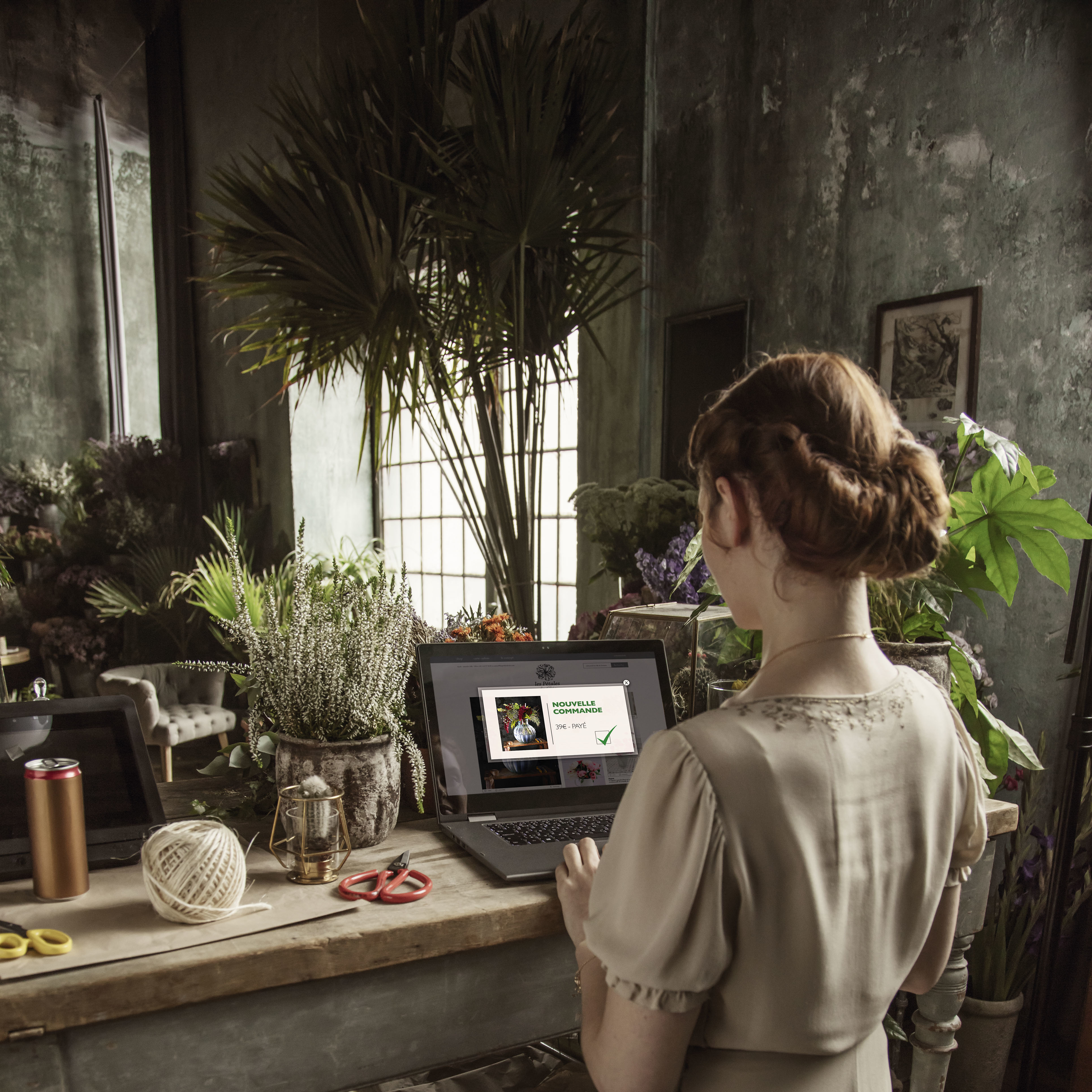 Artisane-commerçante utilisant un ordinateur portable dans son atelier de fleurs, illustrant la transformation digitale des petits commerces.