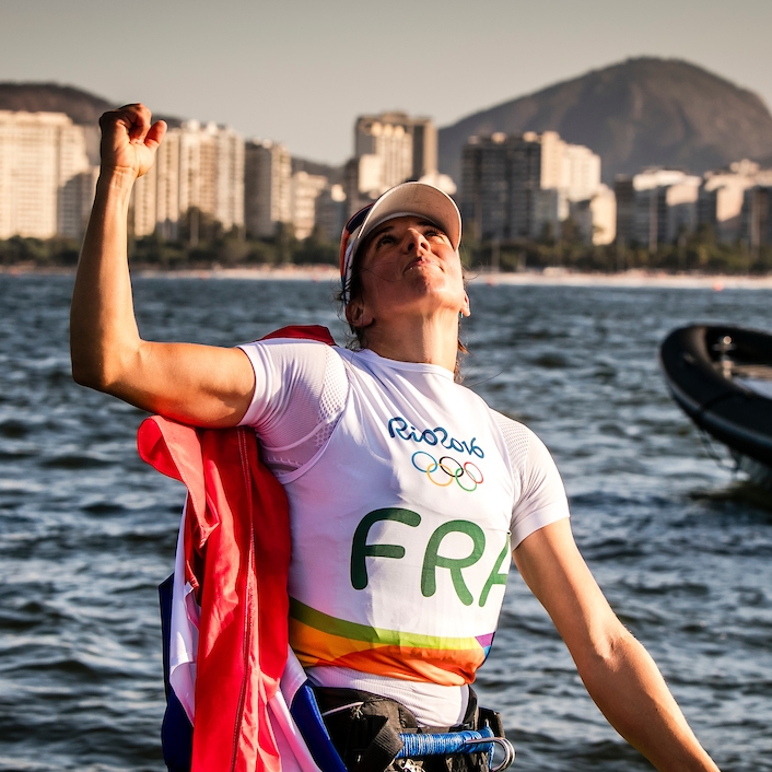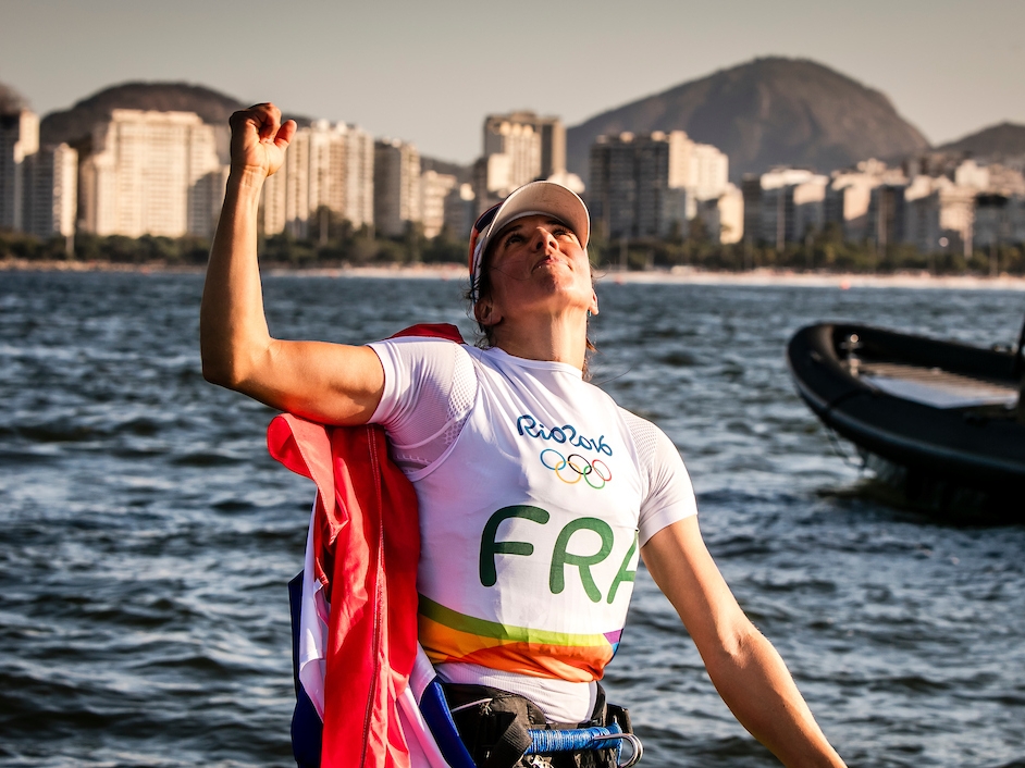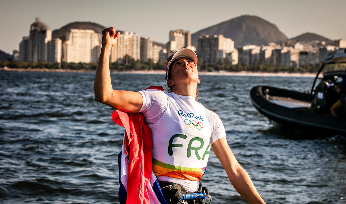 Charline Picon célèbre sa médaille d’or en planche à voile RS:X aux Jeux Olympiques de Rio 2016, arborant le drapeau français en bord de mer.