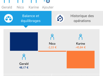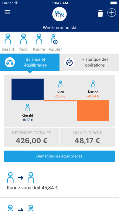 Capture d'écran de l'application Money Friends de Banque Populaire, montrant le suivi des dépenses et des remboursements entre amis lors d'un week-end au ski.