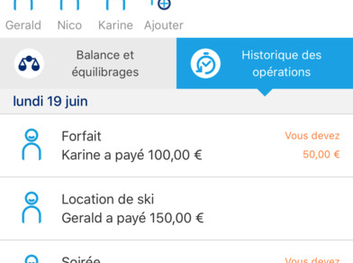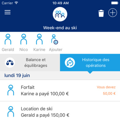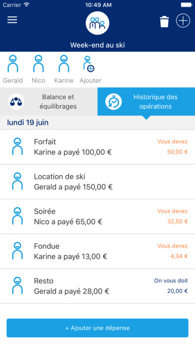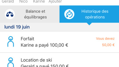 Capture d'écran de l'application Money Friends montrant la gestion et l’historique des dépenses partagées pour un groupe d'amis lors d'un week-end au ski.