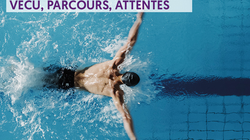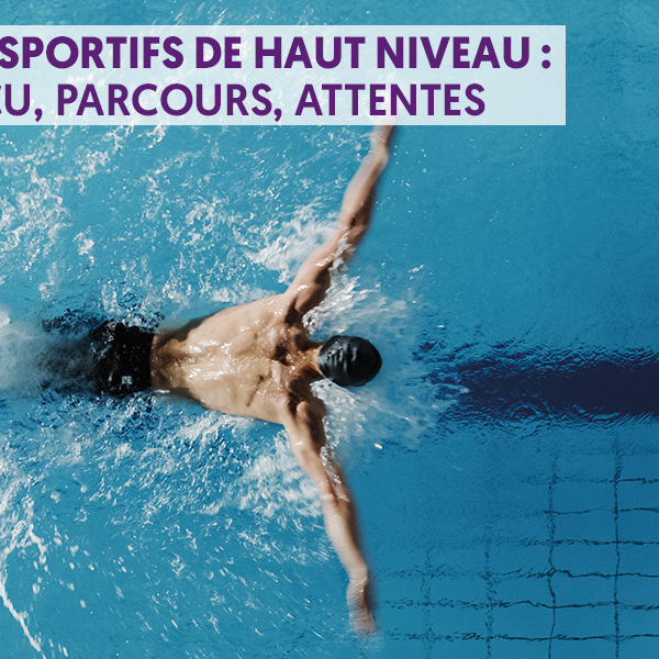 Vue aérienne d'un nageur effectuant une longueur en bassin avec le titre « Les sportifs de haut niveau : vécu, parcours, attentes » en surimpression.