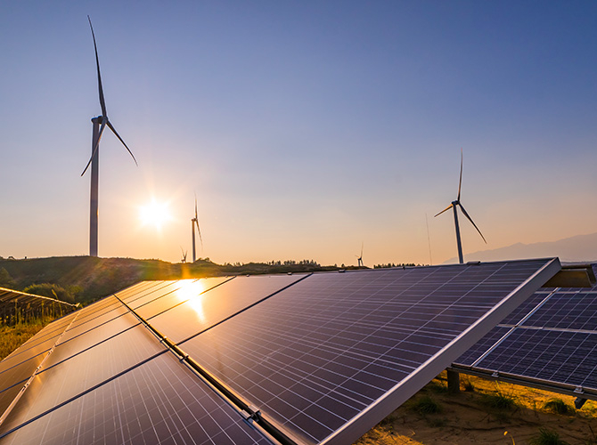 Paysage de panneaux solaires et d’éoliennes sous le soleil couchant, illustrant la production d’énergie verte et la transition énergétique vers les énergies renouvelables.